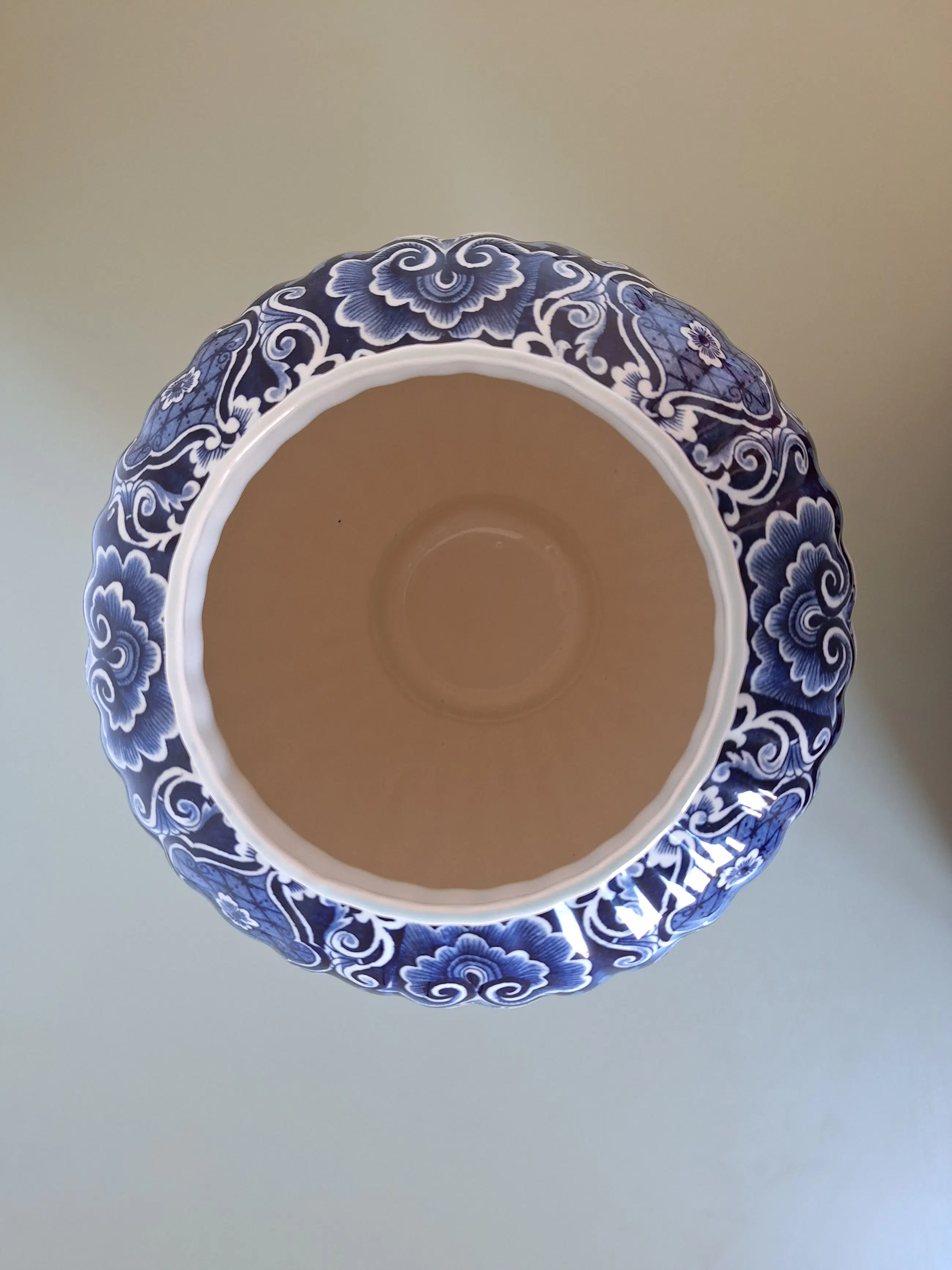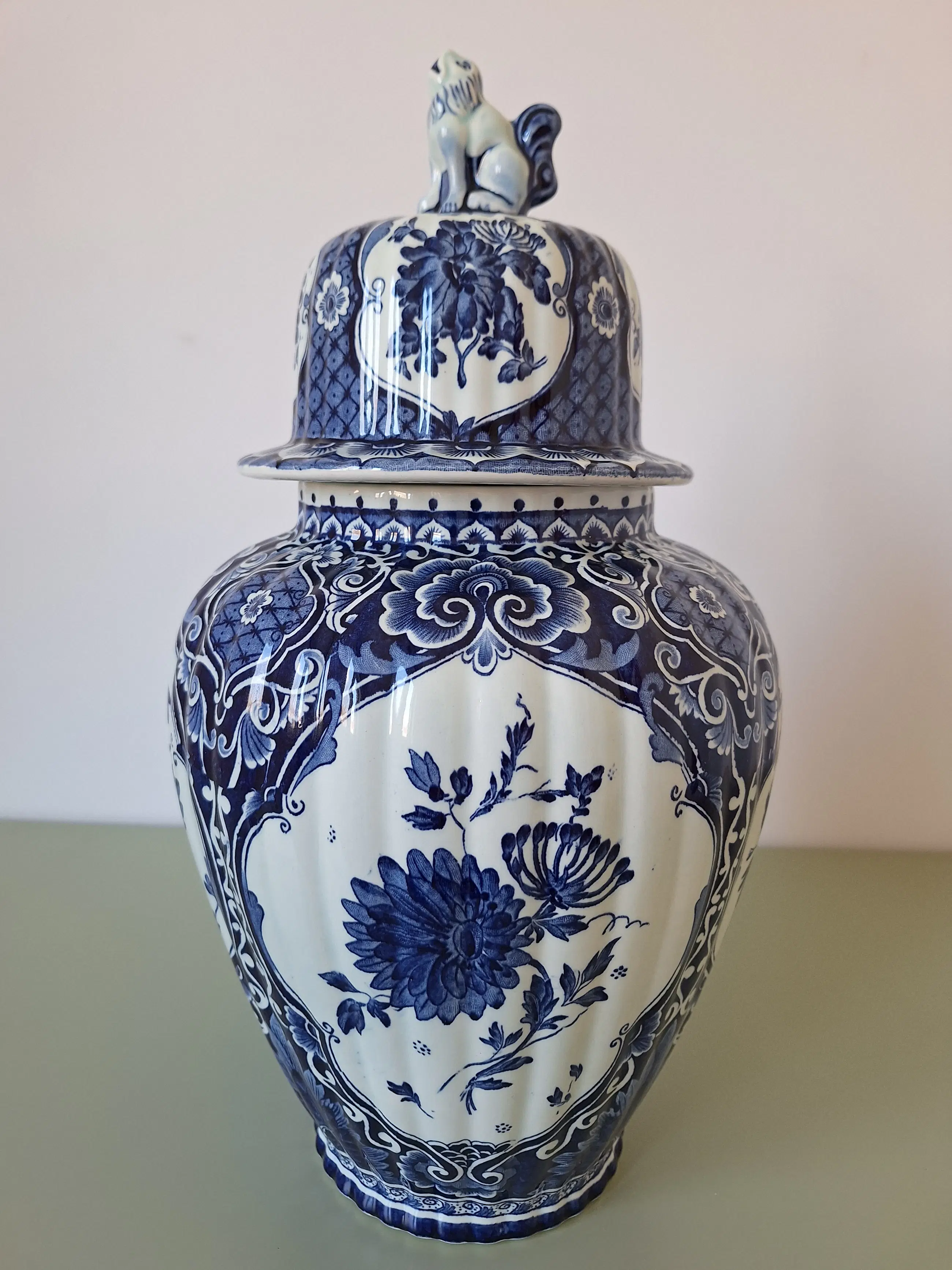 Royal Sphinx Petrus Regout Maastricht vaas met uitsparing, geïnspireerd op Delfts blauw, met florale motieven en capuchon. Maximaal. diameter. : 22 cm Vaasopening: 13 cm Hoogte kap: 16 cm