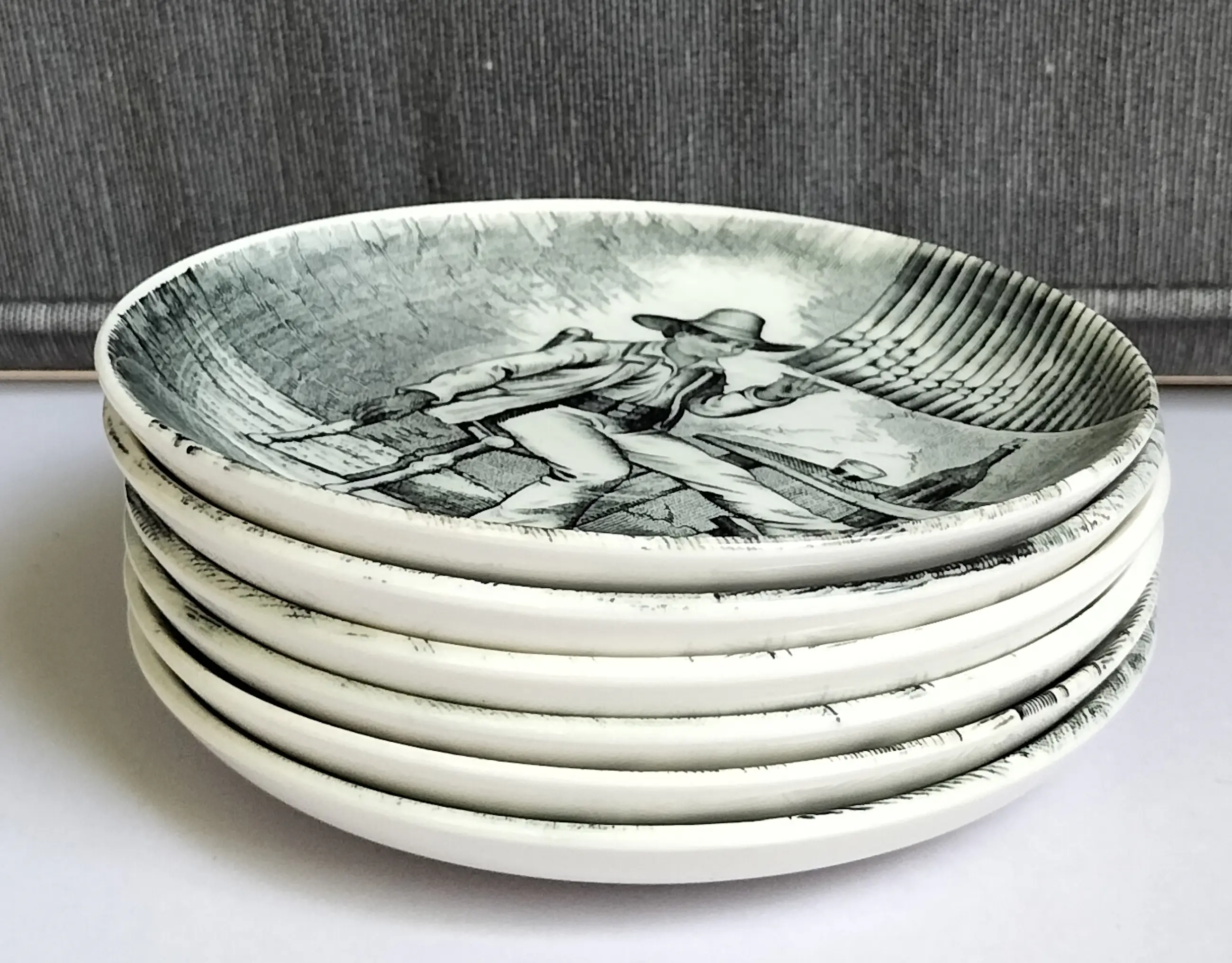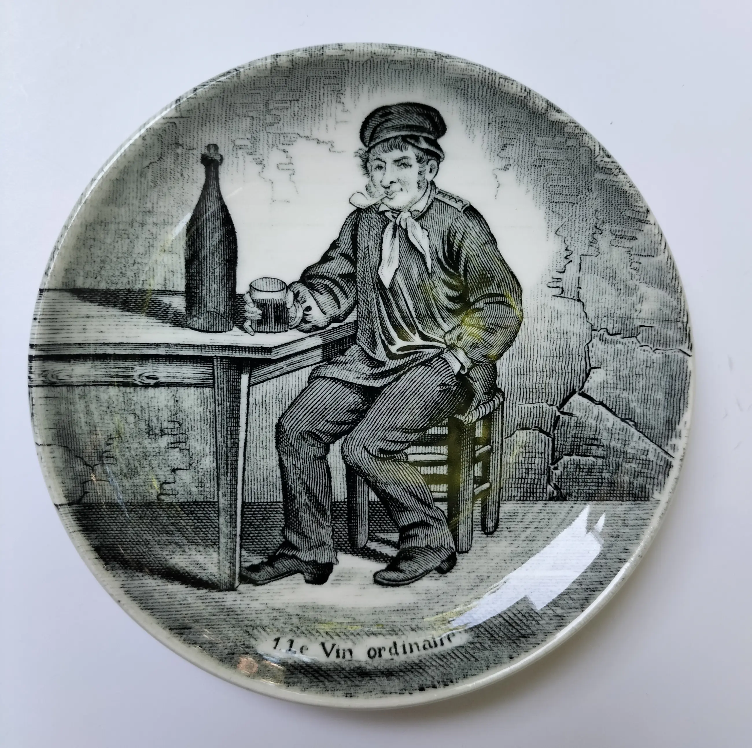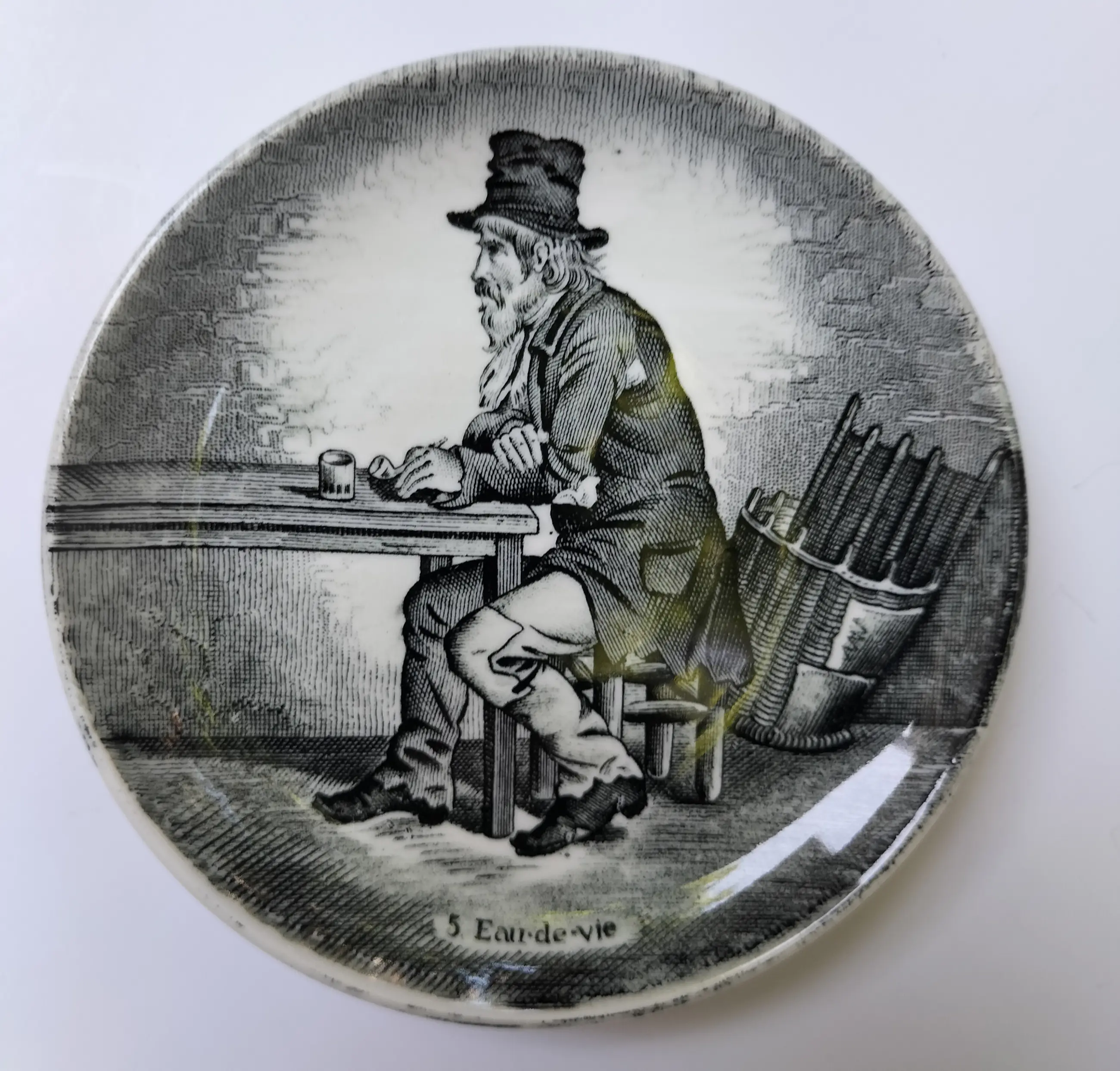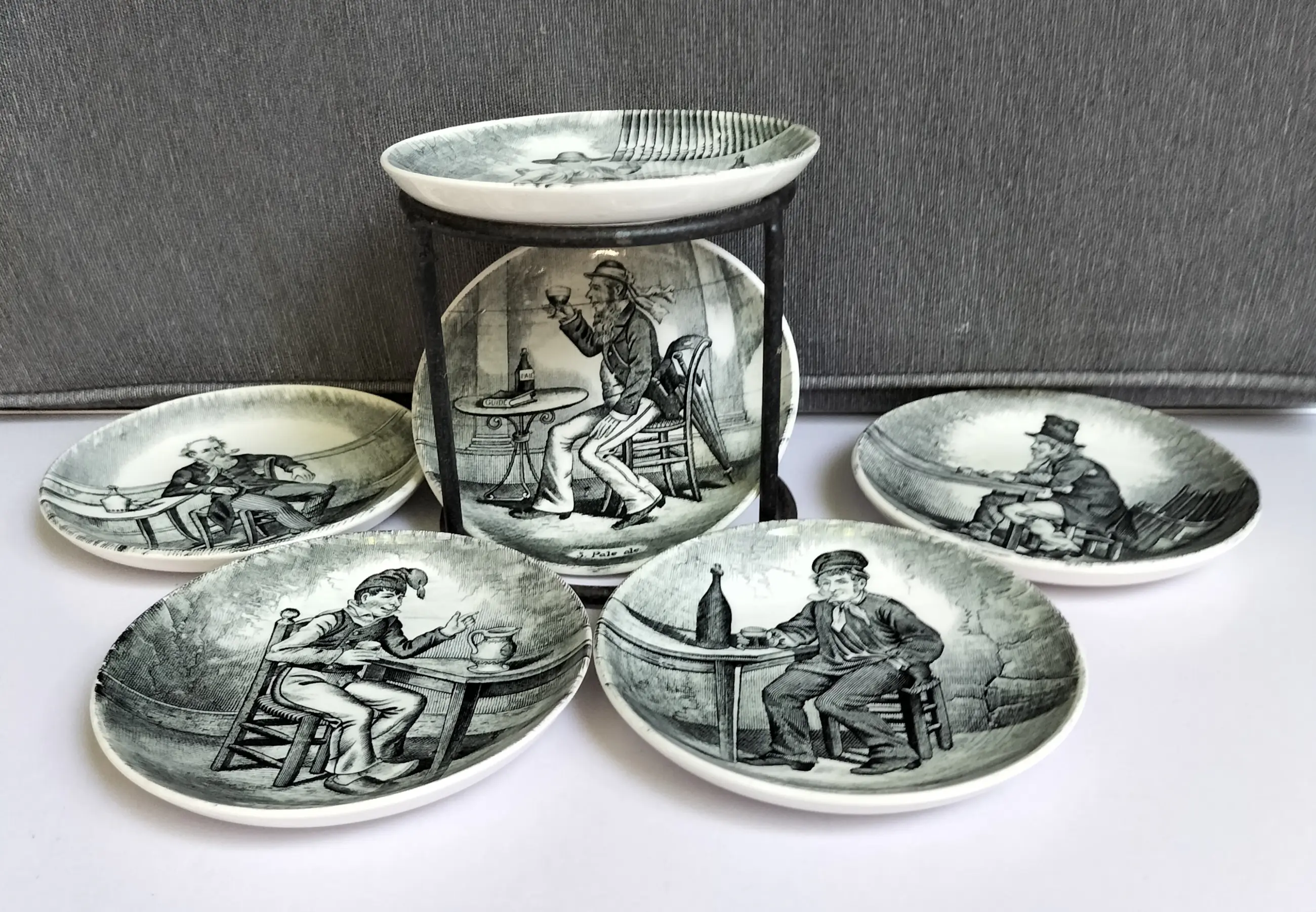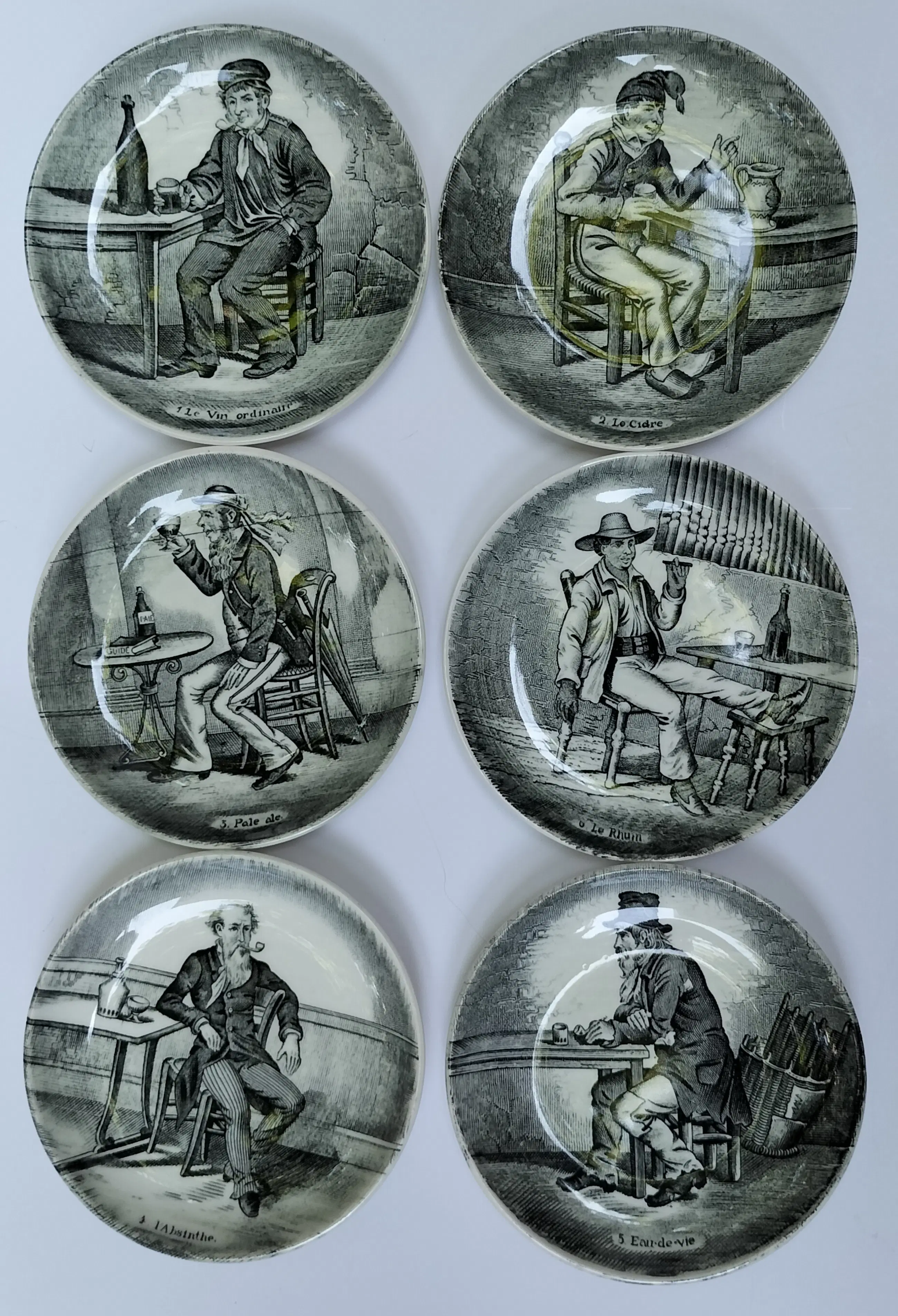 Een prachtige en complete set van zes zwart-witte/grijze keramische onderzetters (of kleine bordjes) van Royal Sphinx Maastricht uit de jaren 60. Ieder bordje heeft een andere afbeelding van een drinker met een drankje in een taveerne. De onderzetters/bordjes zijn genummerd van 1 t/m 6: 1. Le Vin - 2. Le Cidre - 3. Pale Ale - 4. l'Absint - 5. Eau de Vie - 6. Le Rhum. Alle bordjes zijn in uitstekende staat zonder beschadigingen, chips of krassen; ze lijken nauwelijks gebruikt. Het gewicht per bordje verschilt, dus is het totaalgewicht ingevuld. Onderop zijn de bordjes gemerkt met o.a. de bekende afbeelding van de Sphinx. Een bijzondere set, die uiteraard met zorg verpakt en verzonden zal worden.
