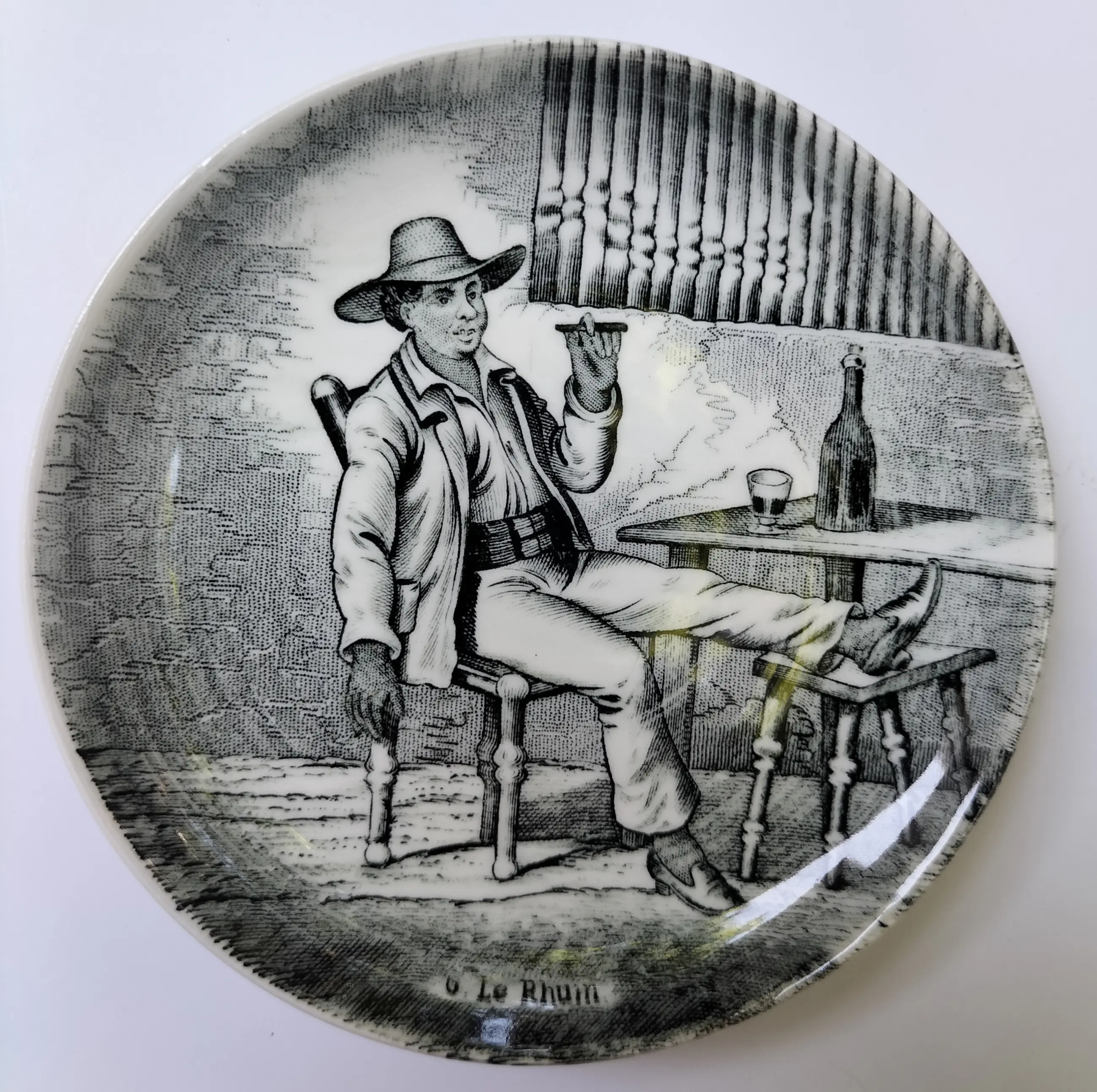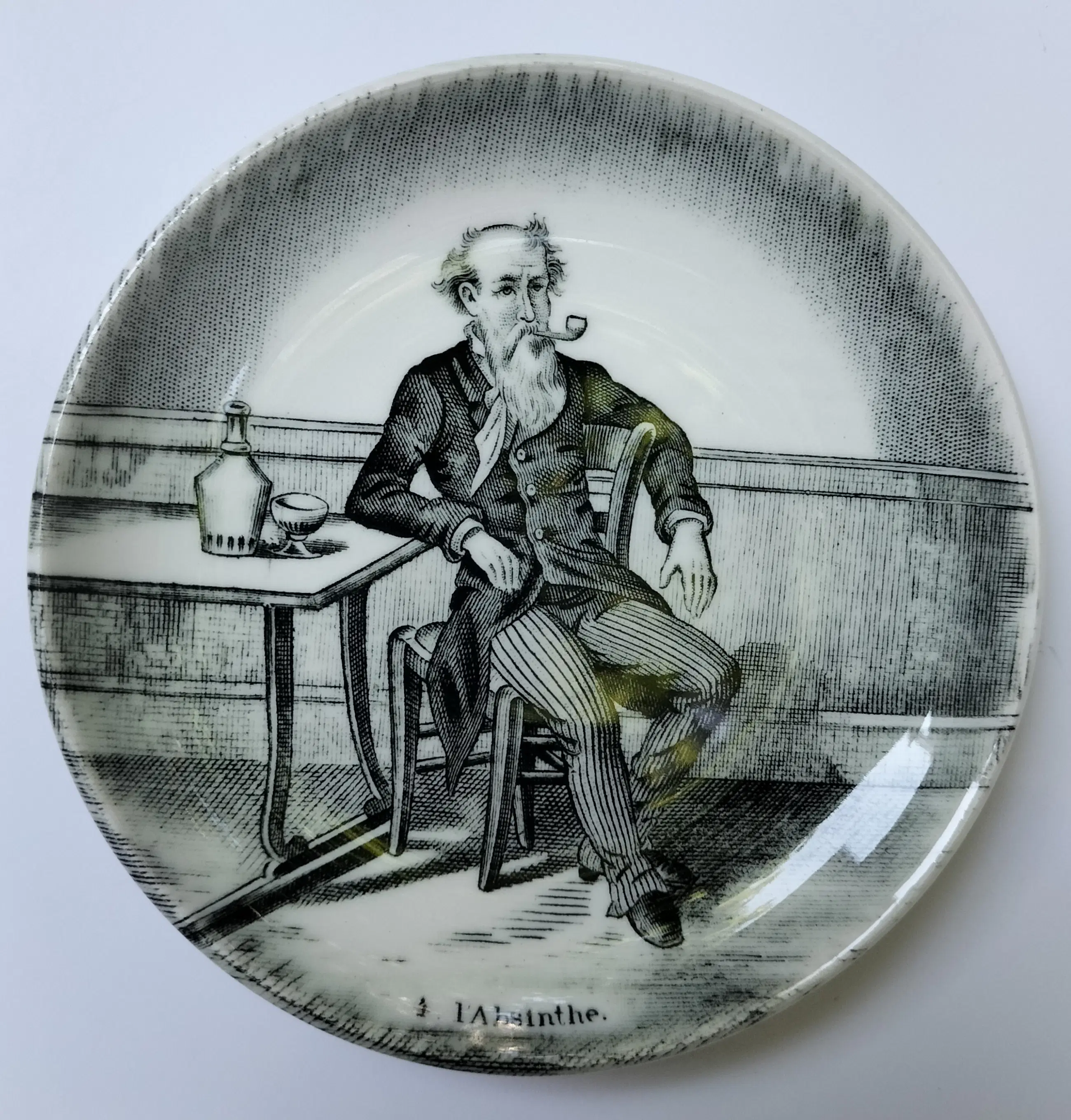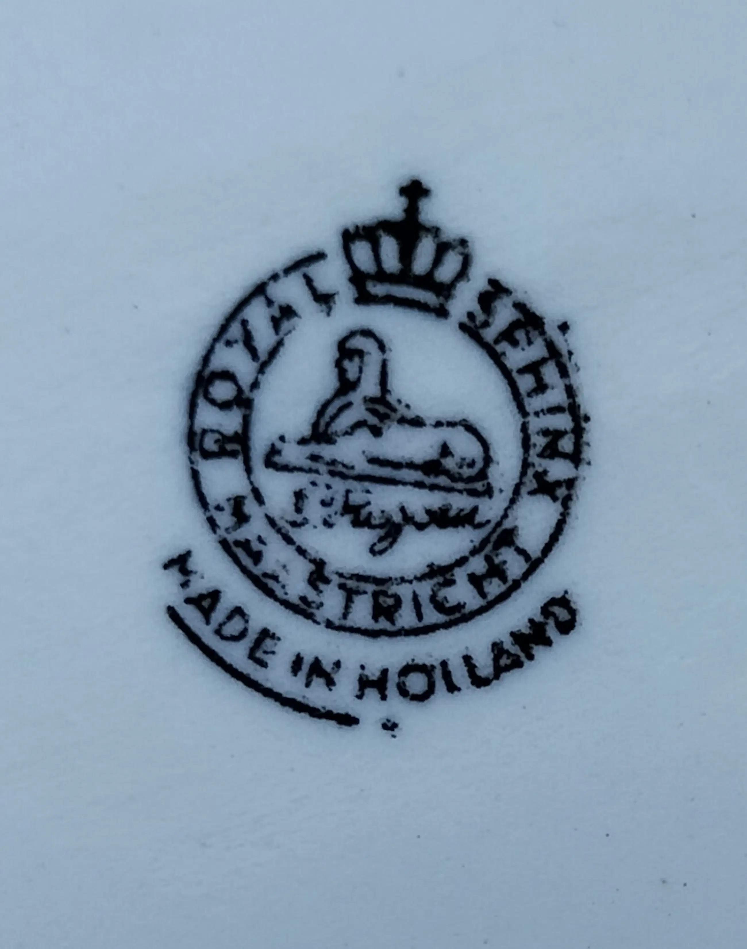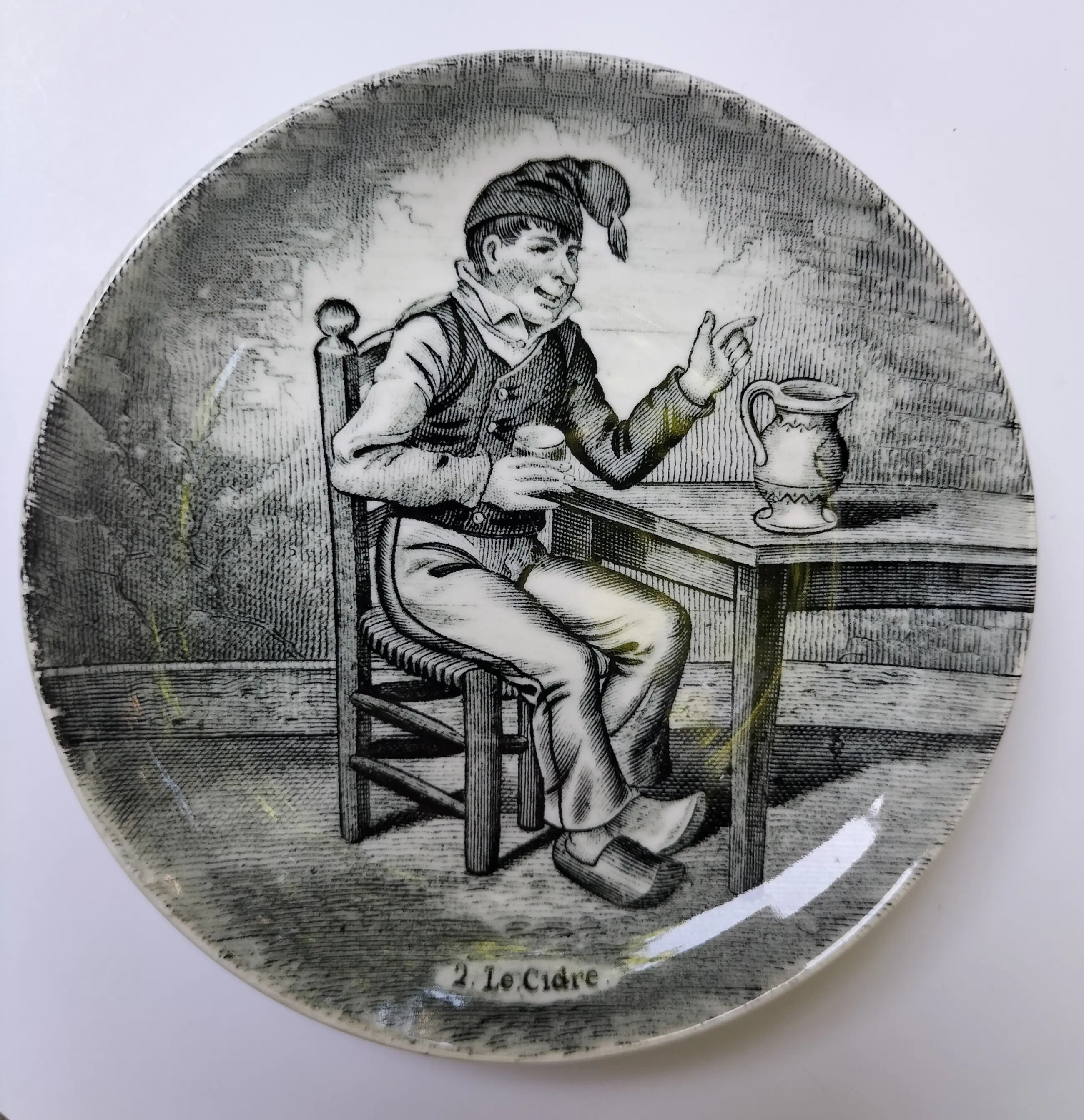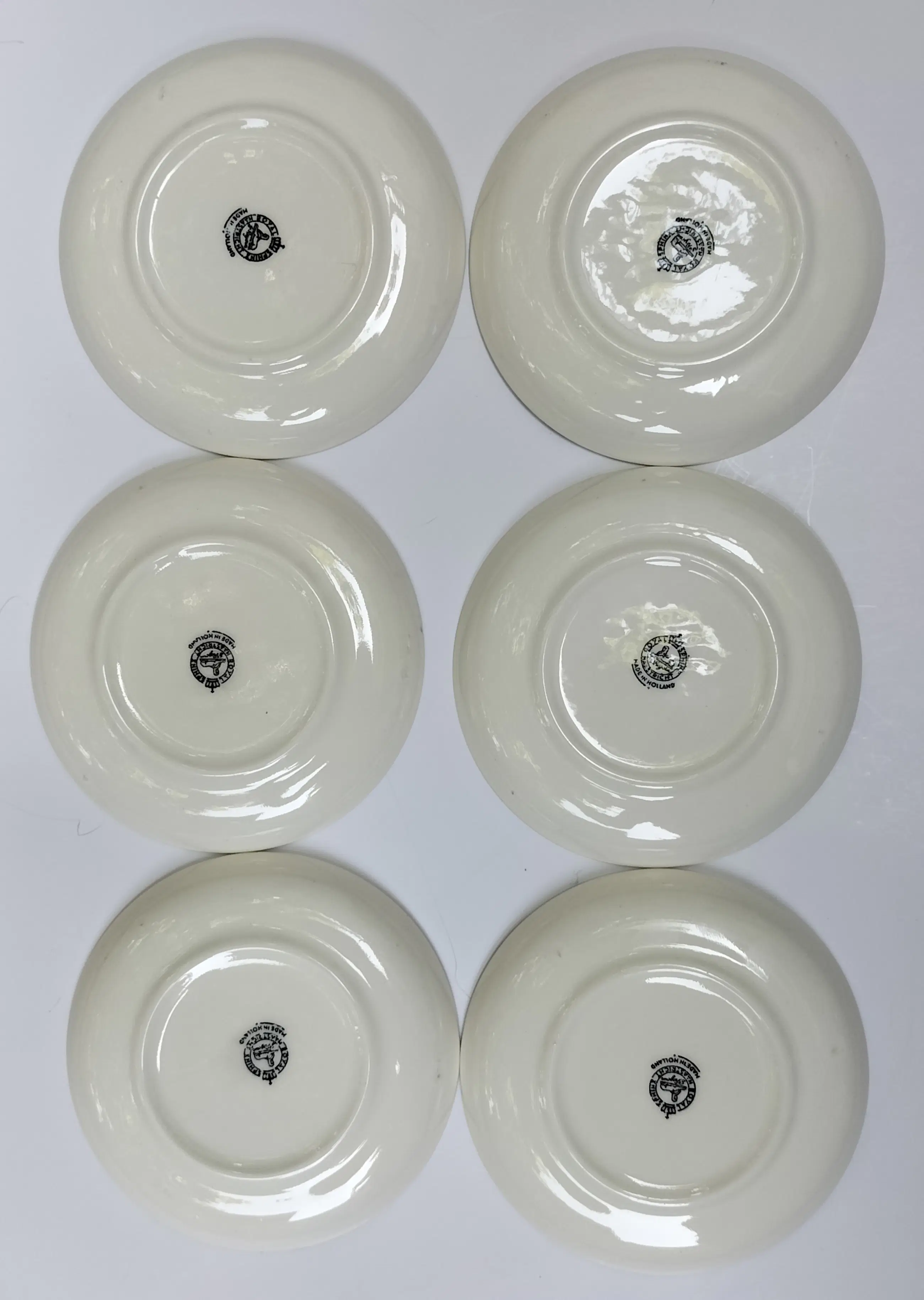 Een prachtige en complete set van zes zwart-witte/grijze keramische onderzetters (of kleine bordjes) van Royal Sphinx Maastricht uit de jaren 60. Ieder bordje heeft een andere afbeelding van een drinker met een drankje in een taveerne. De onderzetters/bordjes zijn genummerd van 1 t/m 6: 1. Le Vin - 2. Le Cidre - 3. Pale Ale - 4. l'Absint - 5. Eau de Vie - 6. Le Rhum. Alle bordjes zijn in uitstekende staat zonder beschadigingen, chips of krassen; ze lijken nauwelijks gebruikt. Het gewicht per bordje verschilt, dus is het totaalgewicht ingevuld. Onderop zijn de bordjes gemerkt met o.a. de bekende afbeelding van de Sphinx. Een bijzondere set, die uiteraard met zorg verpakt en verzonden zal worden.