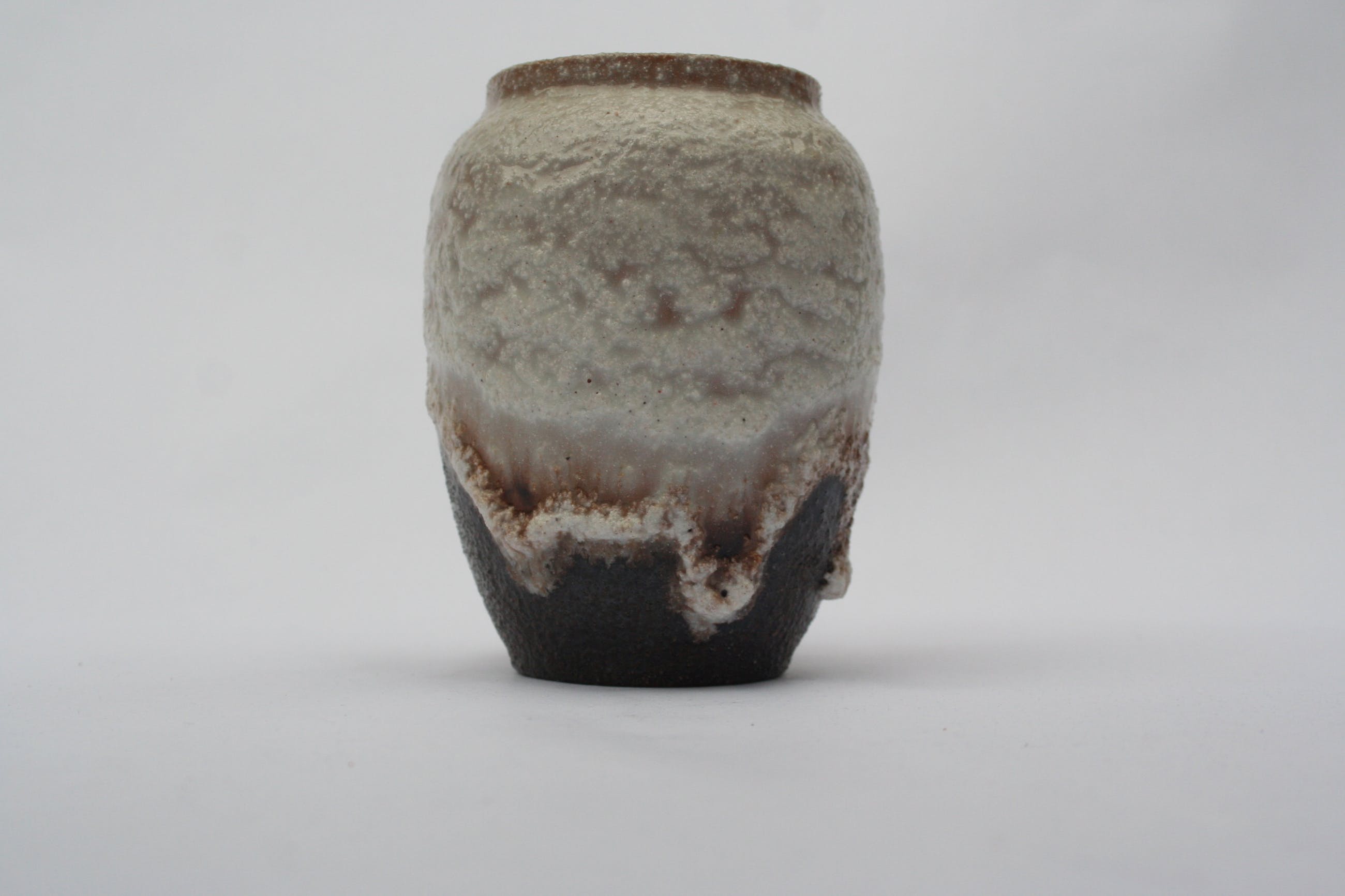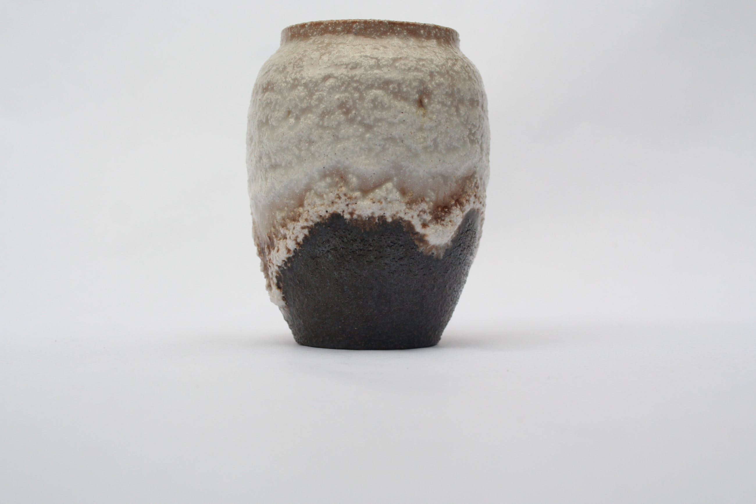 Fraai vaasje van atelier de Steenuil, bruin en gebroken wit. Dik glazuur, vaak fatlava genoemd. Gemerkt met de uil van het atelier aan de onderzijde, in de klei nog voor het bakken aangebracht. Wordt goed verpakt verzonden.