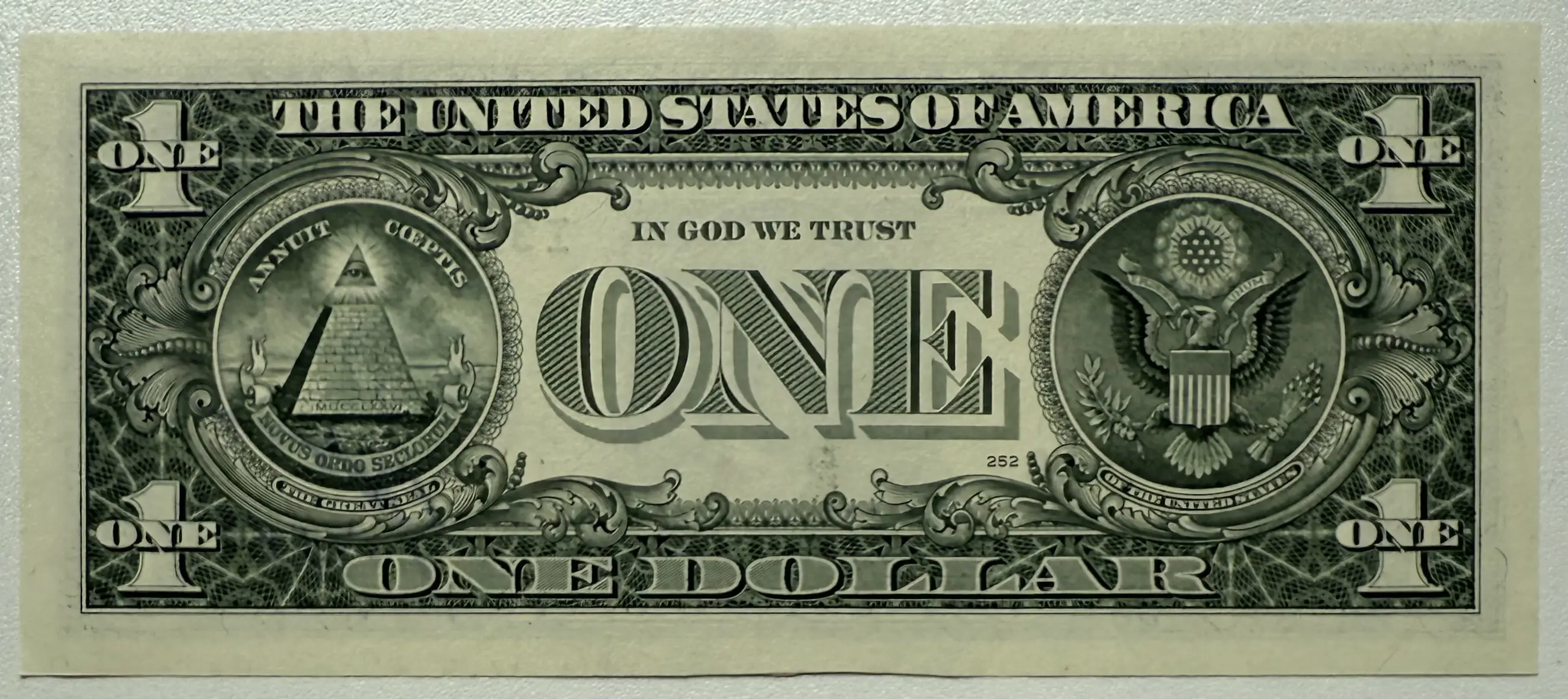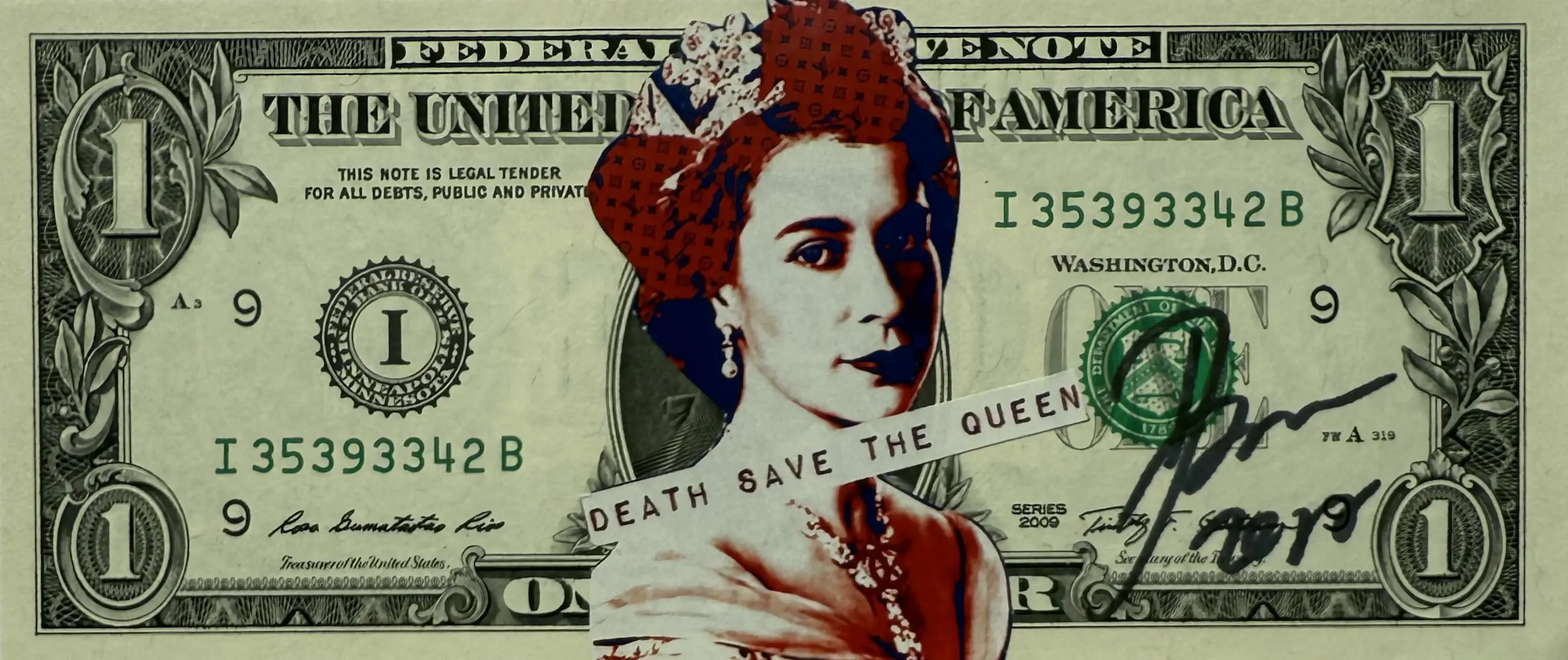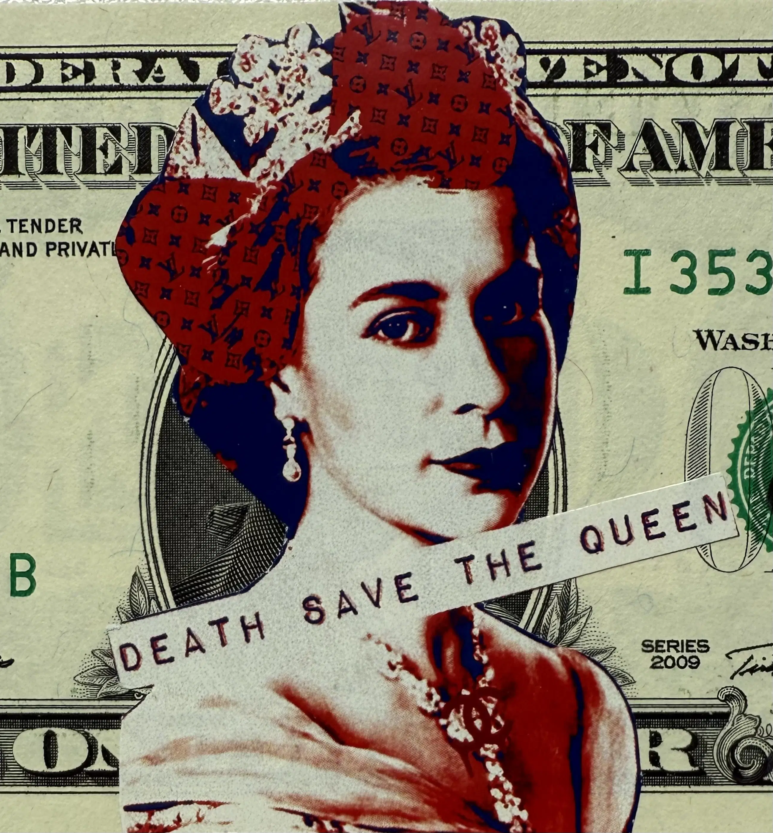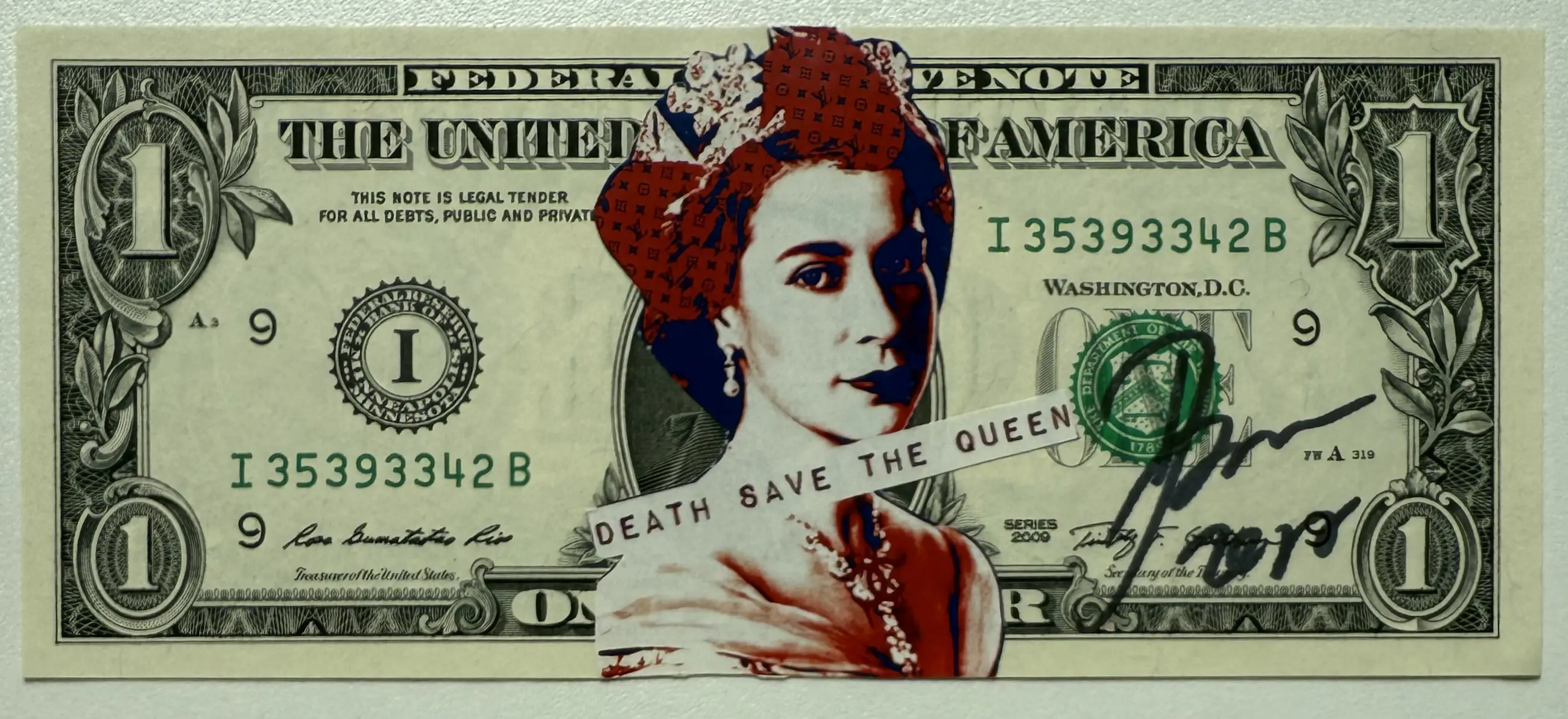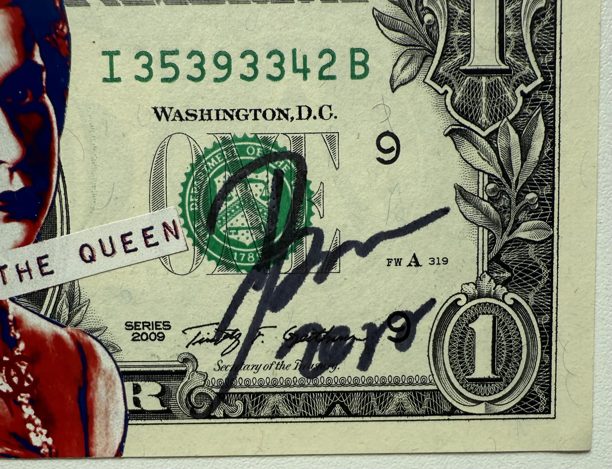 Uniek werk op een échte Amerikaanse Dollar. Het werk is gemaakt met collage. Aan de voorzijde gesigneerd en gedateerd.