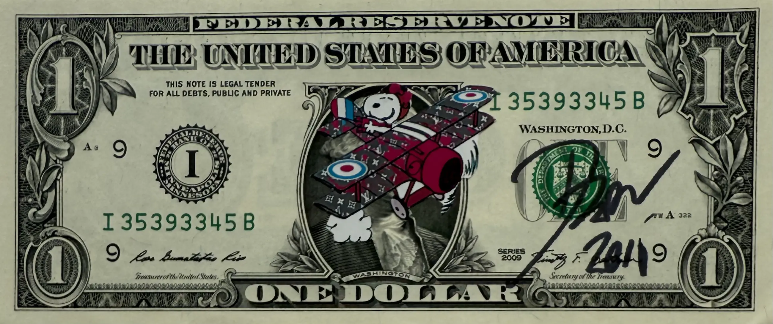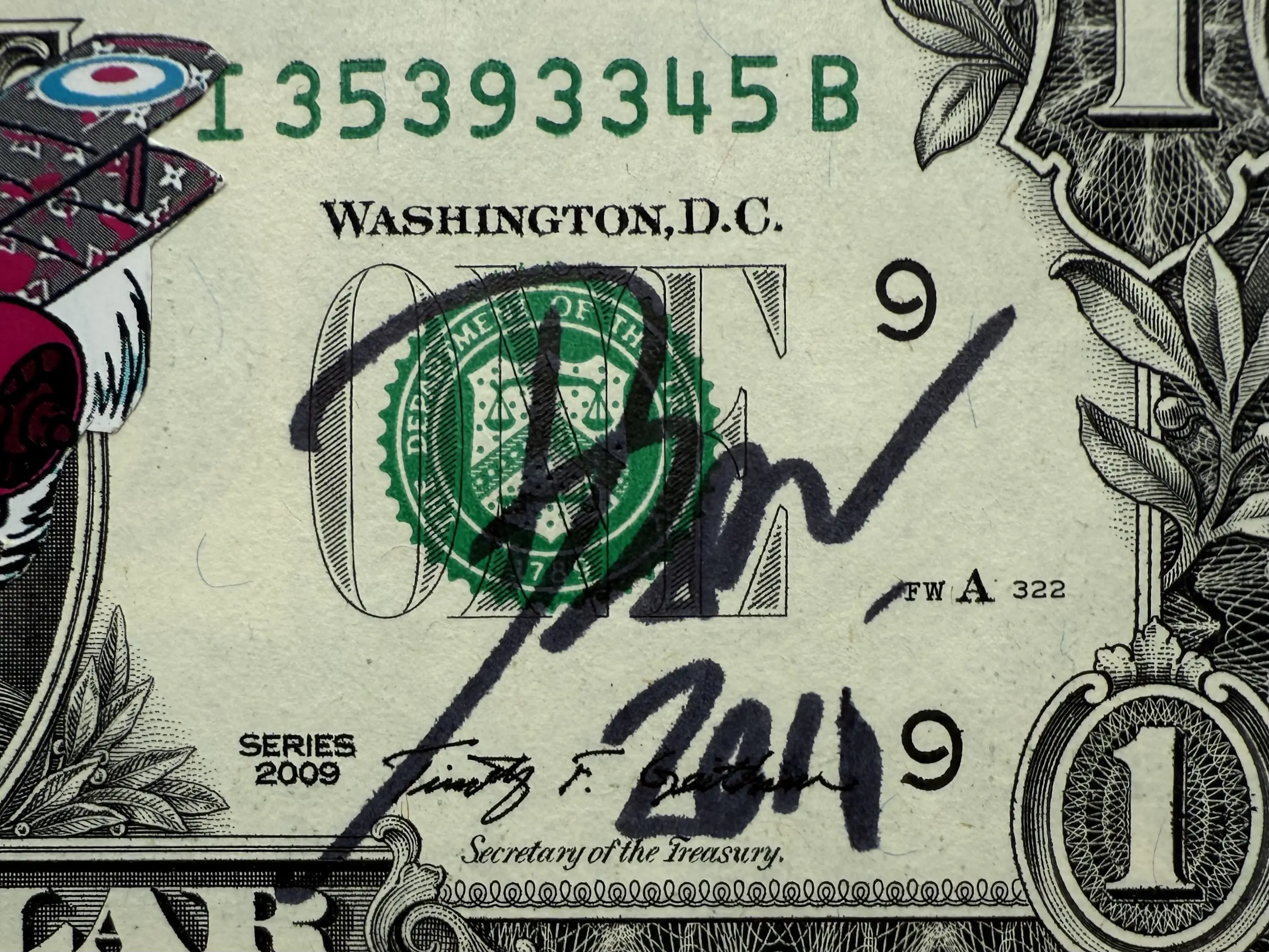 Uniek werk op een échte Amerikaanse Dollar. Het werk is gemaakt met collage. Aan de voorzijde gesigneerd en gedateerd.