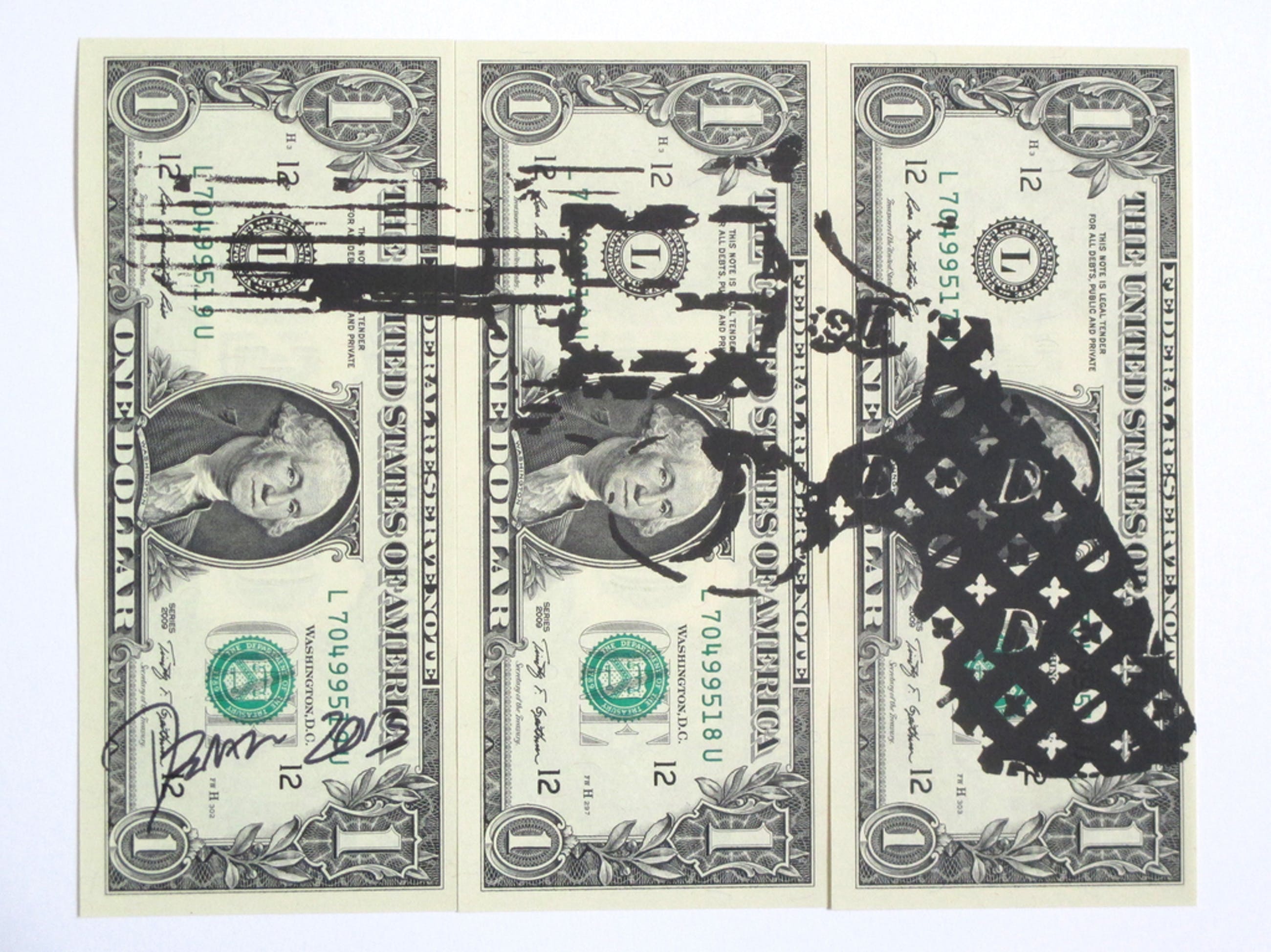 GUN- Drie originele 'street-art' dollar biljetten, 2013, gesigneerd, met COA