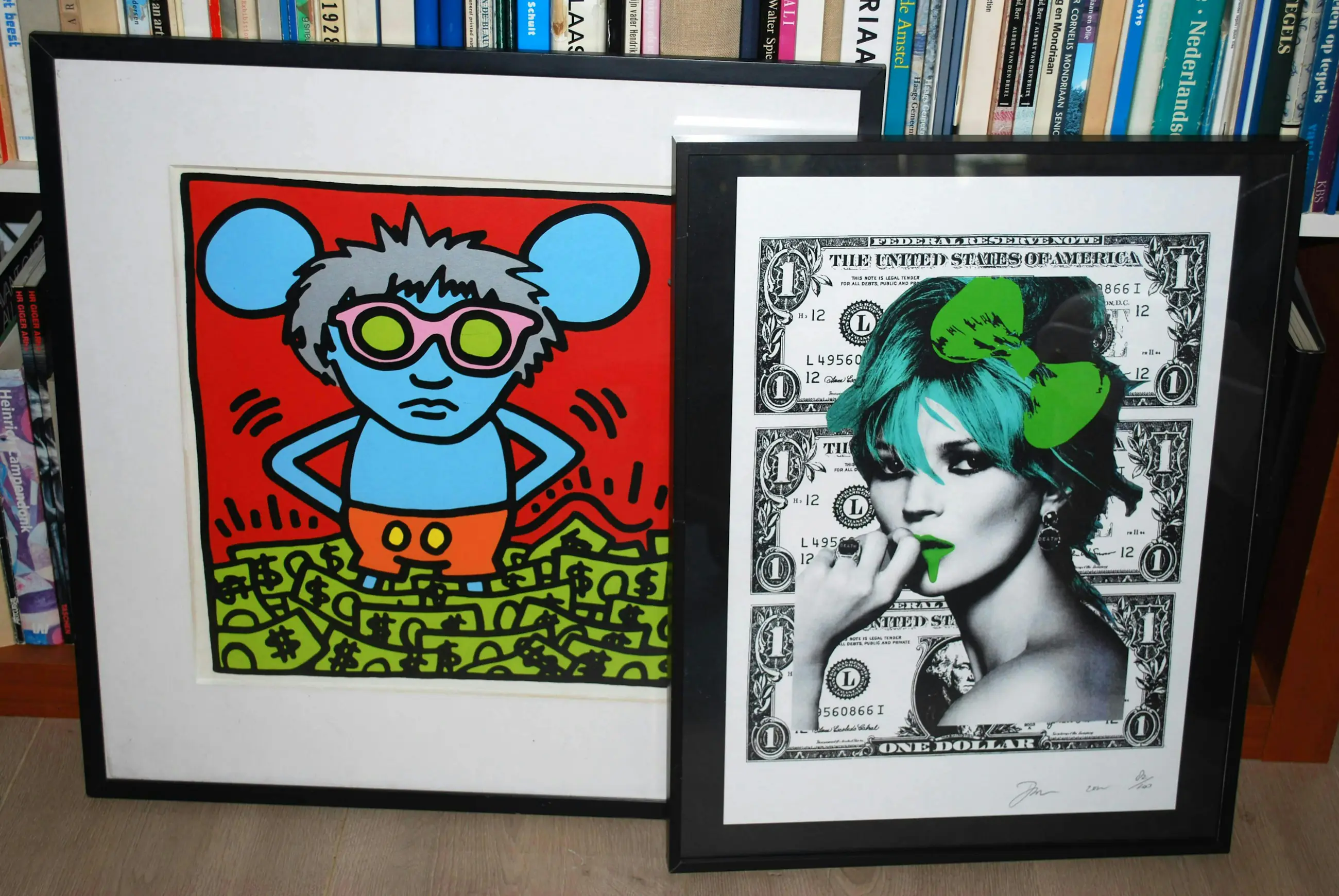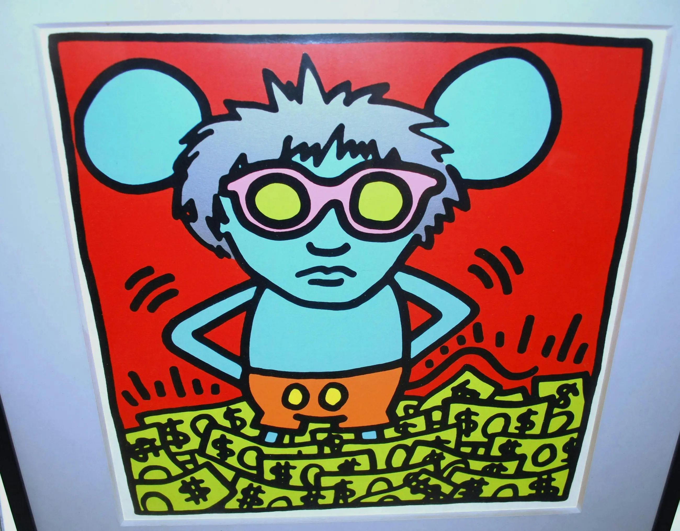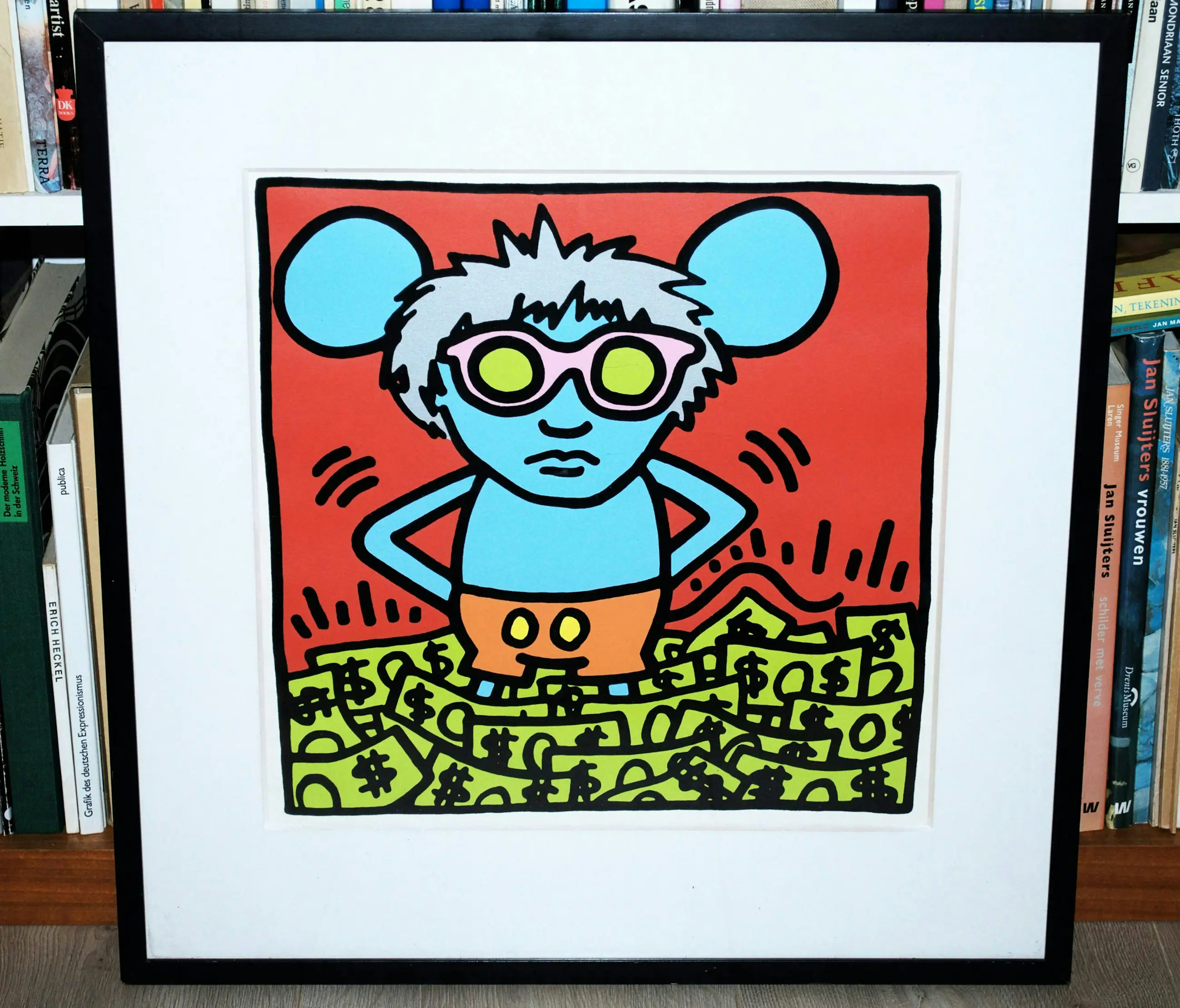 - Extra: zeer mooie kwaliteit zeefdruk 'Andy Mouse' door/naar Keith Haring. Deze zeefdruk zal onderdeel zijn geweest van een vierluik. Beeldmaat 35/35 cm. Bladmaat ca. 38/38 cm. Achter een diep passepartout en glas. In een zwarte houten lijst. 54/53 cm.