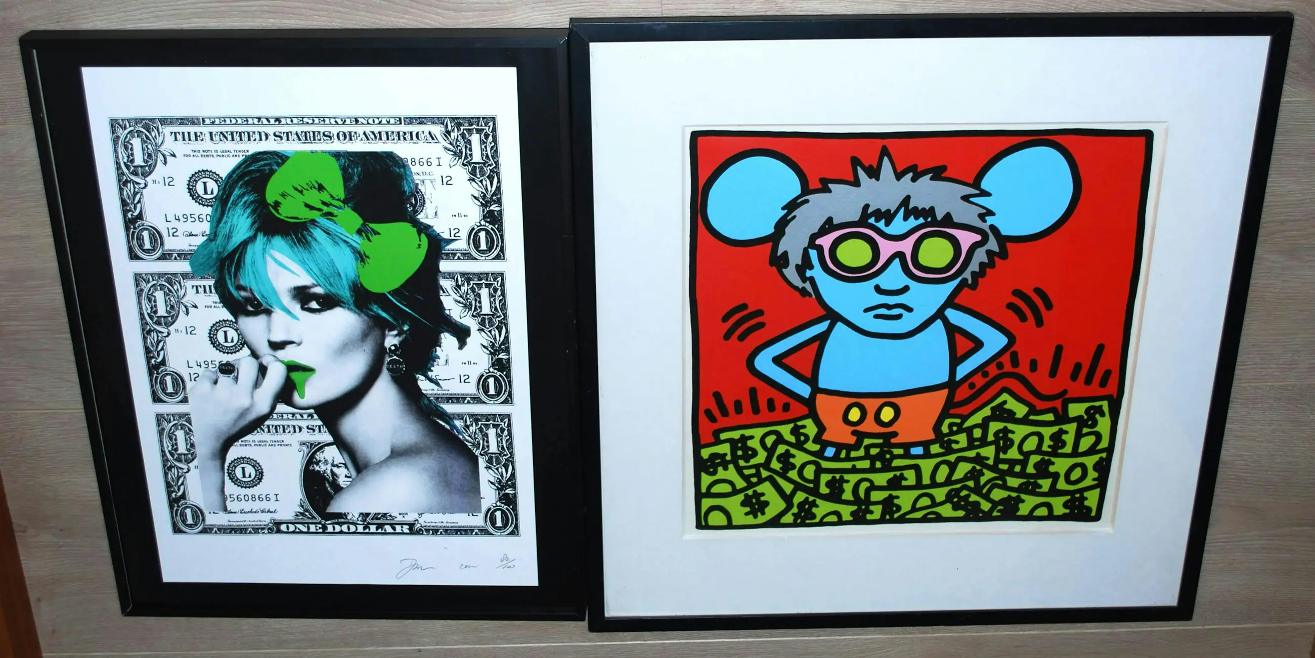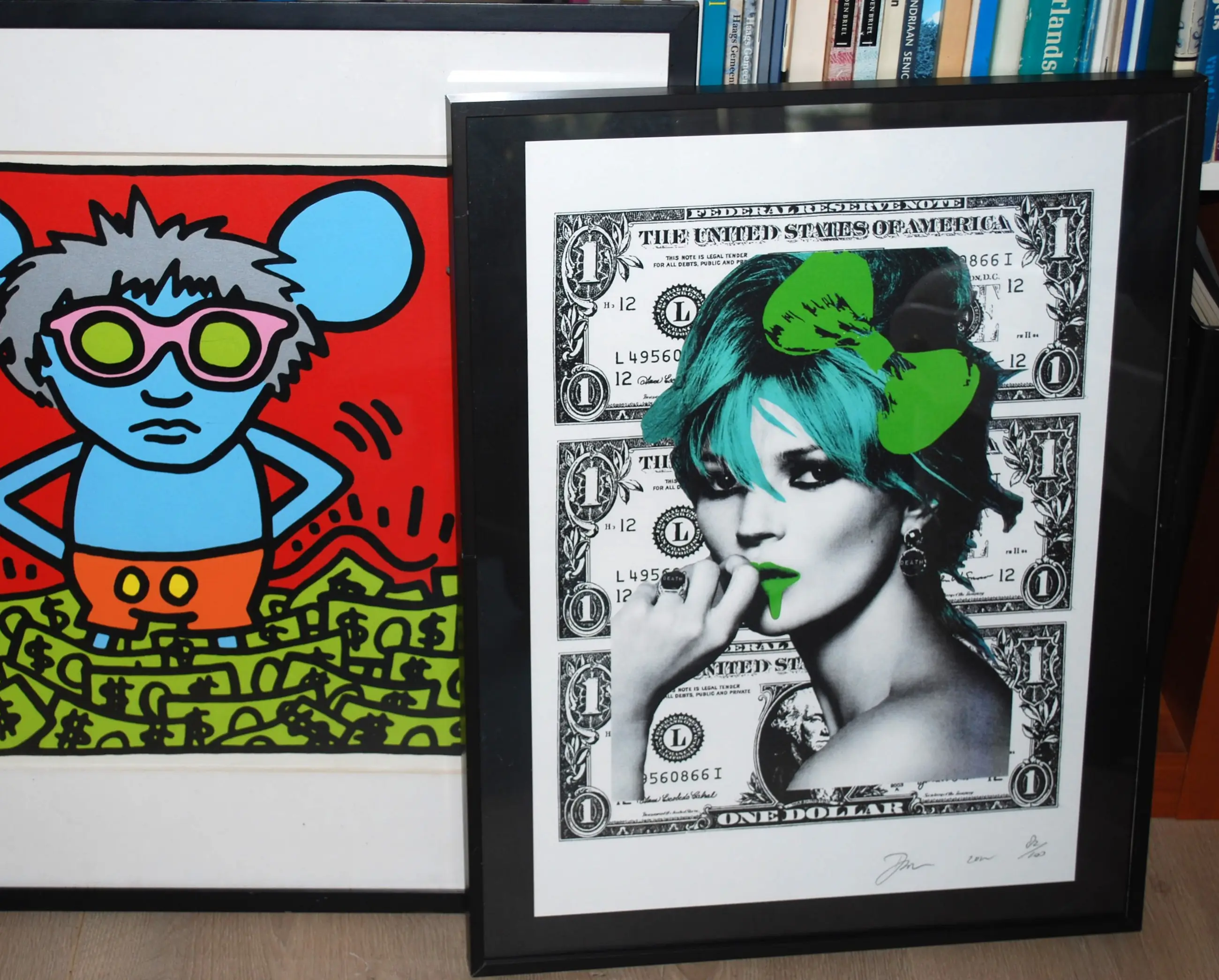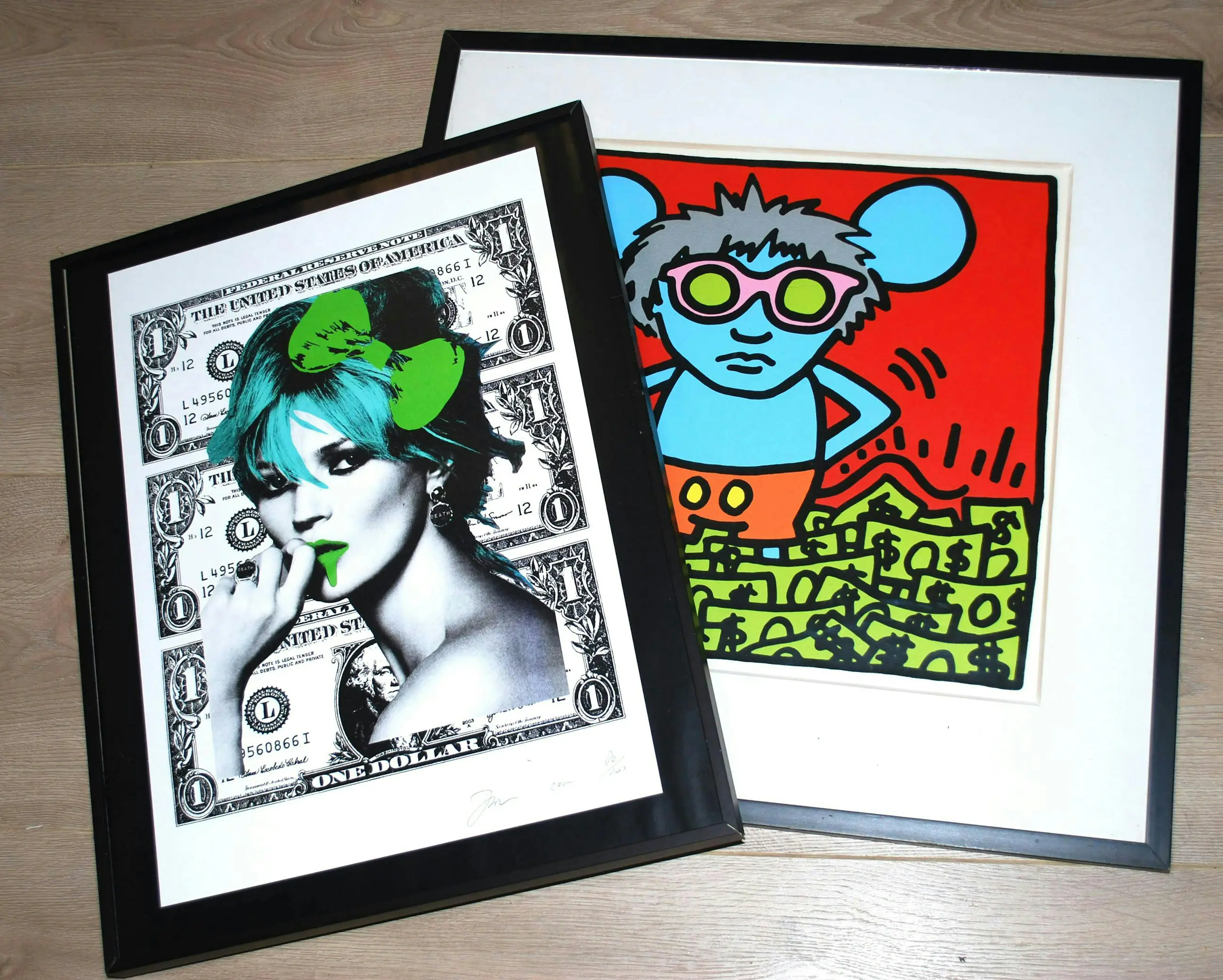 - Extra: zeer mooie kwaliteit zeefdruk 'Andy Mouse' door/naar Keith Haring. Deze zeefdruk zal onderdeel zijn geweest van een vierluik. Beeldmaat 35/35 cm. Bladmaat ca. 38/38 cm. Achter een diep passepartout en glas. In een zwarte houten lijst. 54/53 cm.