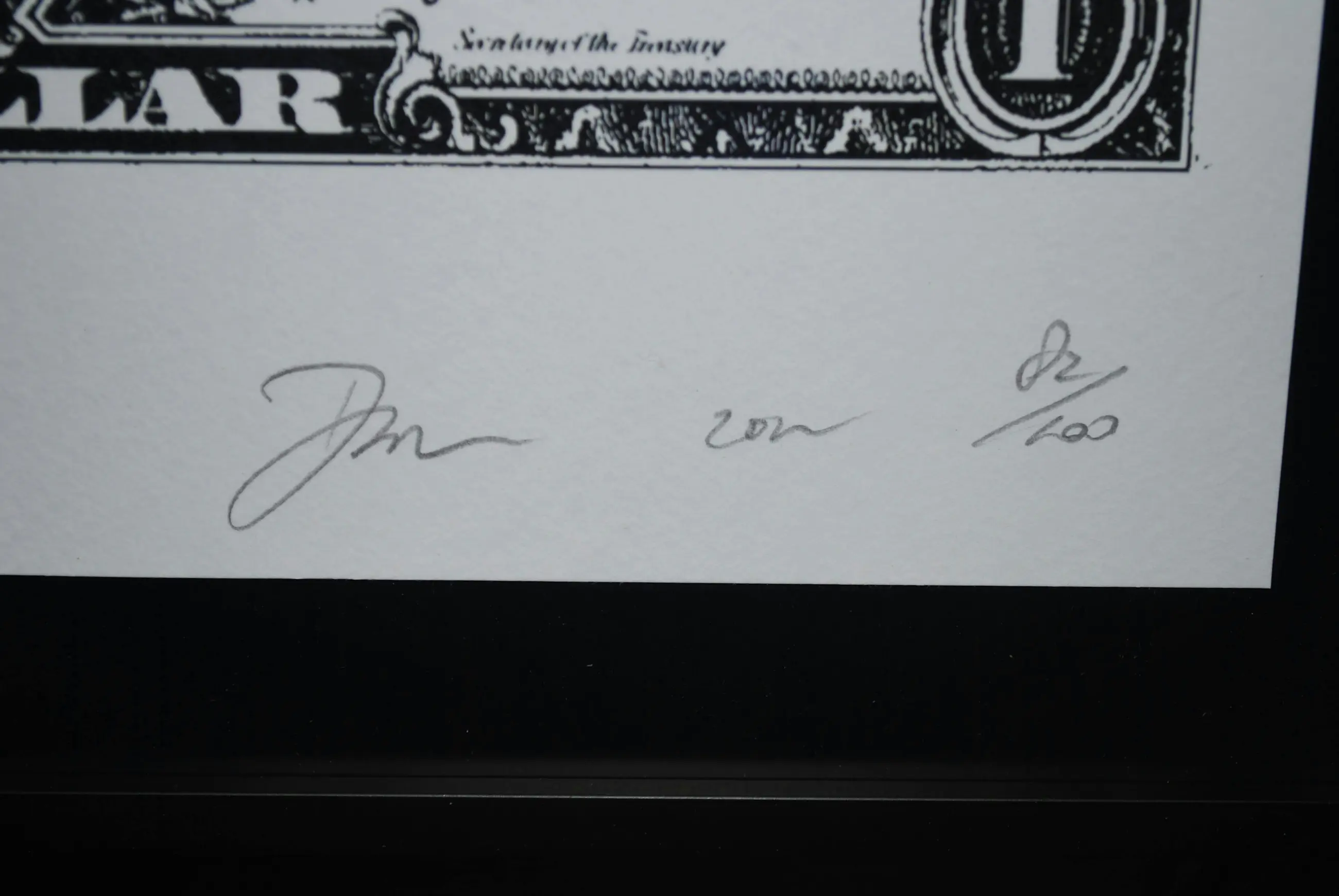 - Zeefdruk op papier, licht bevestigd op zwart papier. Achter glas in een zwarte alu lijst. Gesigneerd en genummerd 82/100 r.o.