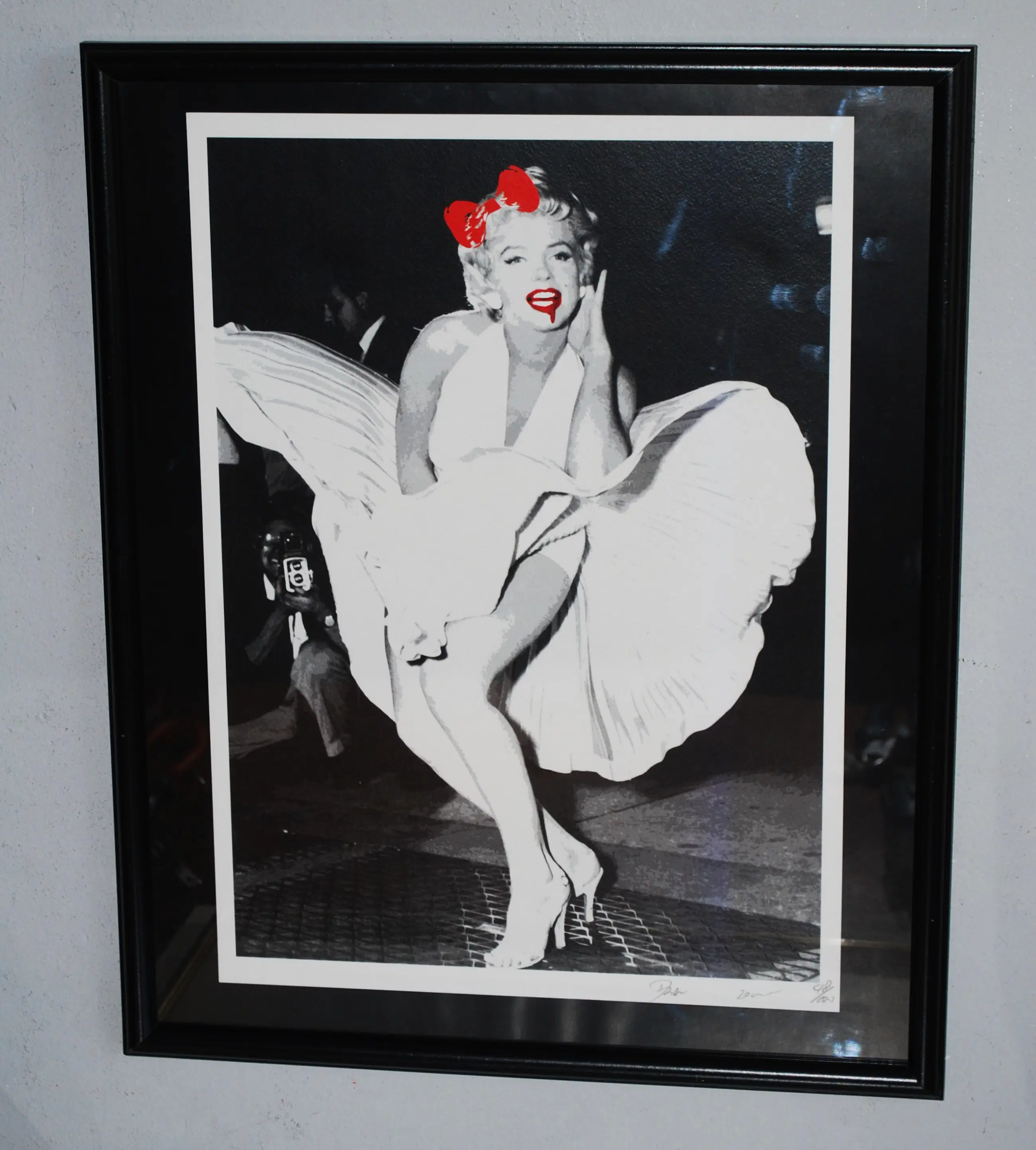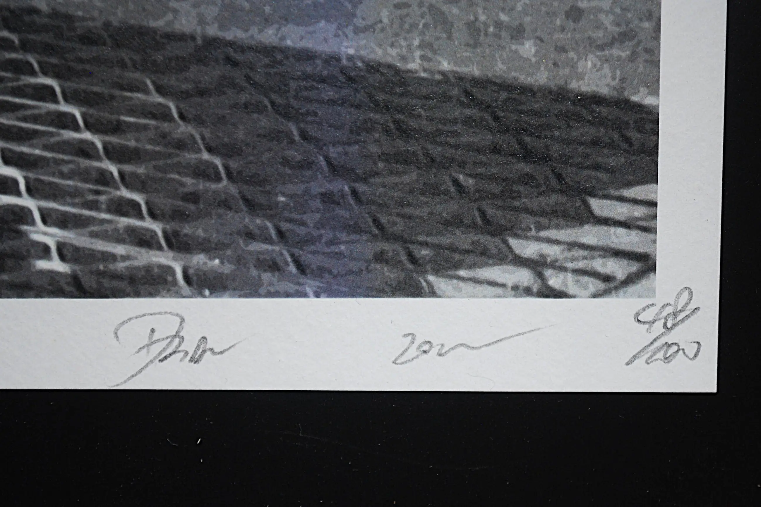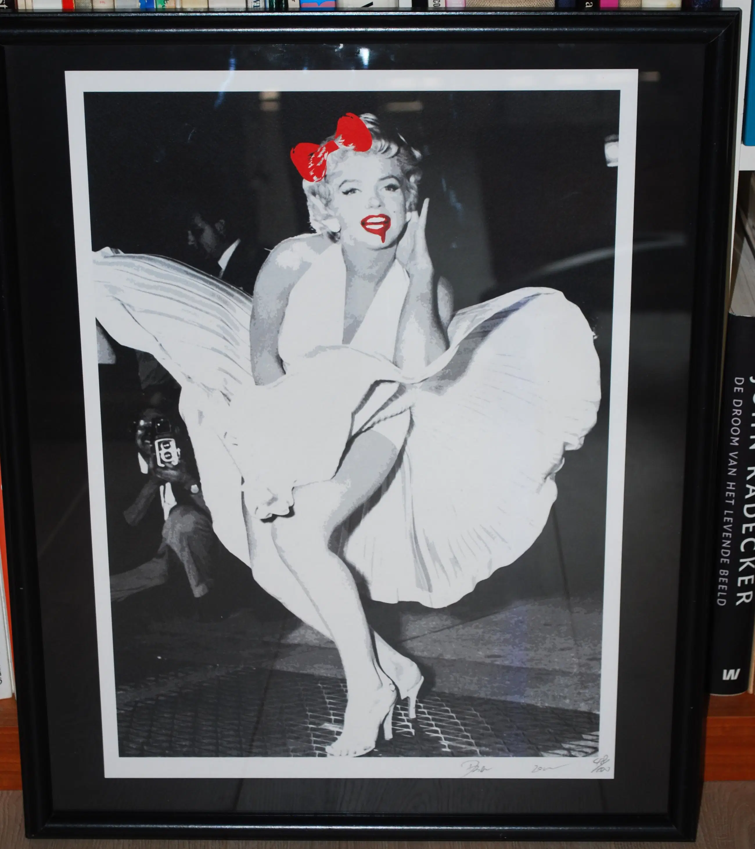 Mooie kwaliteit zeefdruk op zeer stevig papier, licht bevestigd op zwart papier. Achter glas in een zwarte houten lijst. Met potlood gesigneerd en genummerd 48/100 . Het jaartal zal ca. 2015 zijn. (Het glas reflecteert enigszins op de foto's)
