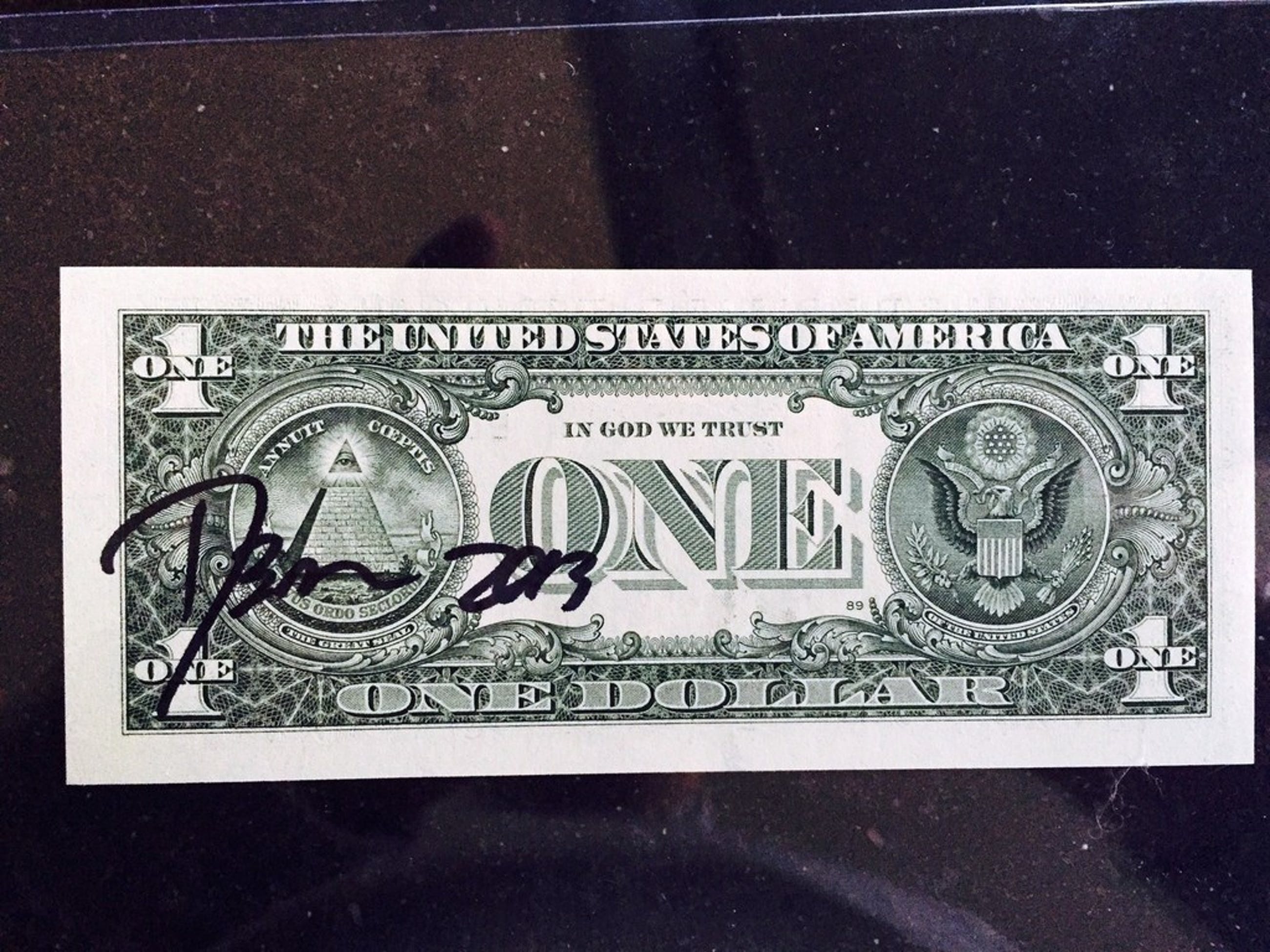 Aangeboden een gesigneerd origineel "street-art" werk op een echt dollarbiljet.