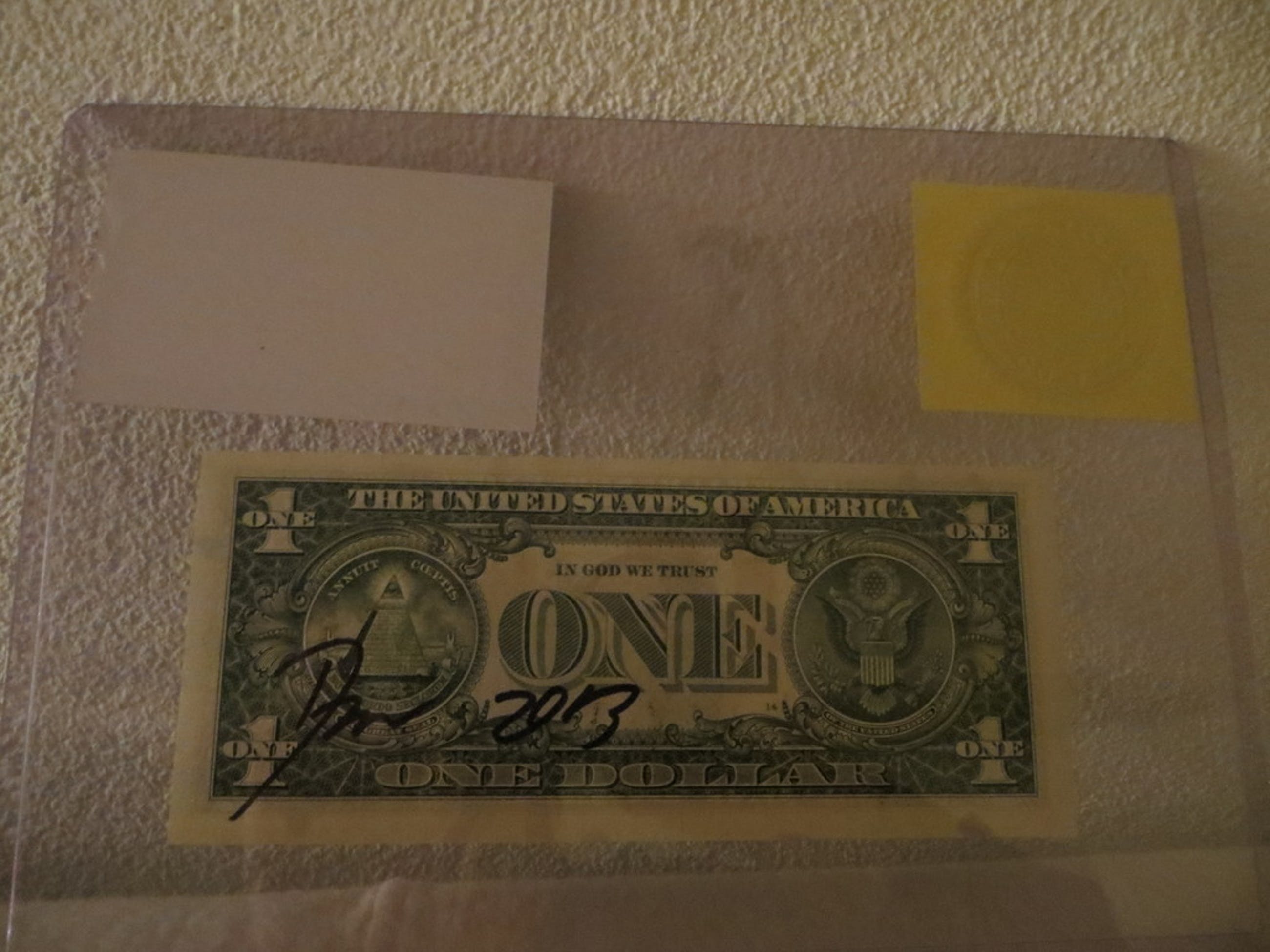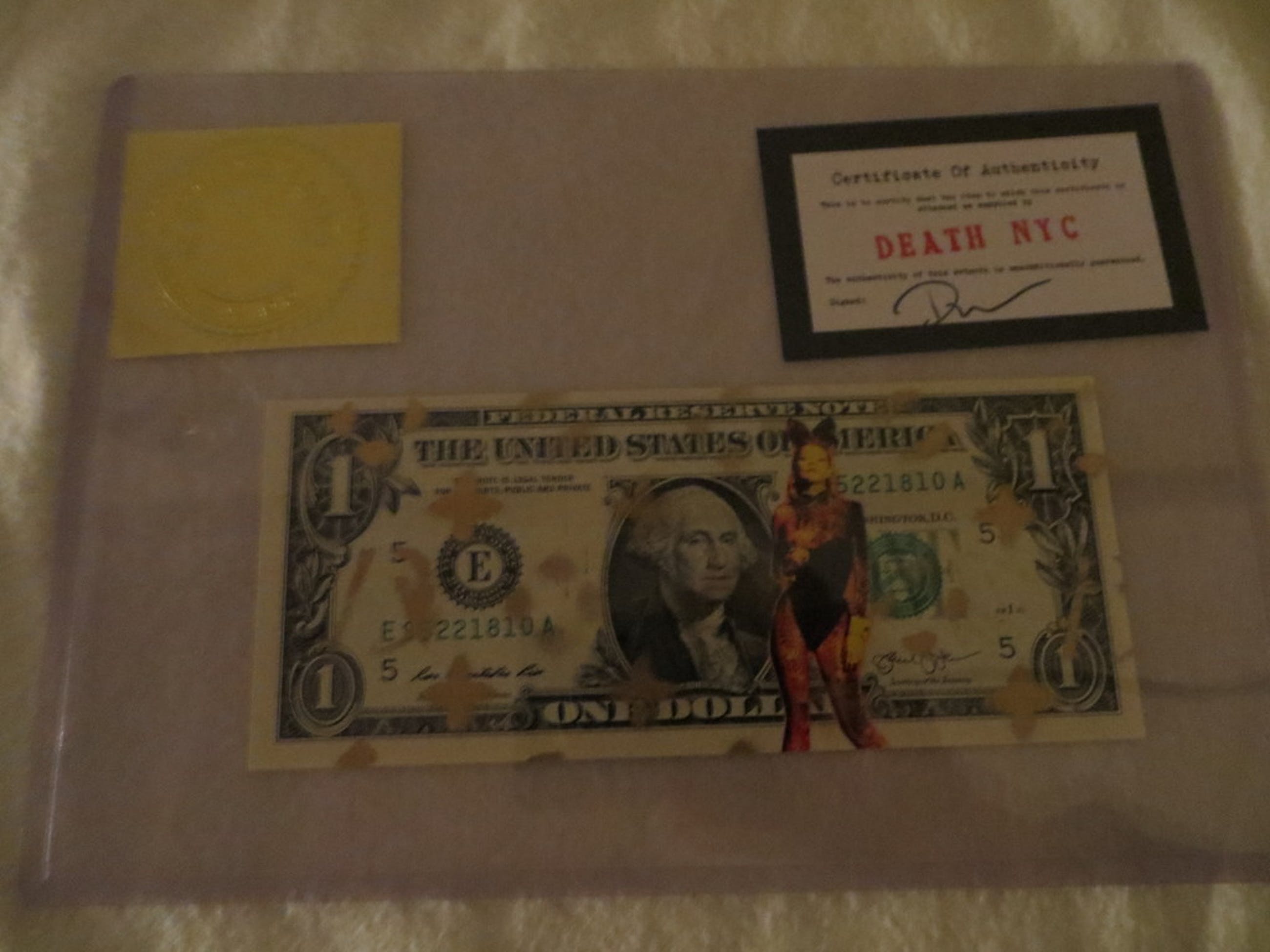 Origineel "street-art" werk op een $ 1,00 biljet van kunstenares DEATH NYC. Het werk is uniek en voorzien van een certificaat van echtheid en sticker/blindstempel.