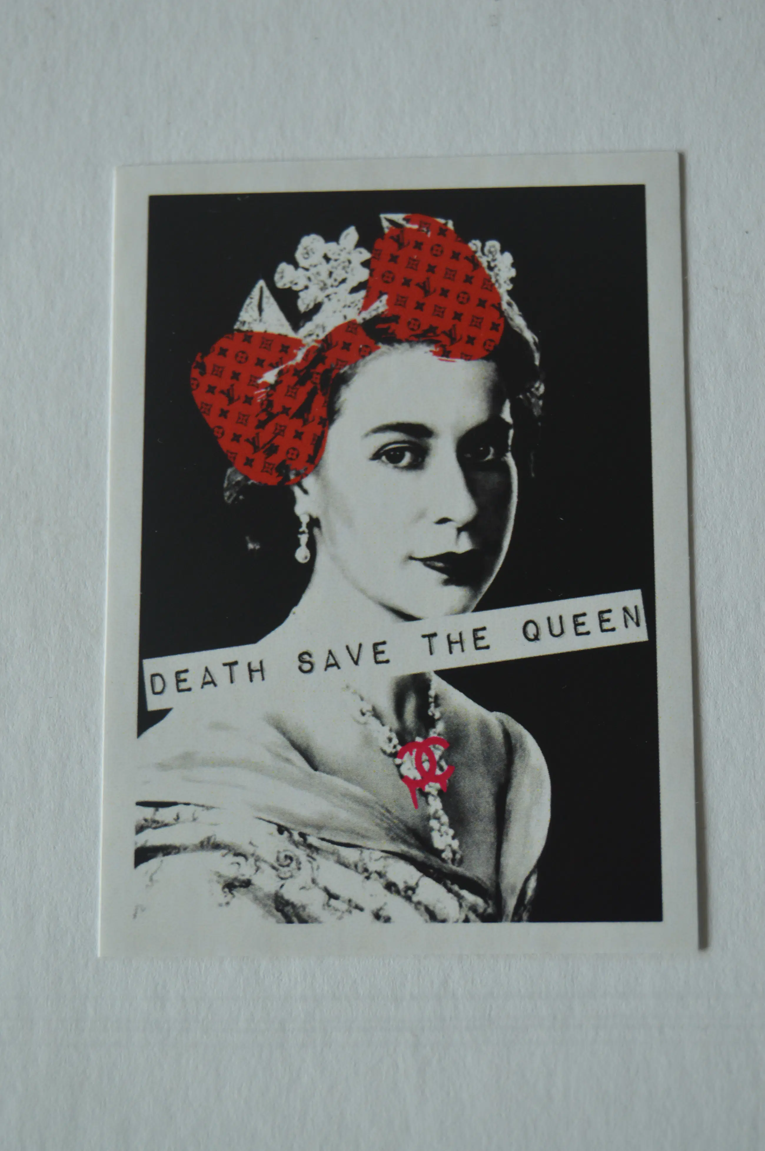 Daarbij; Death save the Queen. Afmetingen 8 x 6 cm