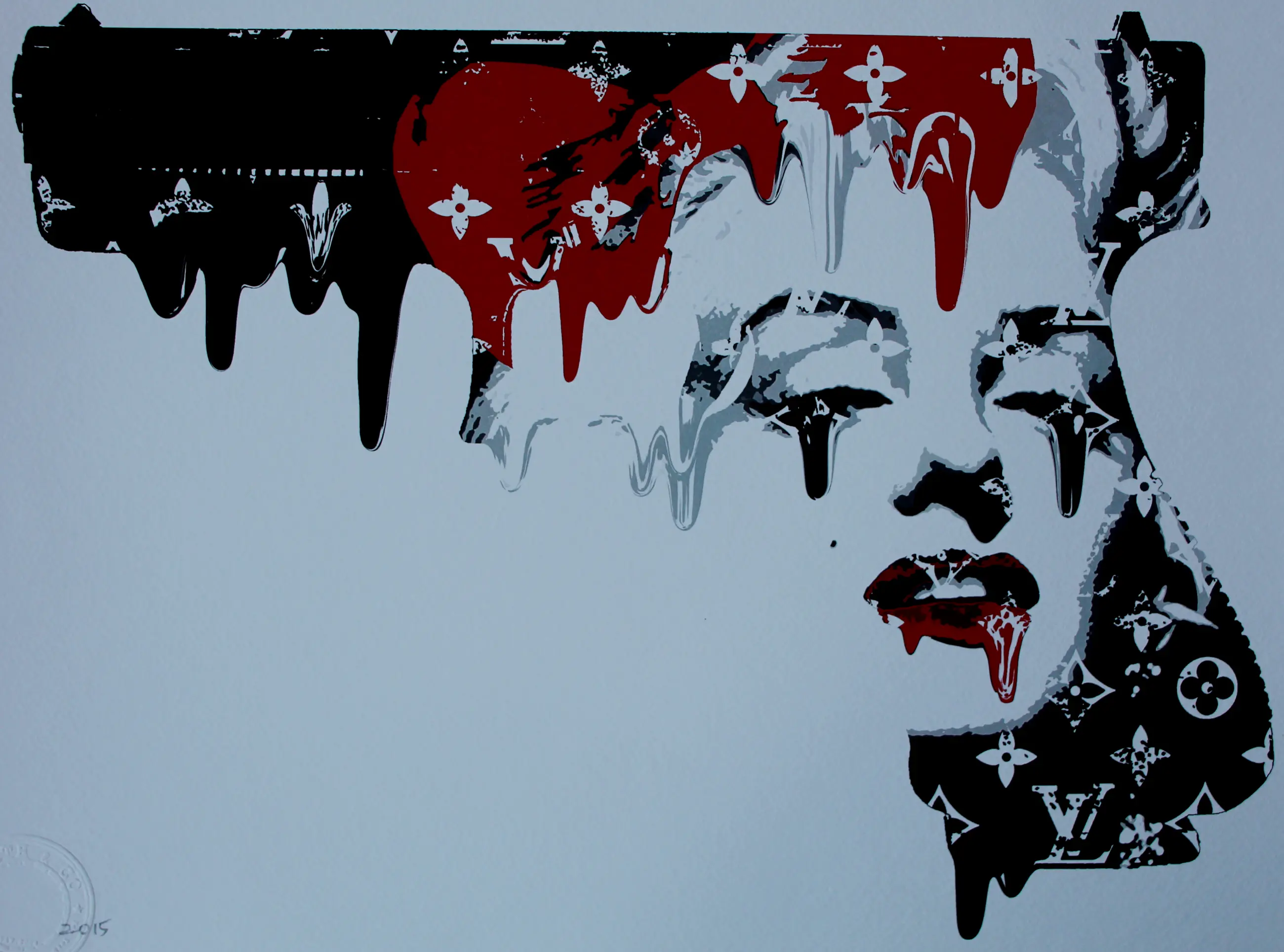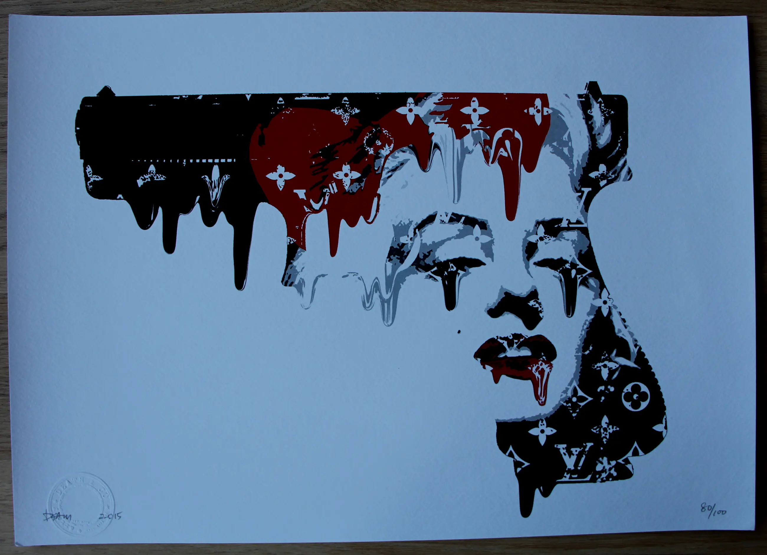Zeefdruk van de straatkunstenaar Death NYC. Jaar: 2015. Titel: Marilynn Monroe Gun Drop. Nummer: 80/100. Afmetingen blad: H32 x b45cm. Afmetingen voorstelling: H26 x b34cm. Het werk is links onderaan, gesigneerd door de kunstenaar. De authenticiteit van het aangeboden werk wordt volledig gegarandeerd. Certificaten worden meegeleverd.