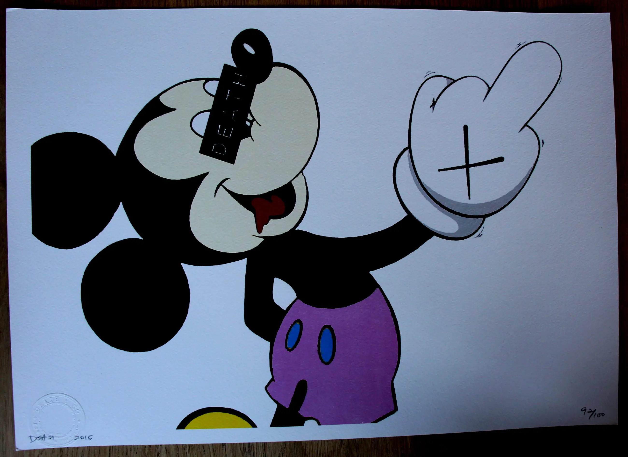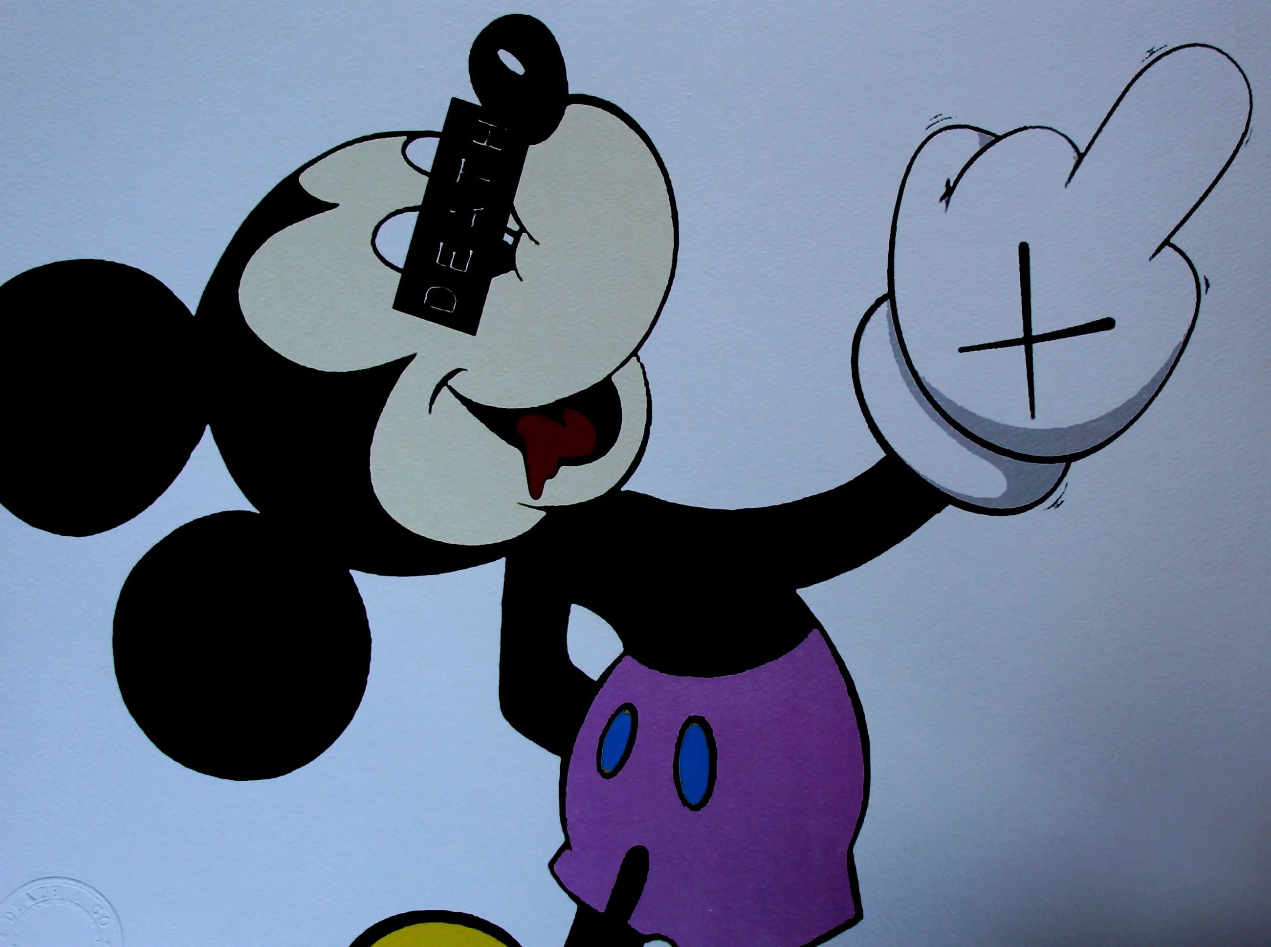 Zeefdruk van de straatkunstenaar Death NYC. Jaar: 2015. Titel: Mickey Mouse, The Finger. Nummer: 92/100. Afmetingen blad: H32 x b45cm. Afmetingen voorstelling: H29 x b40cm. Het werk is links onderaan, gesigneerd door de kunstenaar. De authenticiteit van het aangeboden werk wordt volledig gegarandeerd. Certificaat wordt meegeleverd.