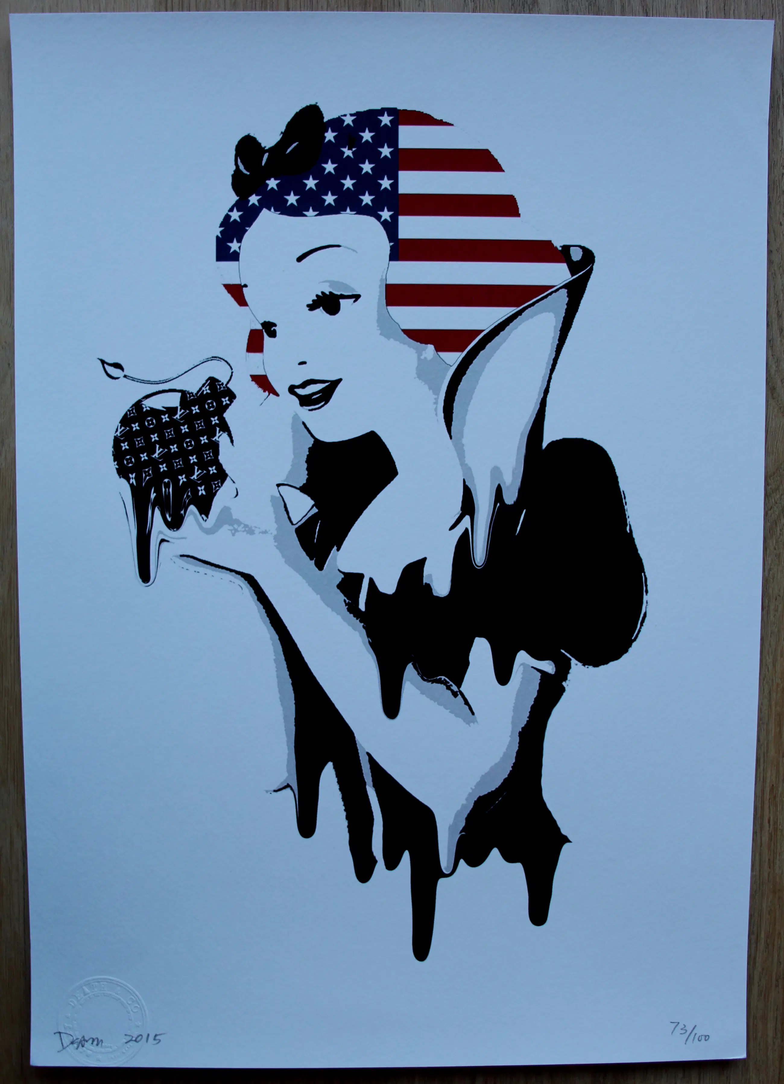 Zeefdruk van de straatkunstenaar Death NYC. Jaar: 2015. Titel: Snow White U.S.A bomb black. Nummer: 73/100. Afmetingen blad: H45 x b32cm. Afmetingen voorstelling: H29 x b29cm. Het werk is rechts onderaan, gesigneerd door de kunstenaar. De authenticiteit van het aangeboden werk wordt volledig gegarandeerd. Certificaat wordt meegeleverd.