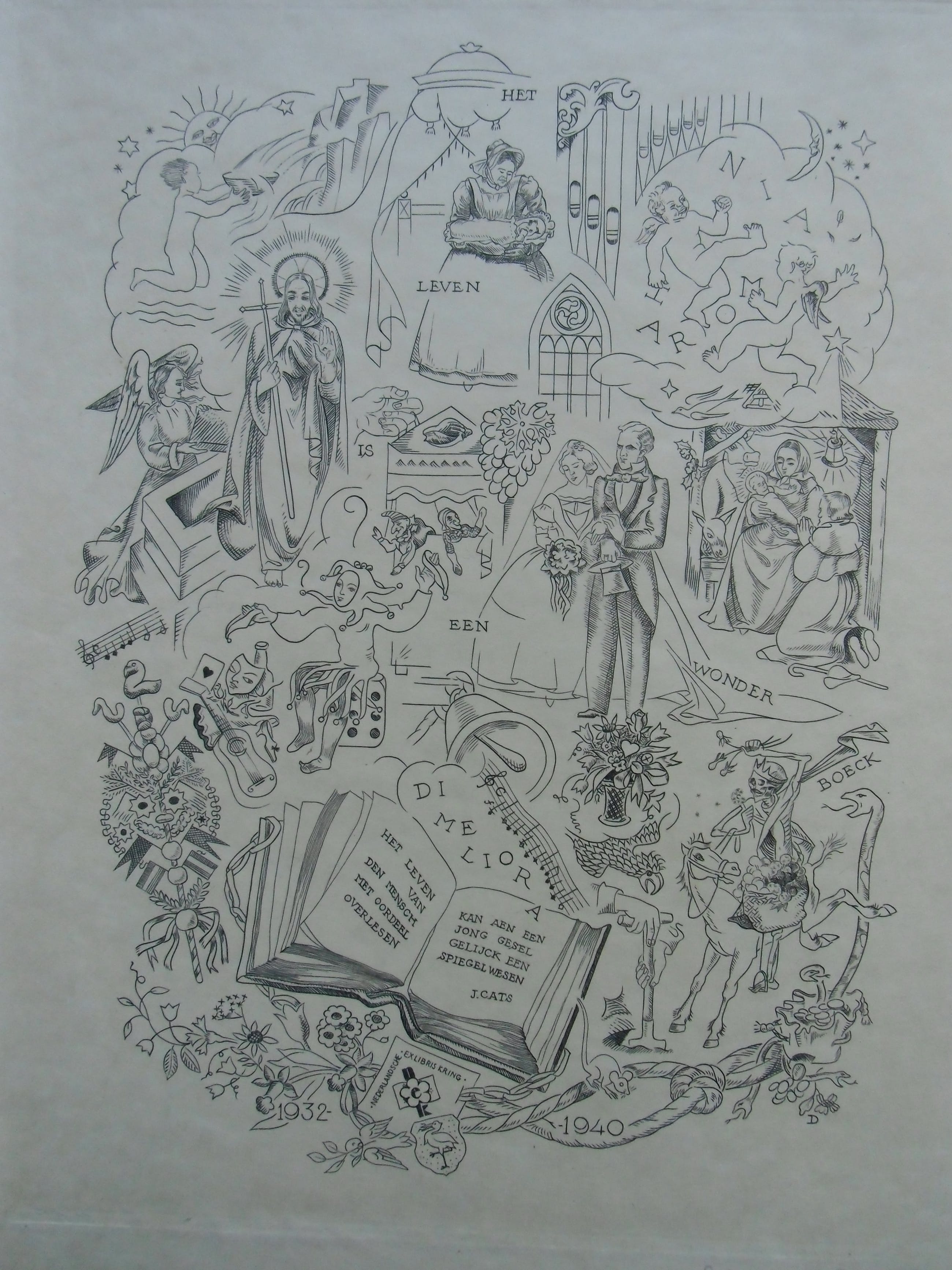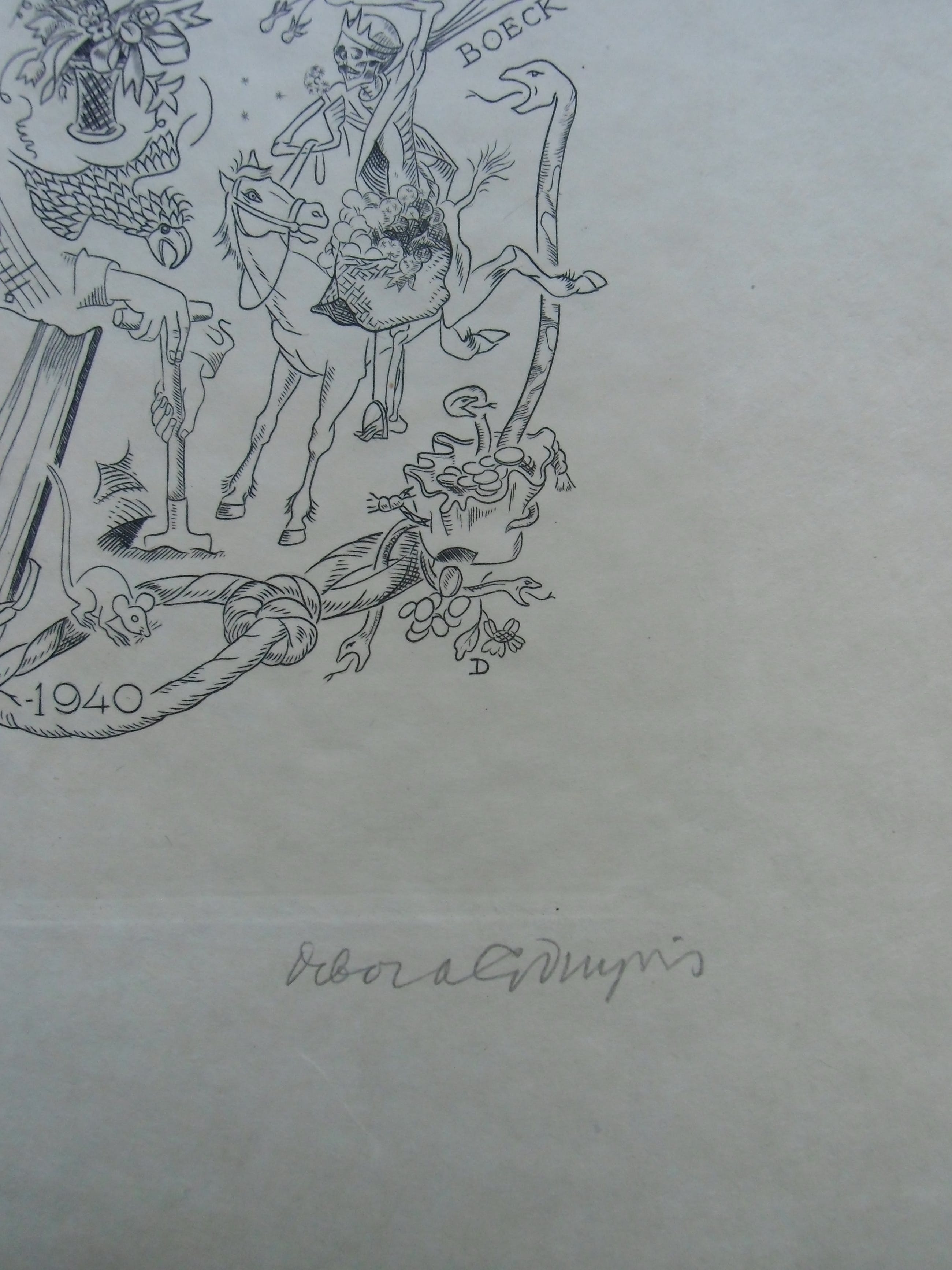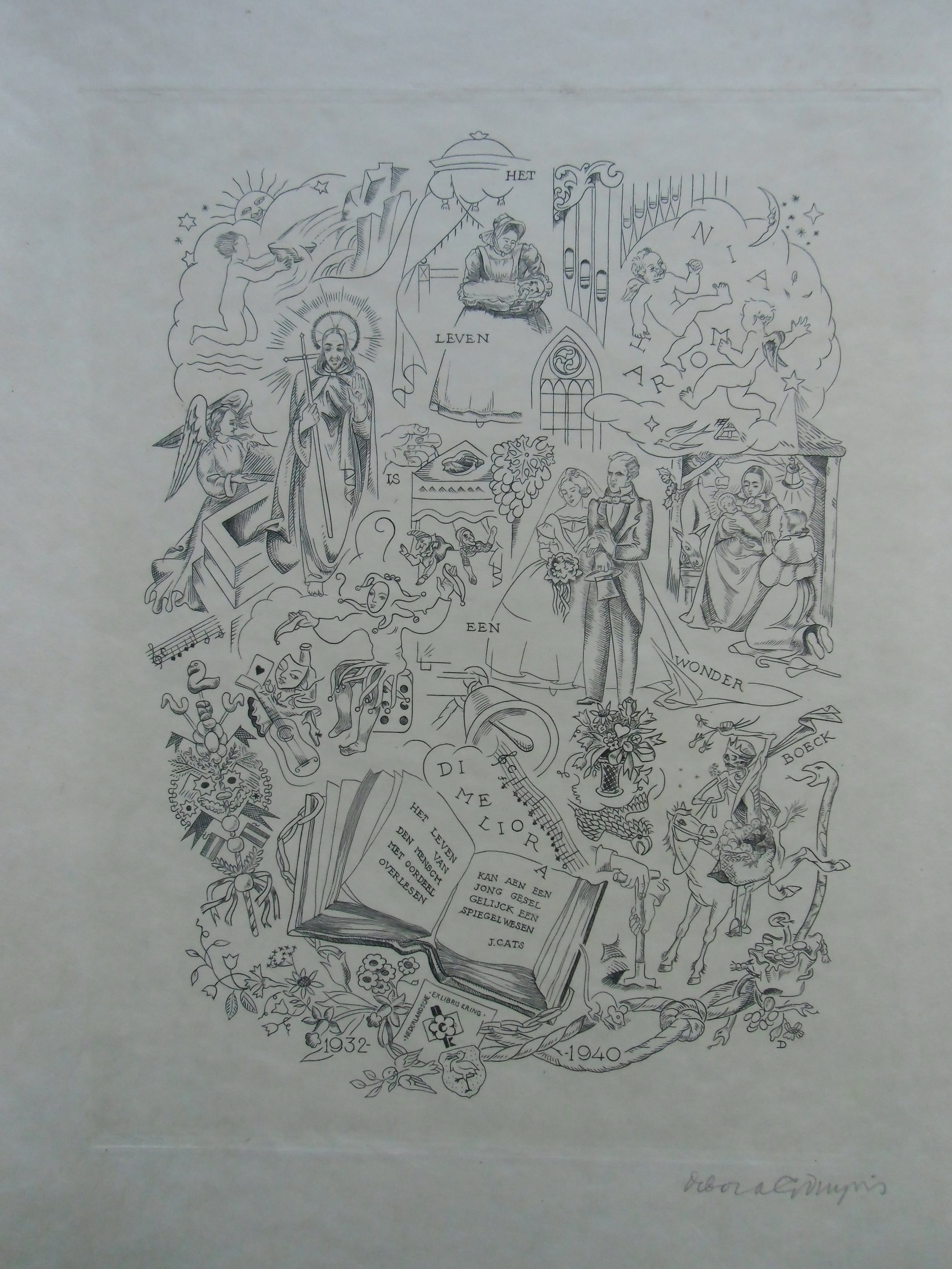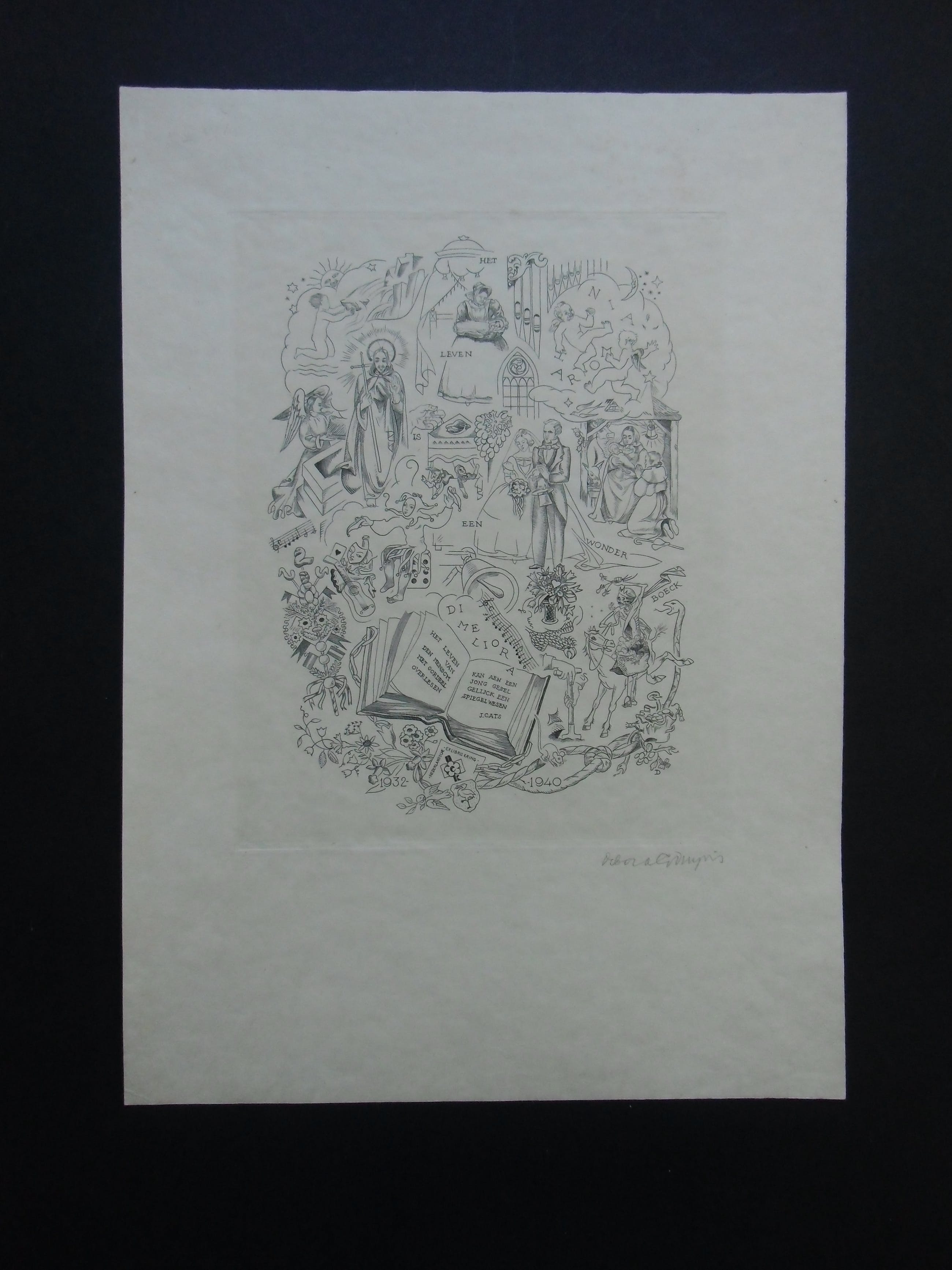 Kopergravure uit 1940 op chamois papier vélin. Afmeting beeld 23.3 x 16.7 cm. Blad 40 x 29.5 cm. Zeer goede conditie. Uitgave van de Nederlandsche Exlibris Kring. Gesigneerd met potlood.