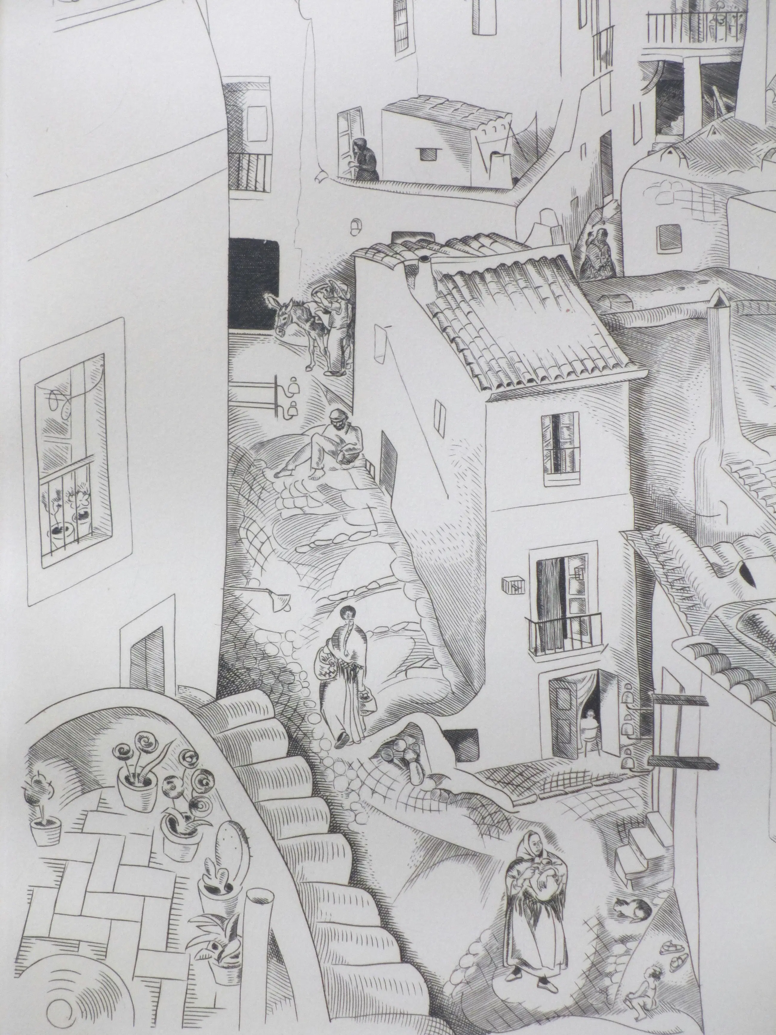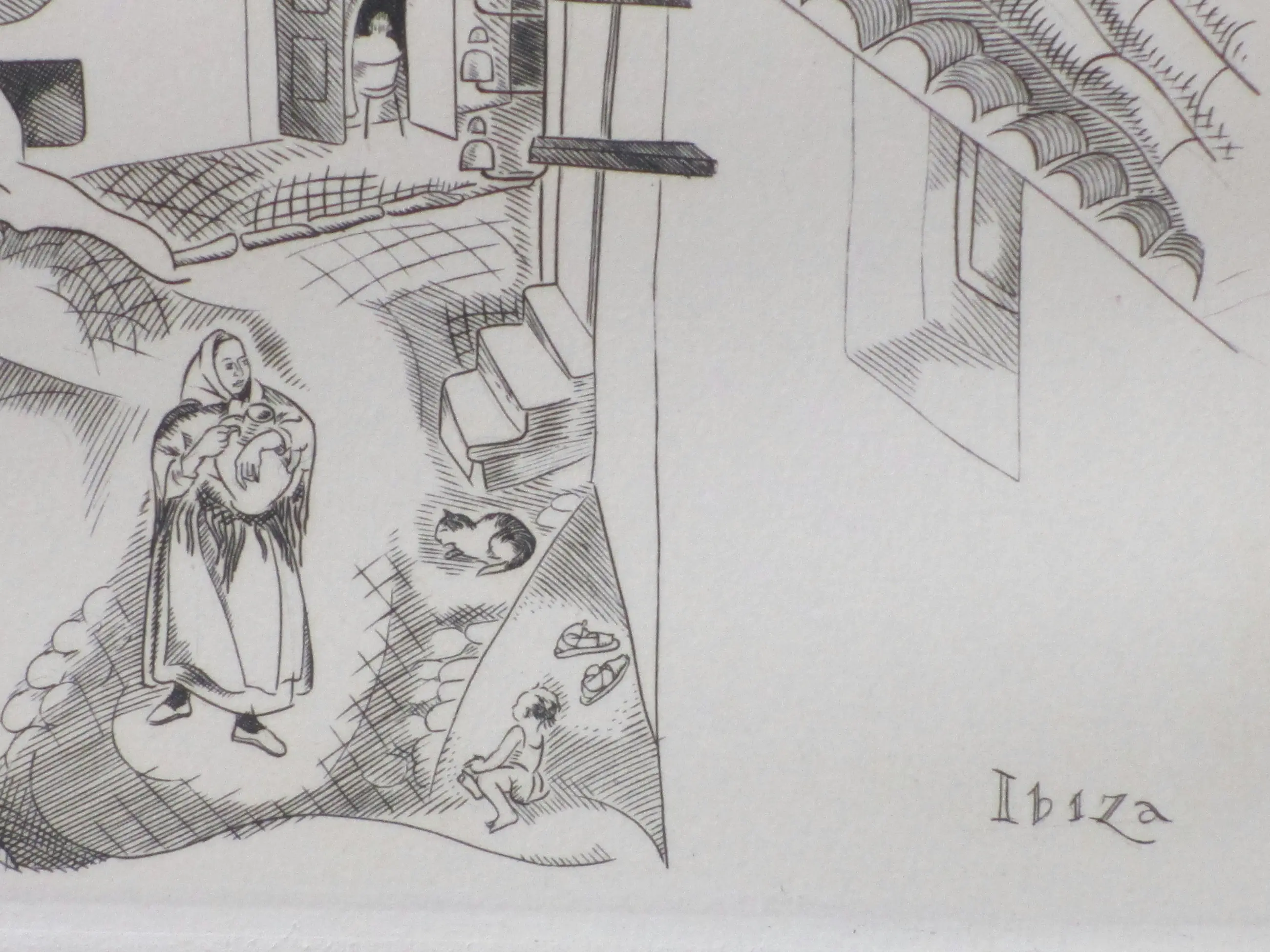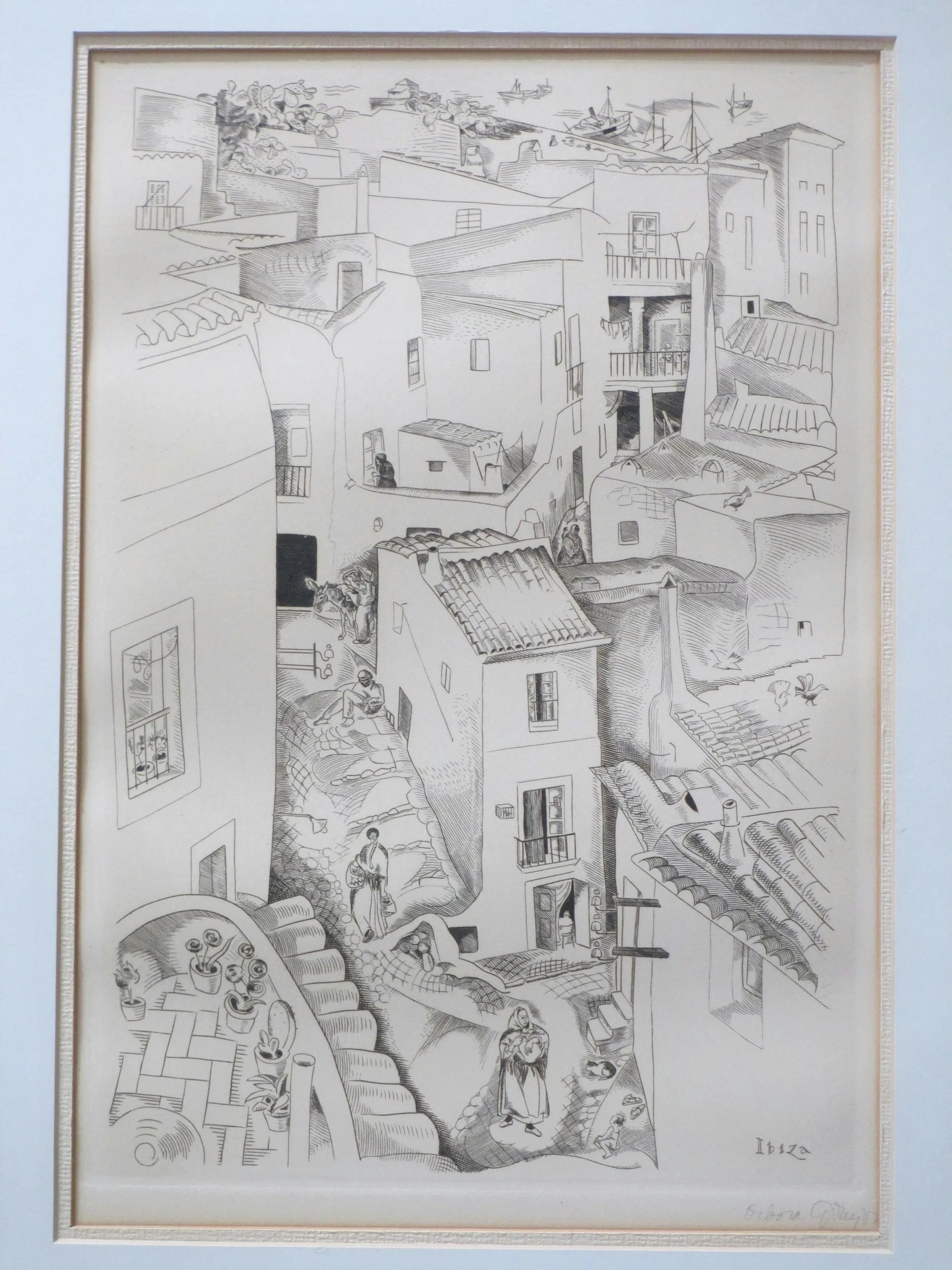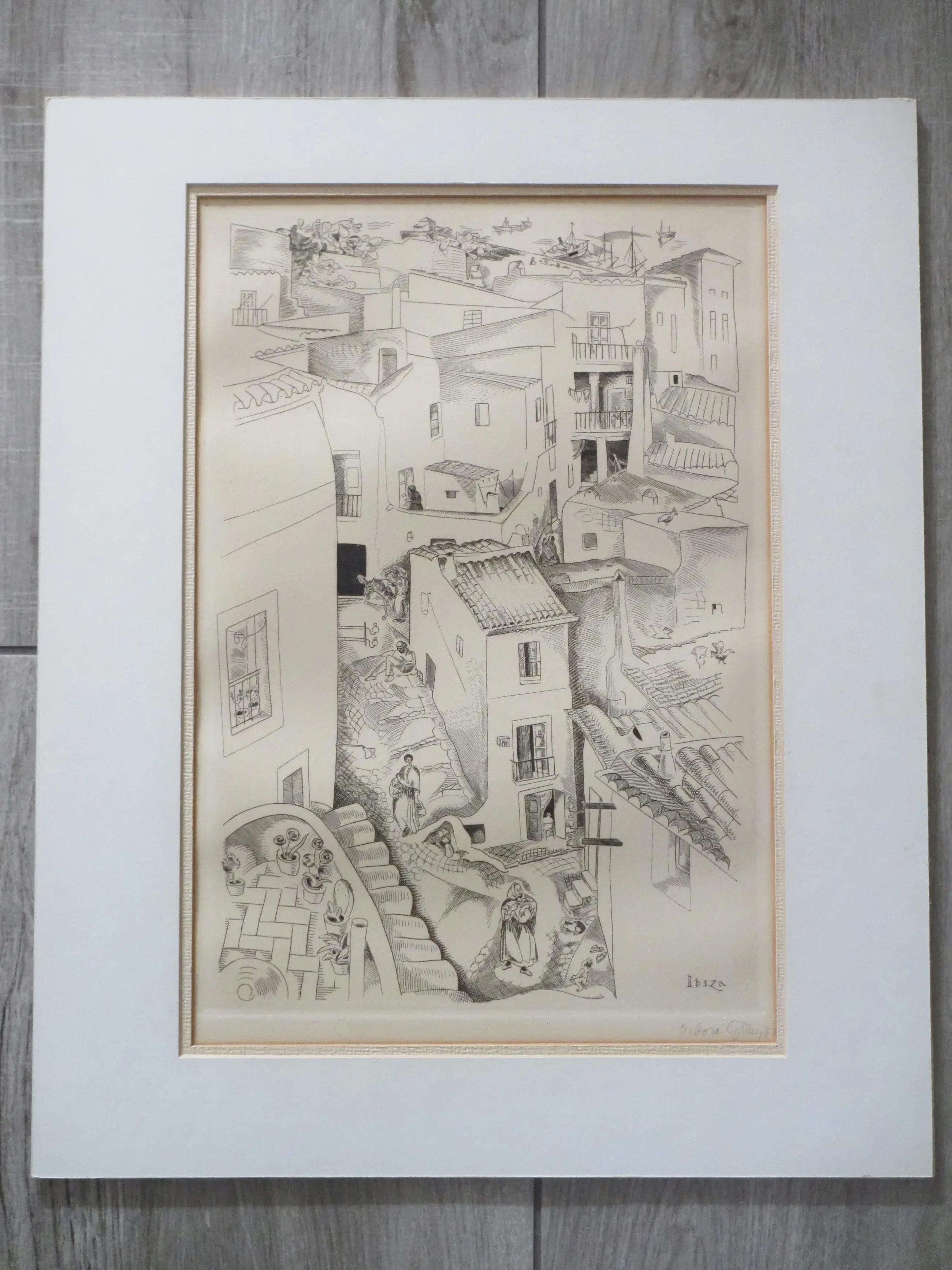 Kopergravure door Deborah Duyvis Voorstelling van een stadsgezicht met figuren op Ibiza Gravure onder passepartout, beeldmaat 35x24, p.p.maat 47x38 Gesigneerd in potlood r.o.: 'Debora Duyvis' Getiteld r.o. in de druk: 'Ibiza' Authenticiteit volledig gegarandeerd