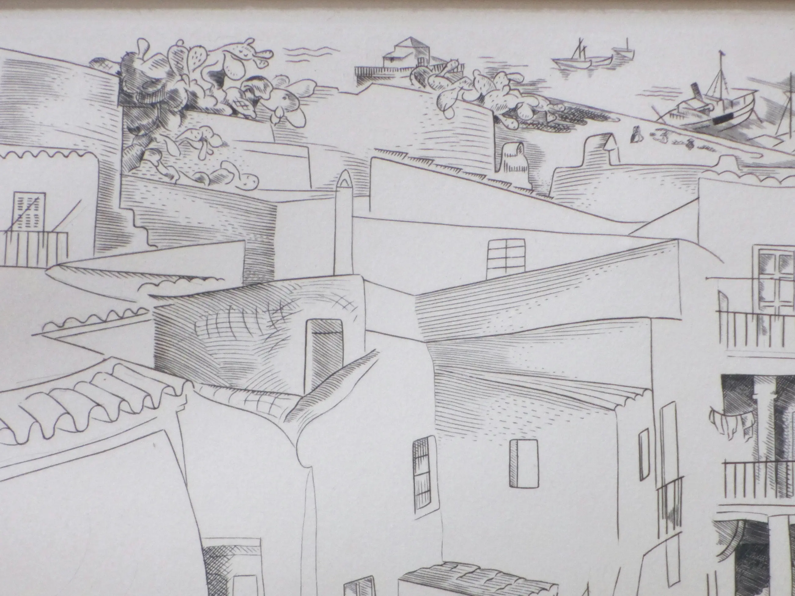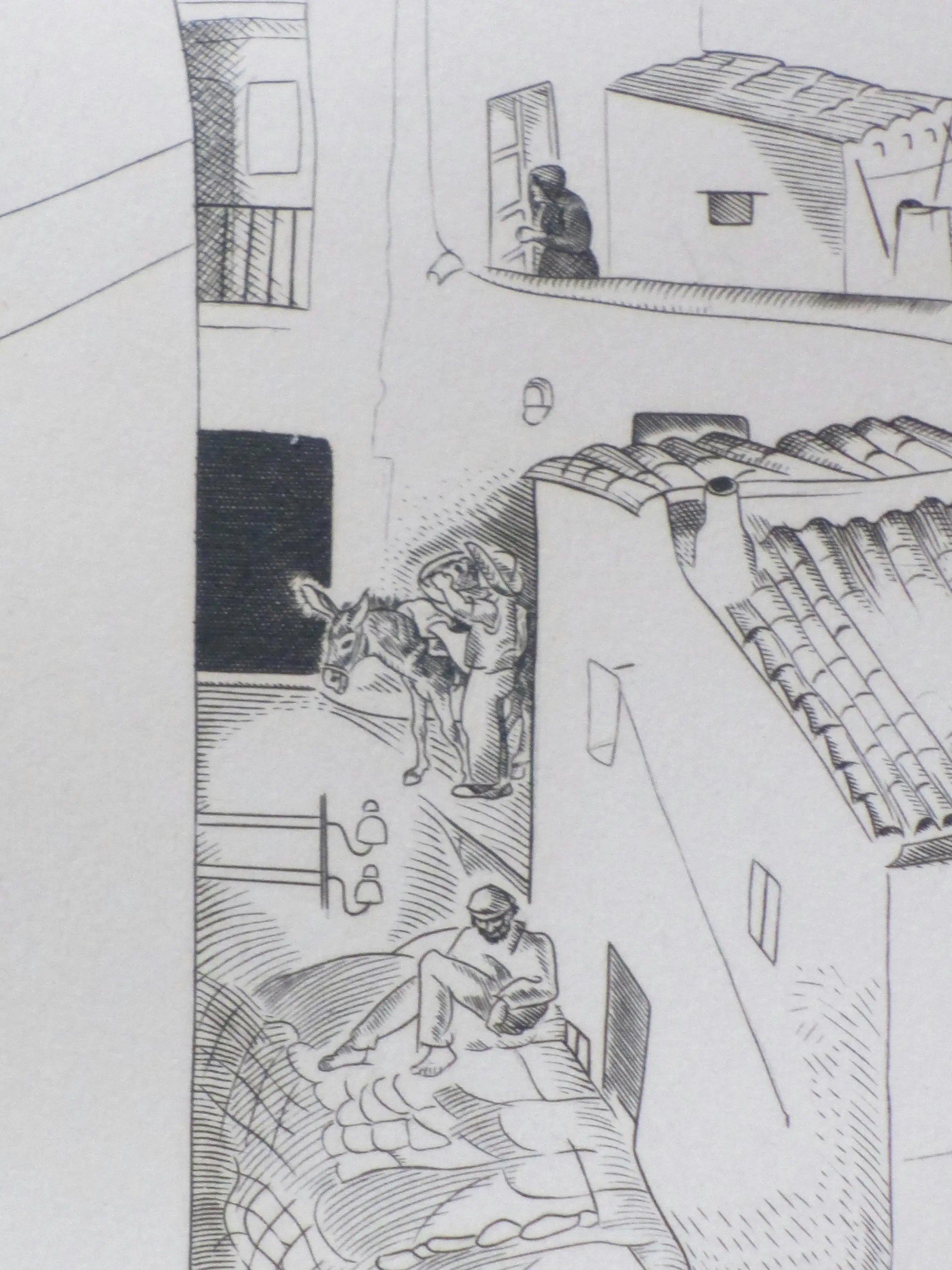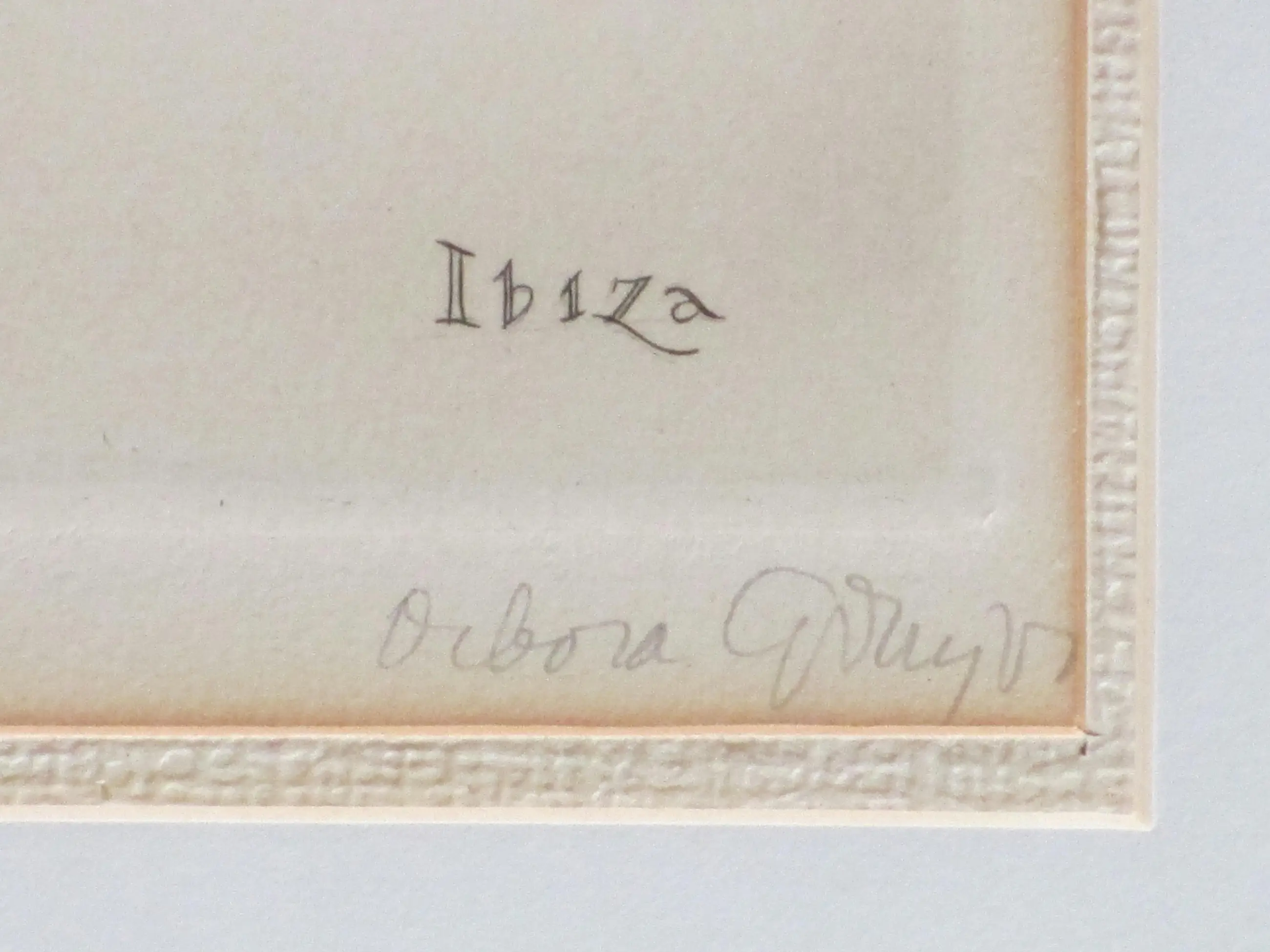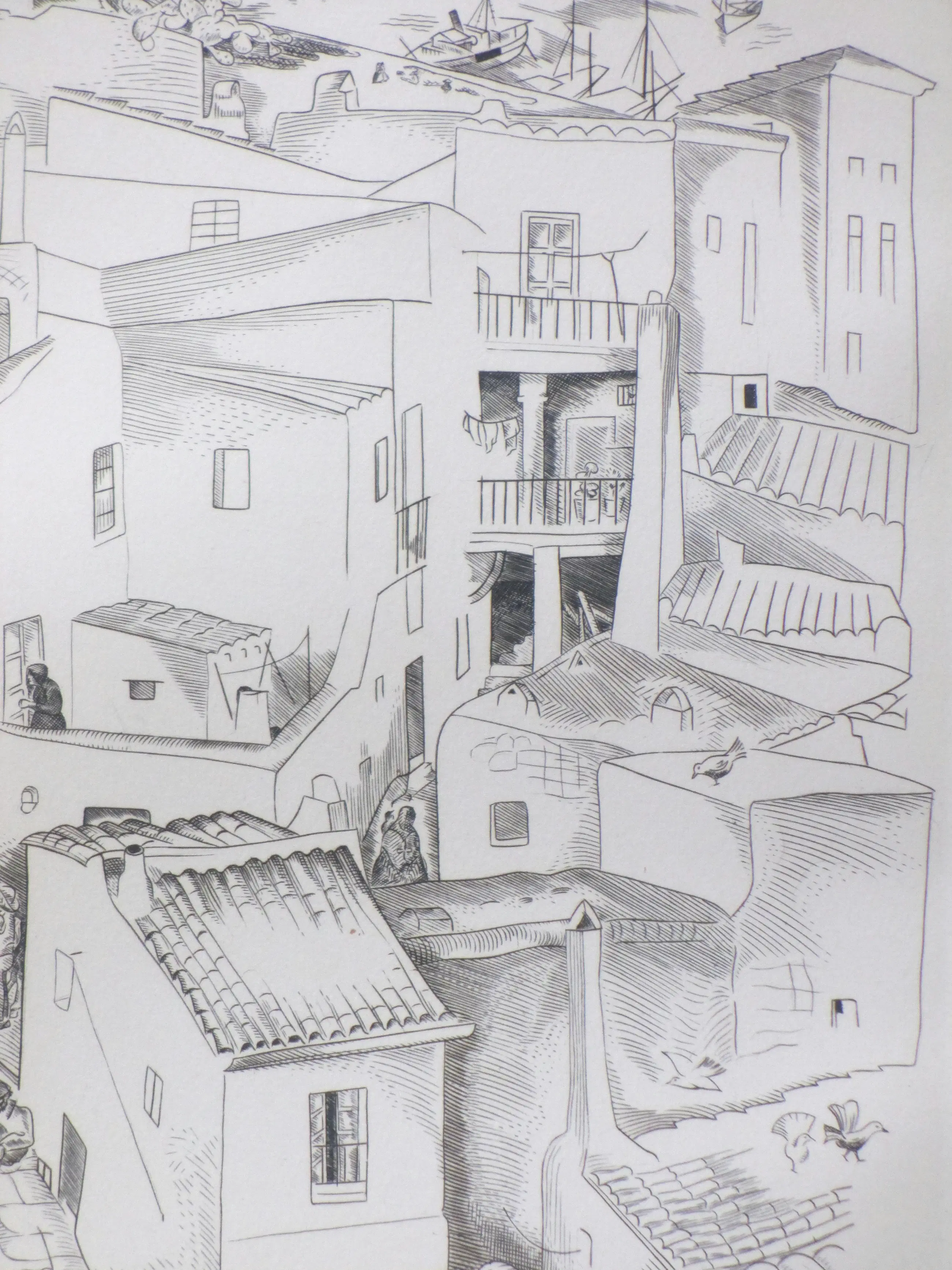 Kopergravure door Deborah Duyvis Voorstelling van een stadsgezicht met figuren op Ibiza Gravure onder passepartout, beeldmaat 35x24, p.p.maat 47x38 Gesigneerd in potlood r.o.: 'Debora Duyvis' Getiteld r.o. in de druk: 'Ibiza' Authenticiteit volledig gegarandeerd