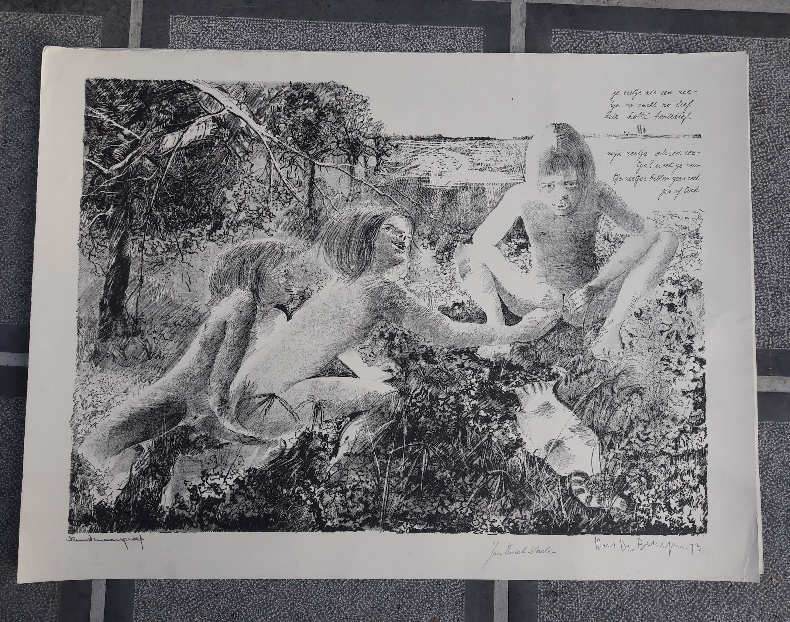 Lithografie van Dees De Bruyne met een erotisch gedicht van Jan Emiel Daele uit de reeks 'Eros', uitgebracht in 200 exemplaren