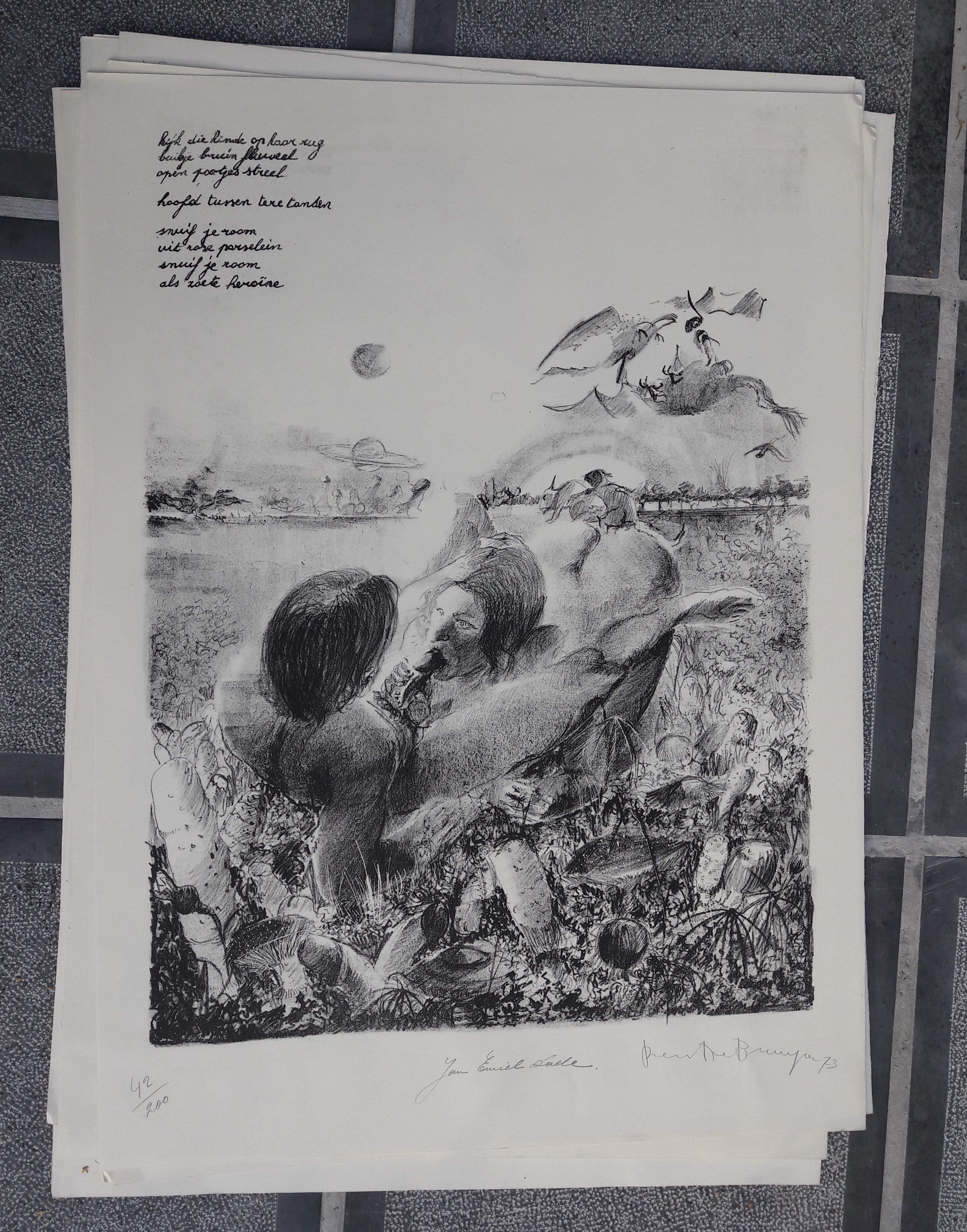 Lithografie van Dees De Bruyne met een erotisch gedicht van Jan Emiel Daele uit reeks 'Eros', uitgebracht in 200 exemplaren