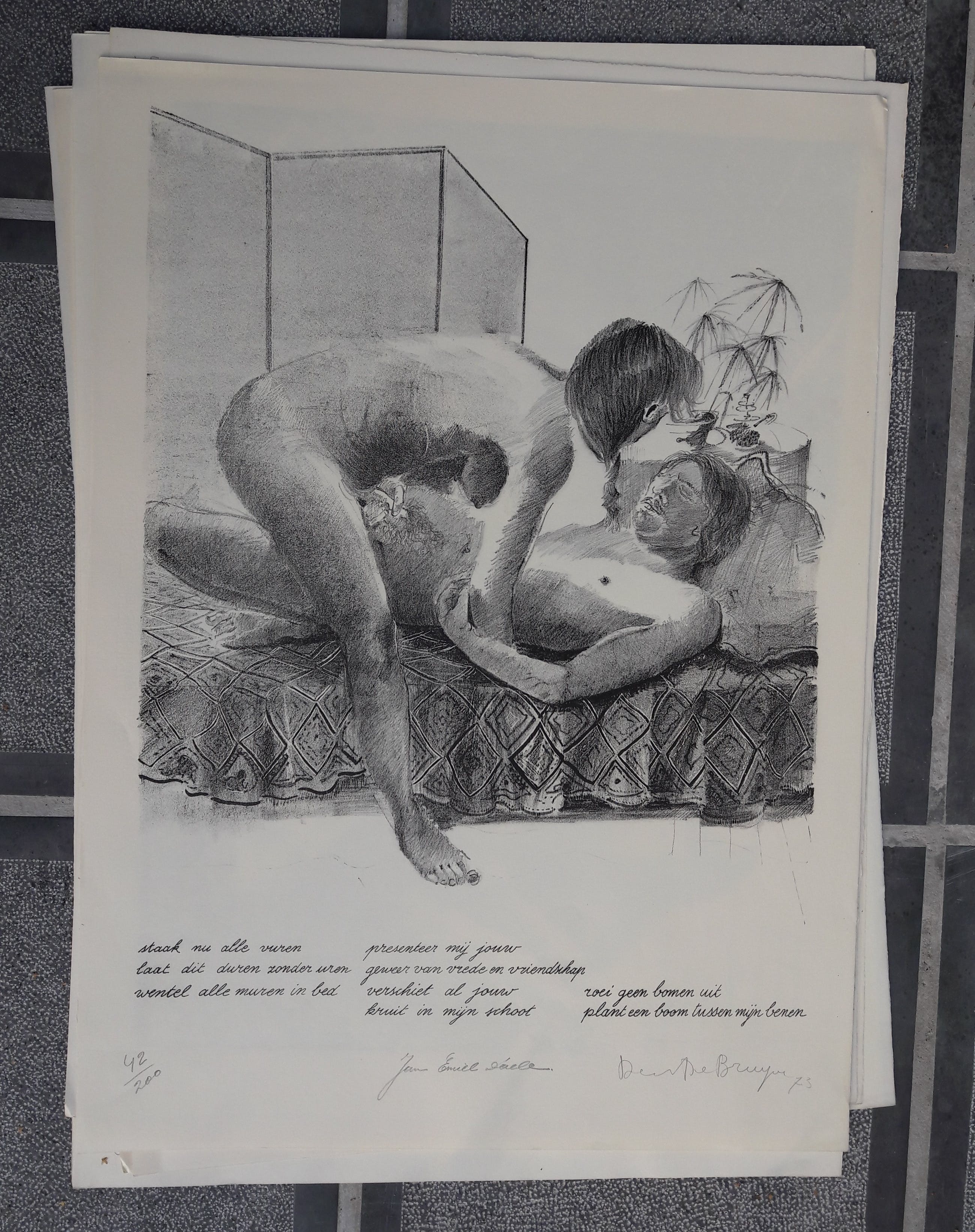 Lithografie van Dees De Bruyne met een erotisch gedicht van Jan Emiel Daele uit reeks 'Eros', uitgebracht in 200 exemplaren