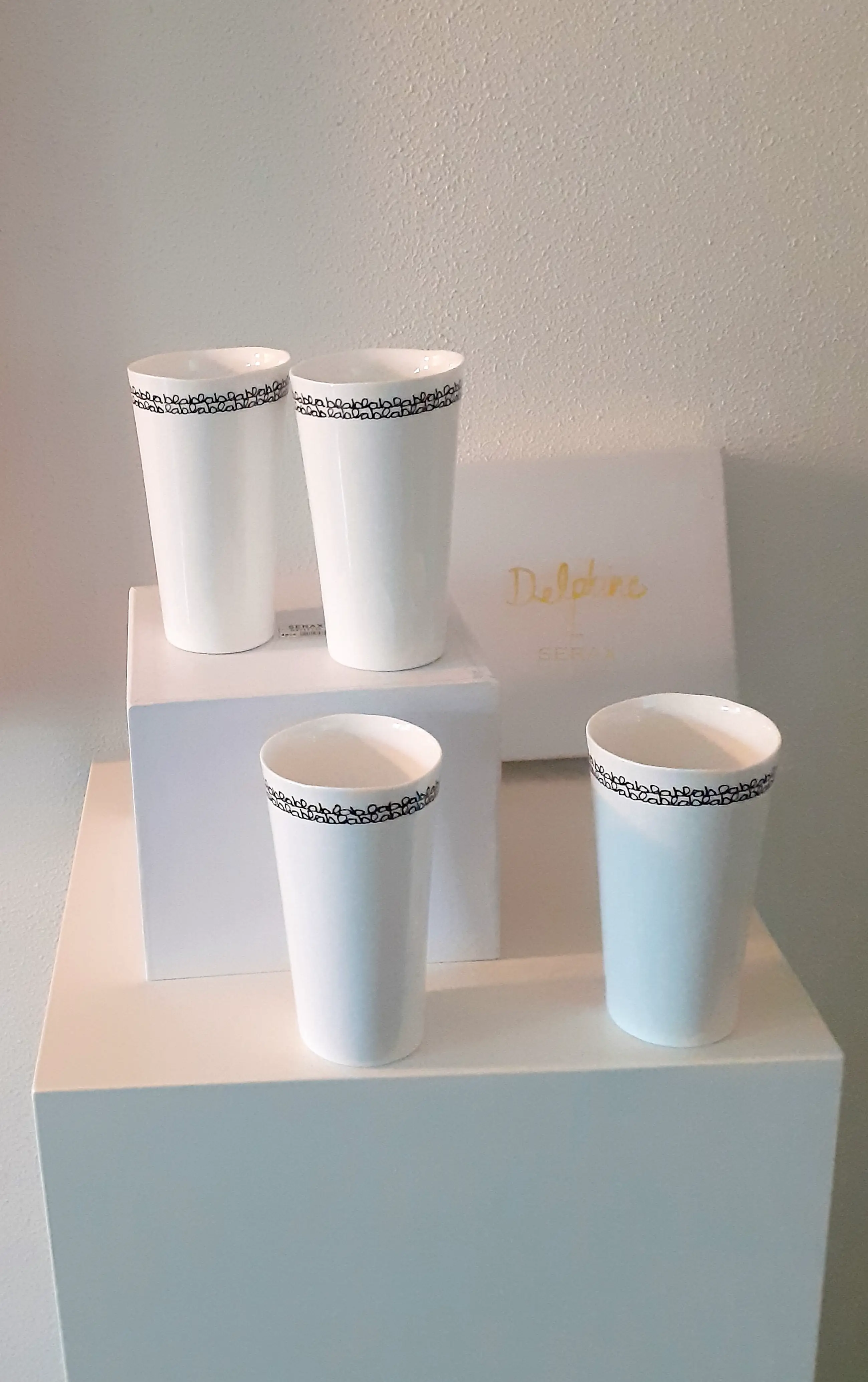 In originele verpakking en met certificaat, 4 champagnemugs (multifunctioneel, ook leuk als vaasjes) ontworpen voor The Art of Dining-collectie van Delphine voor SERAX. De gegolfde rand van de stukken verwijst naar Delphine's voorliefde voor papier maché.
