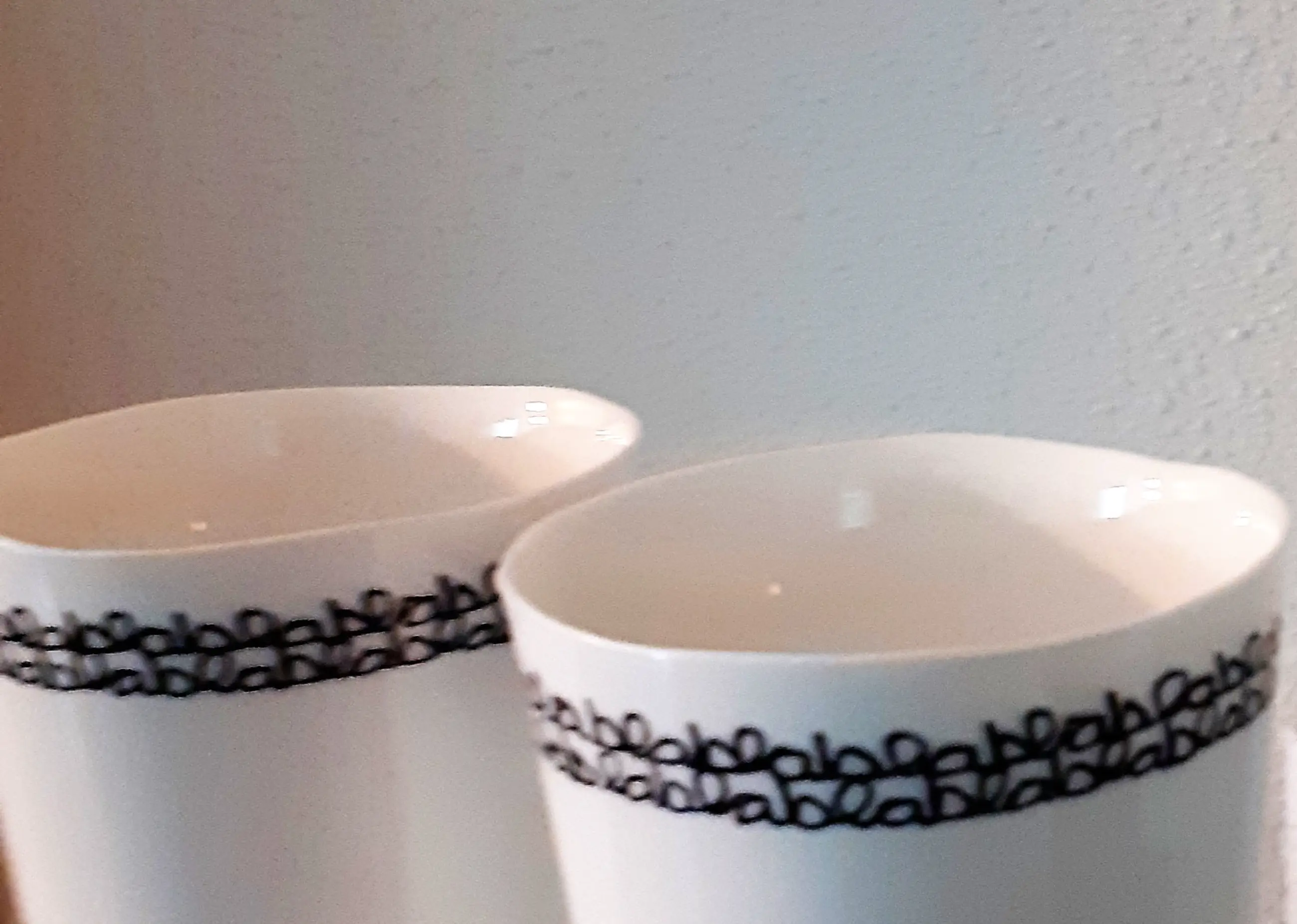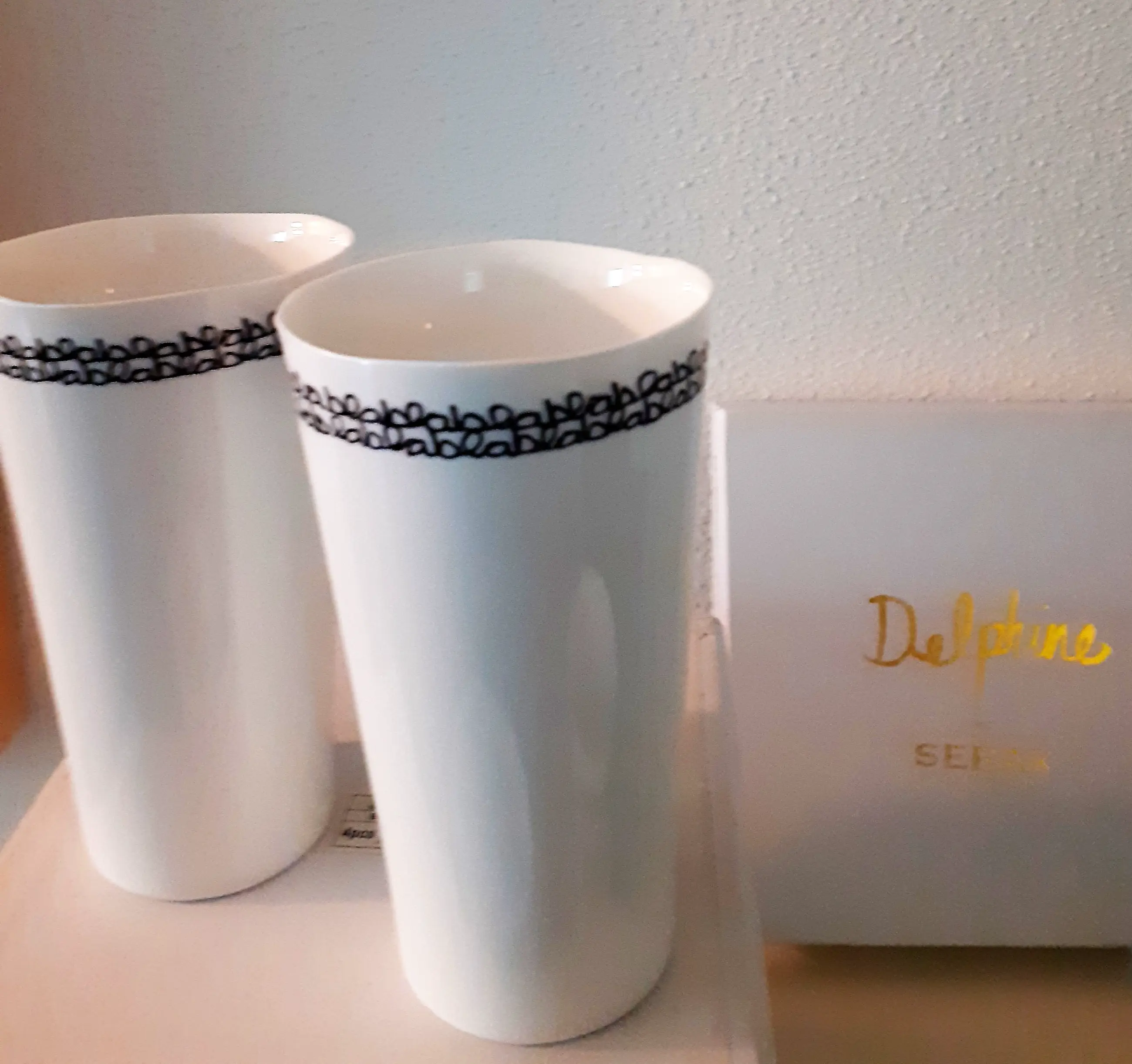 In originele verpakking en met certificaat, 4 champagnemugs (multifunctioneel, ook leuk als vaasjes) ontworpen voor The Art of Dining-collectie van Delphine voor SERAX. De gegolfde rand van de stukken verwijst naar Delphine's voorliefde voor papier maché.