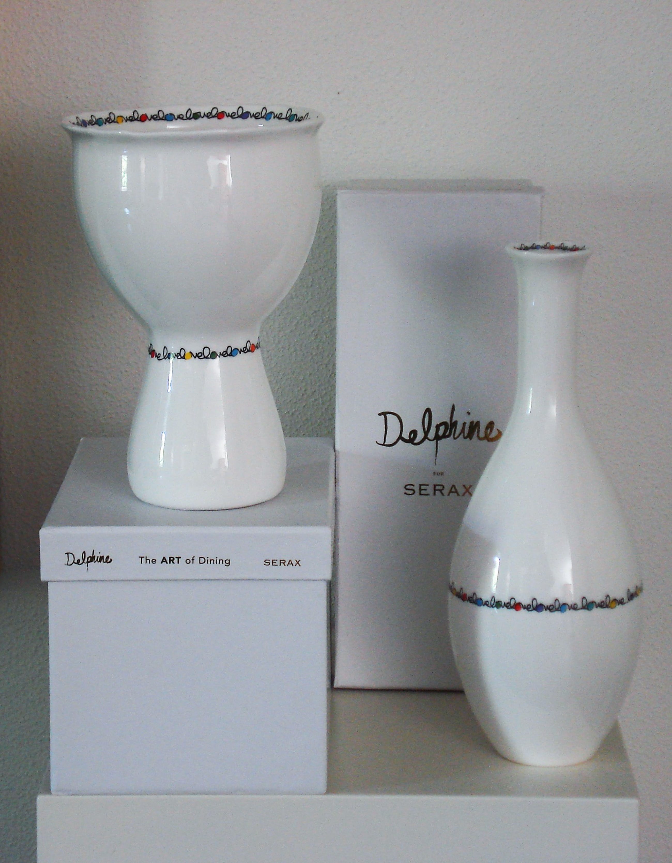 Woorden kunnen ons herinneren aan de essentie van het leven. Delphine Boëls hele bestaan draait om liefde. Liefde is leven en leven is liefde, omdat liefde de kunst van het leven is. Het woord ‘Love’ beheerst dan ook de essentie van de The Art of Dining-collectie van Delphine for SERAX. De brokkelige rand van de stukken verwijst naar Delphine’s voorliefde voor papier mâché. Delphine Boël is het vierde kind van Koning Albert II van België en zijn minnares Sybille de Selys-Longchamps en bekend als non conformistisch kunstenares.