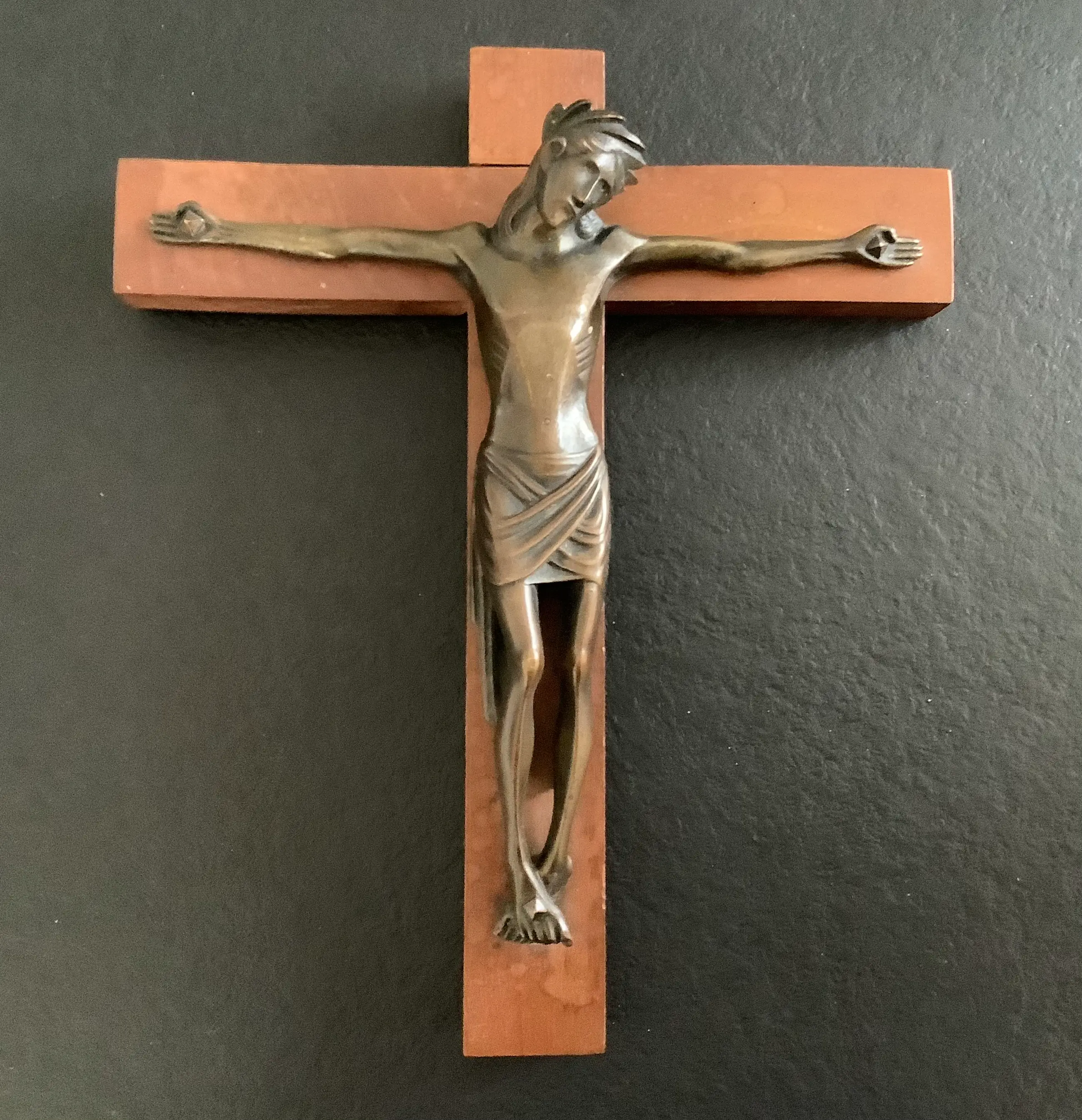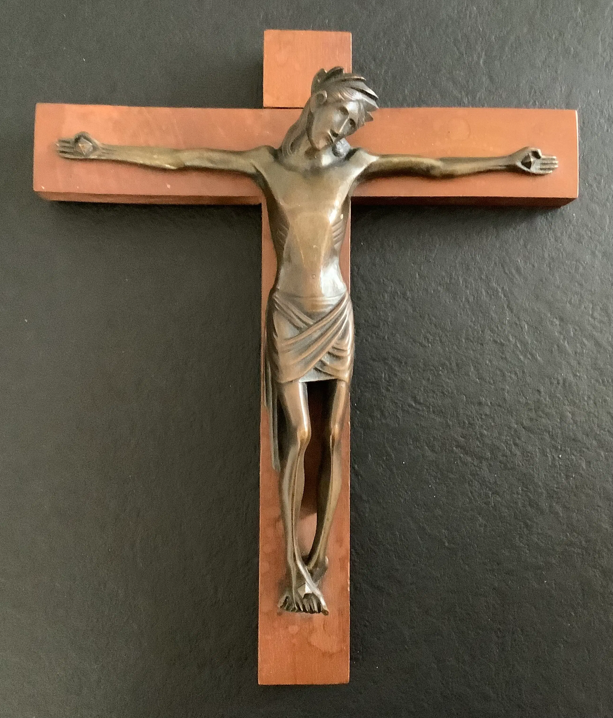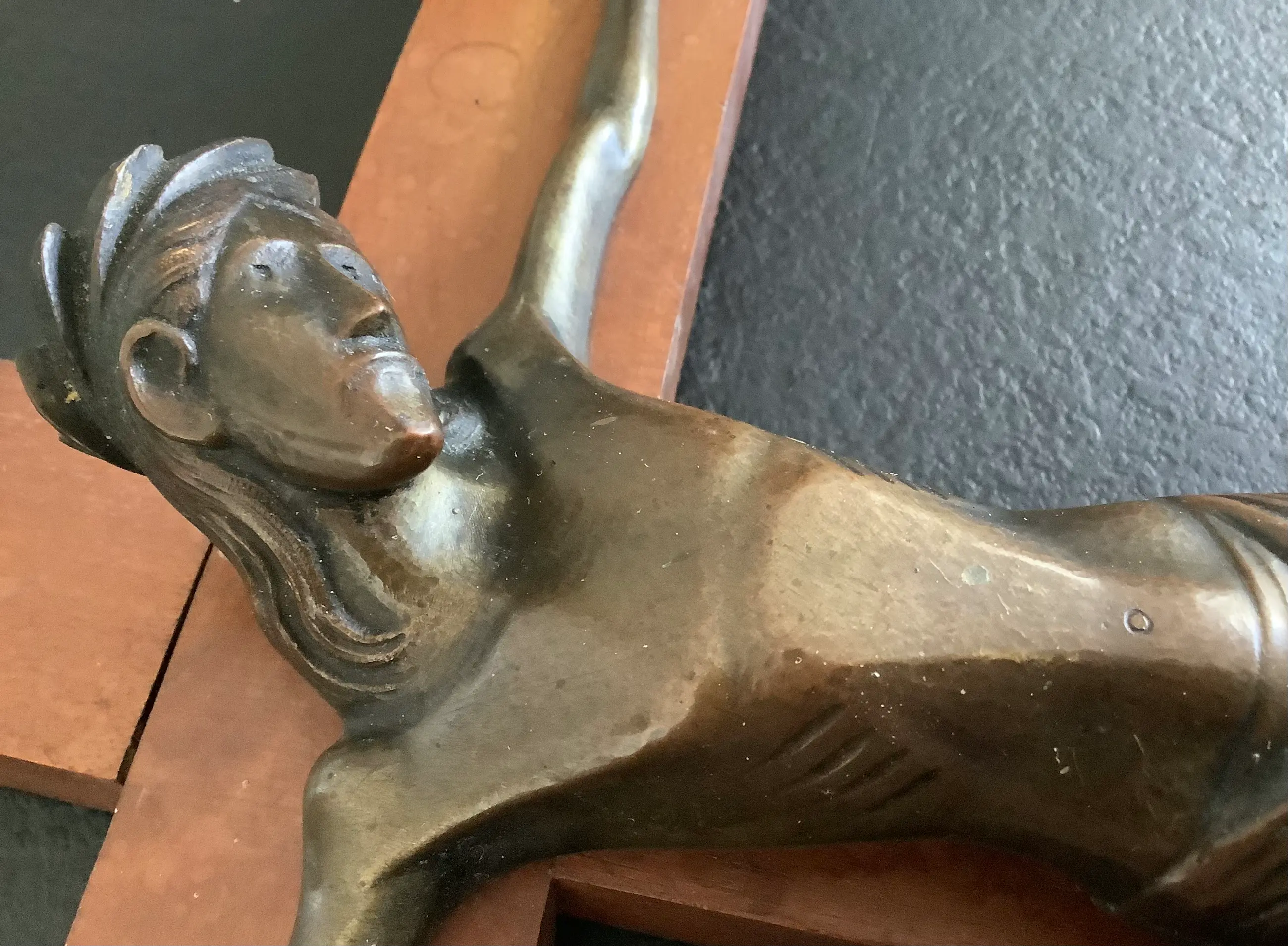 Art Deco object. Fraaie gedetailleerde weergave van Christus aan het kruis. Subtiele gelaatstrekken en mooi vormgegeven kroon. Op oorspronkelijk mahonie houten kruis.