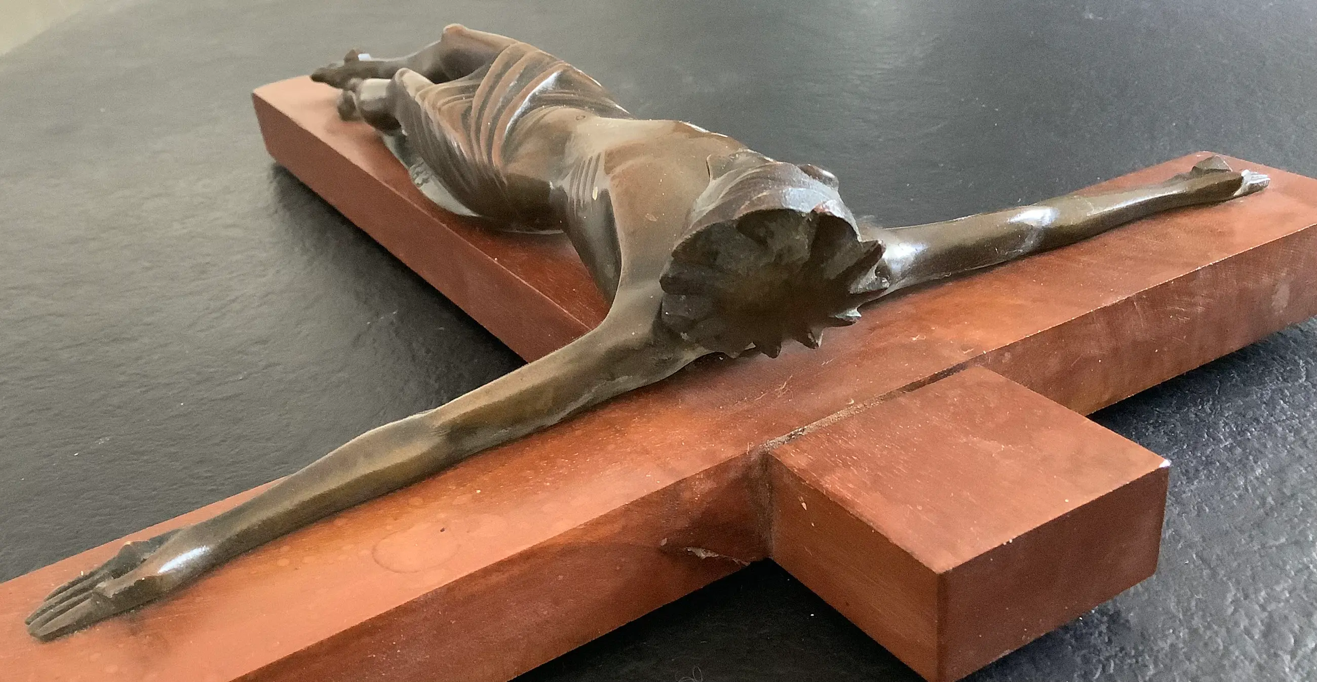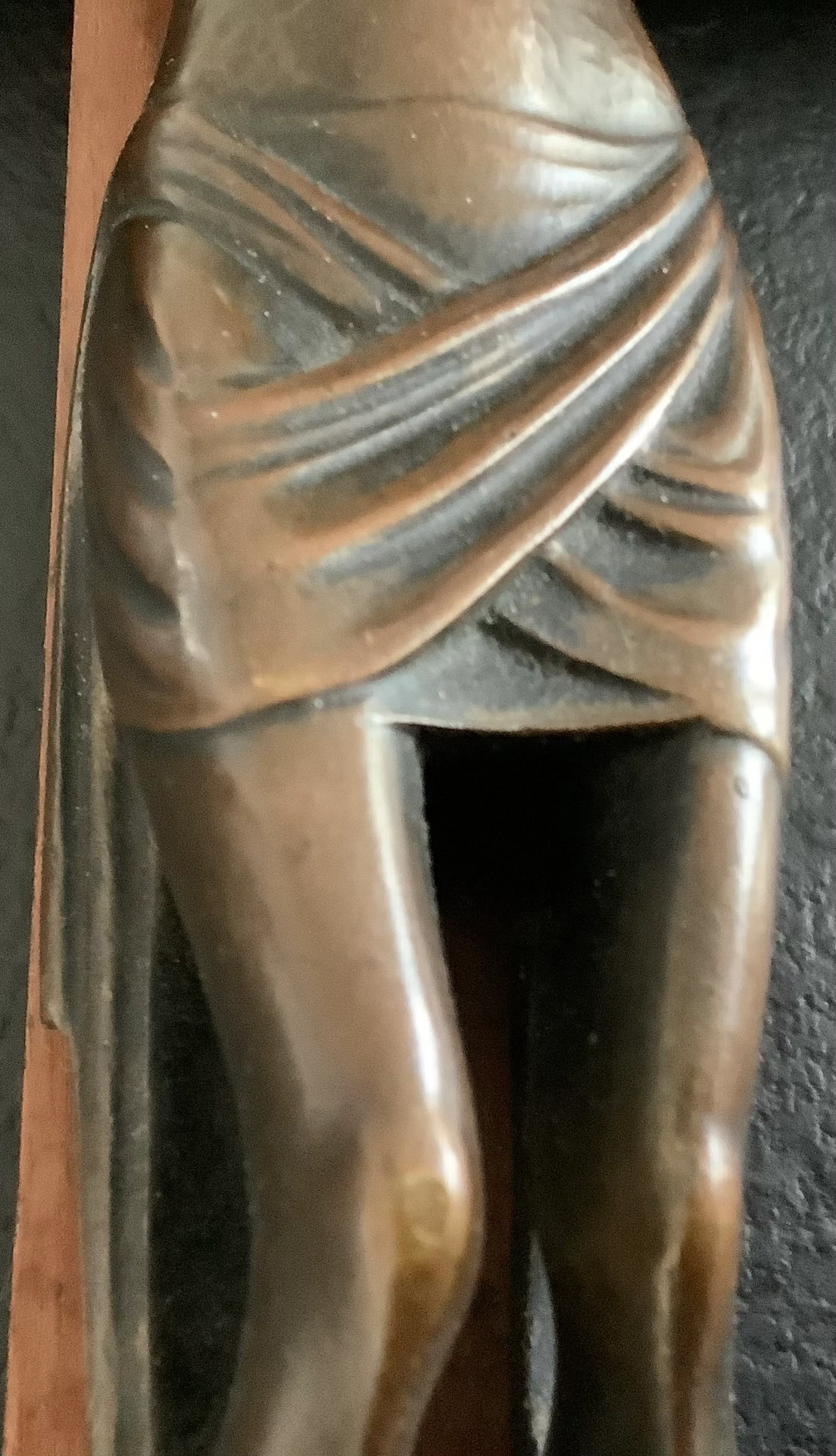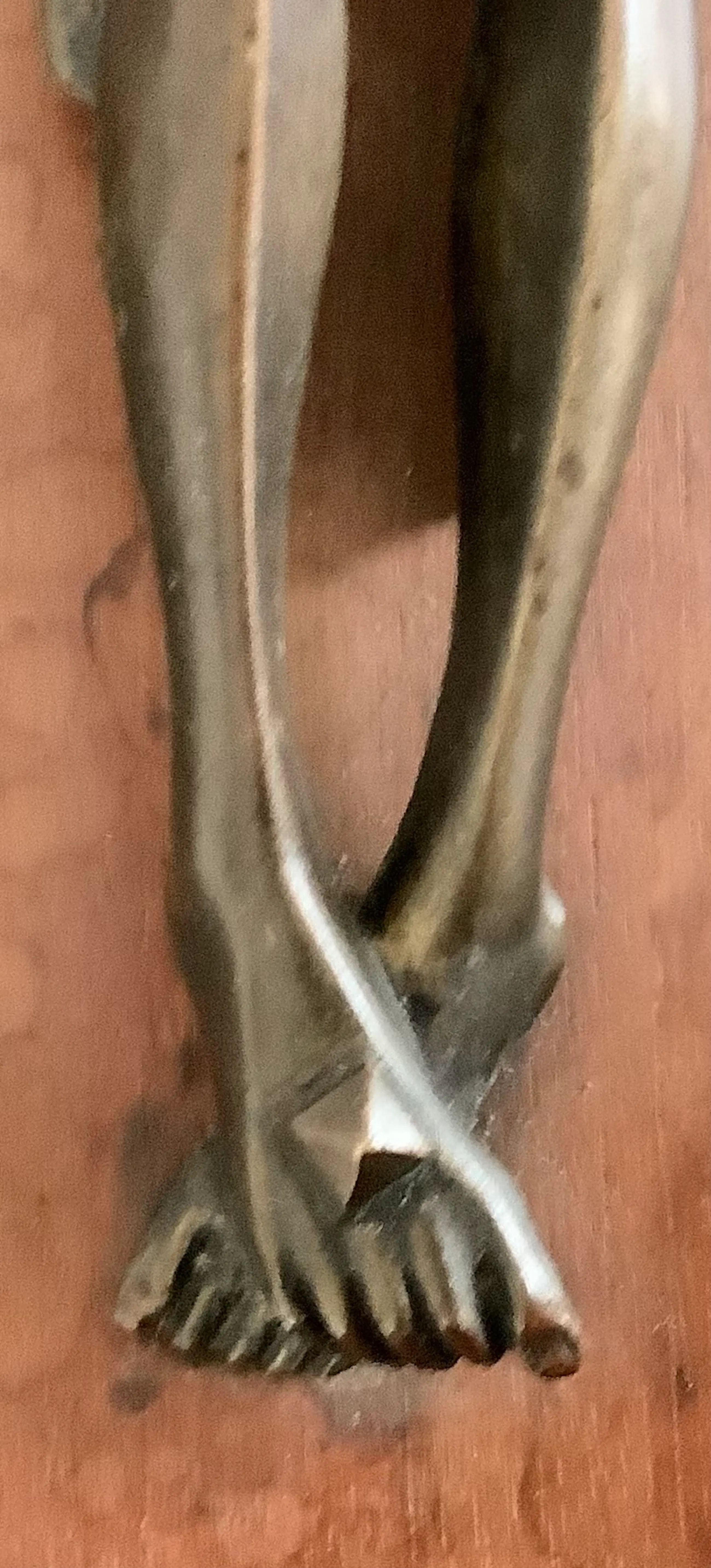 Art Deco object. Fraaie gedetailleerde weergave van Christus aan het kruis. Subtiele gelaatstrekken en mooi vormgegeven kroon. Op oorspronkelijk mahonie houten kruis.
