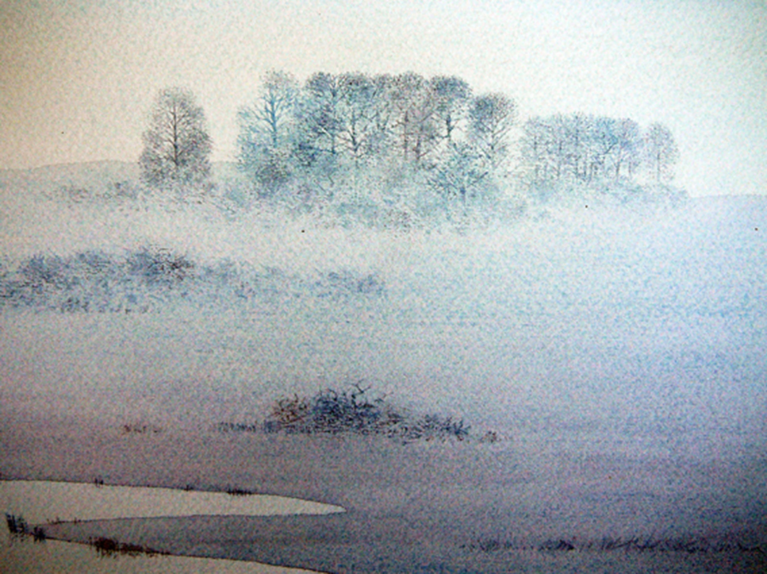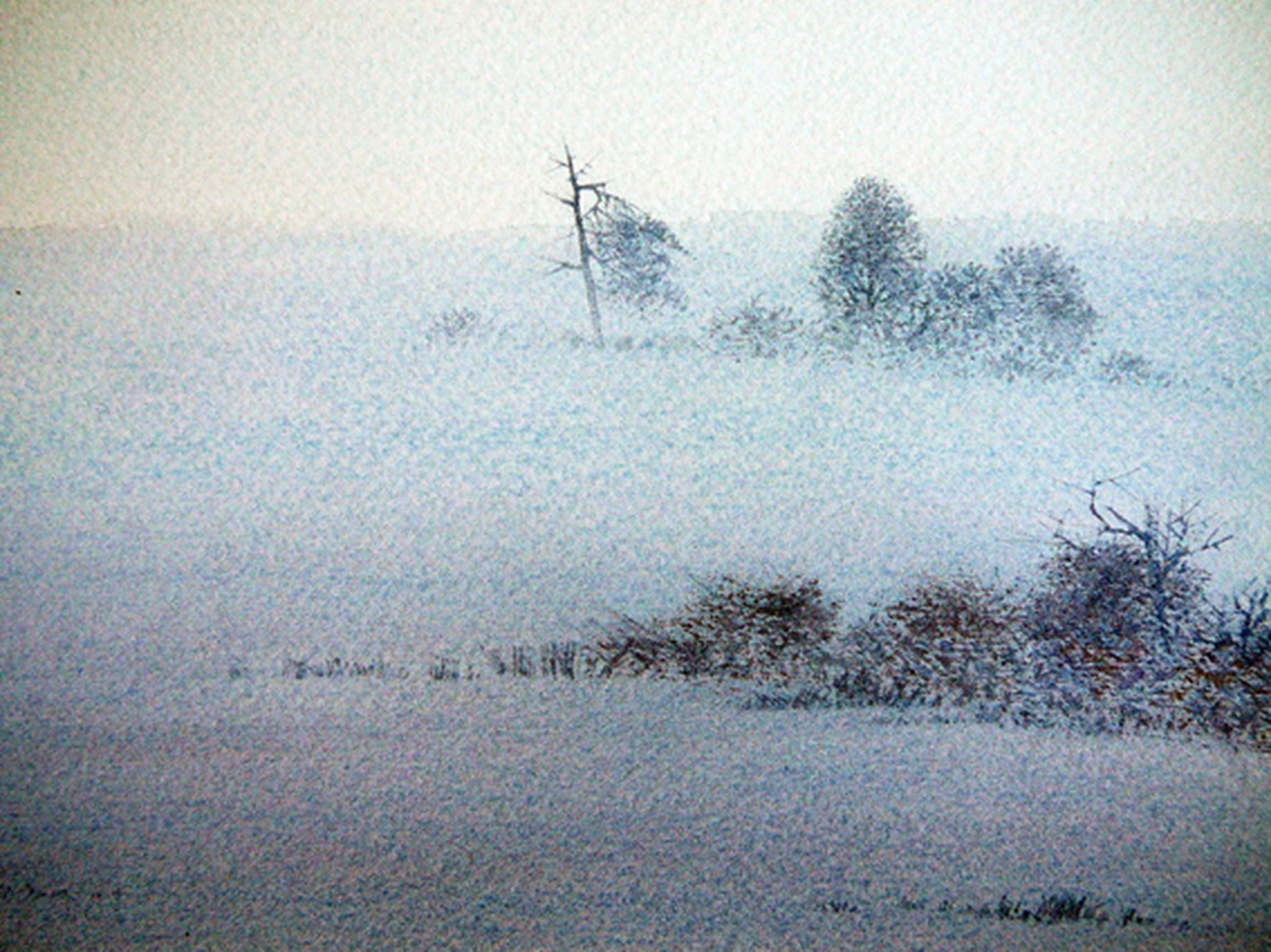 Mooi landschap gehuld in de nevel van de Amsterdamse kunstenaar Denkor (A.J. Kooter), rechtsonder gesigneerd in de aquarel en gedateerd 1984. Losbladig verzenden of af te halen in Utrecht met gratis wissellijst.