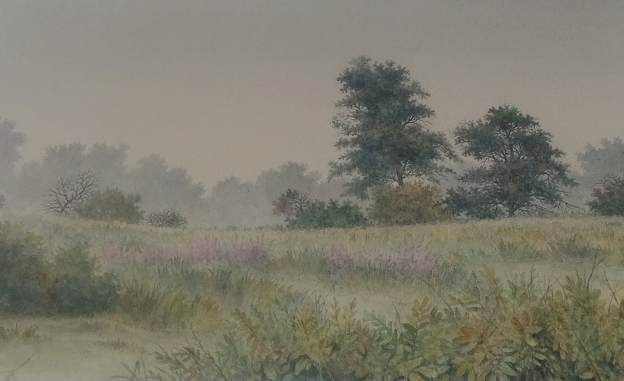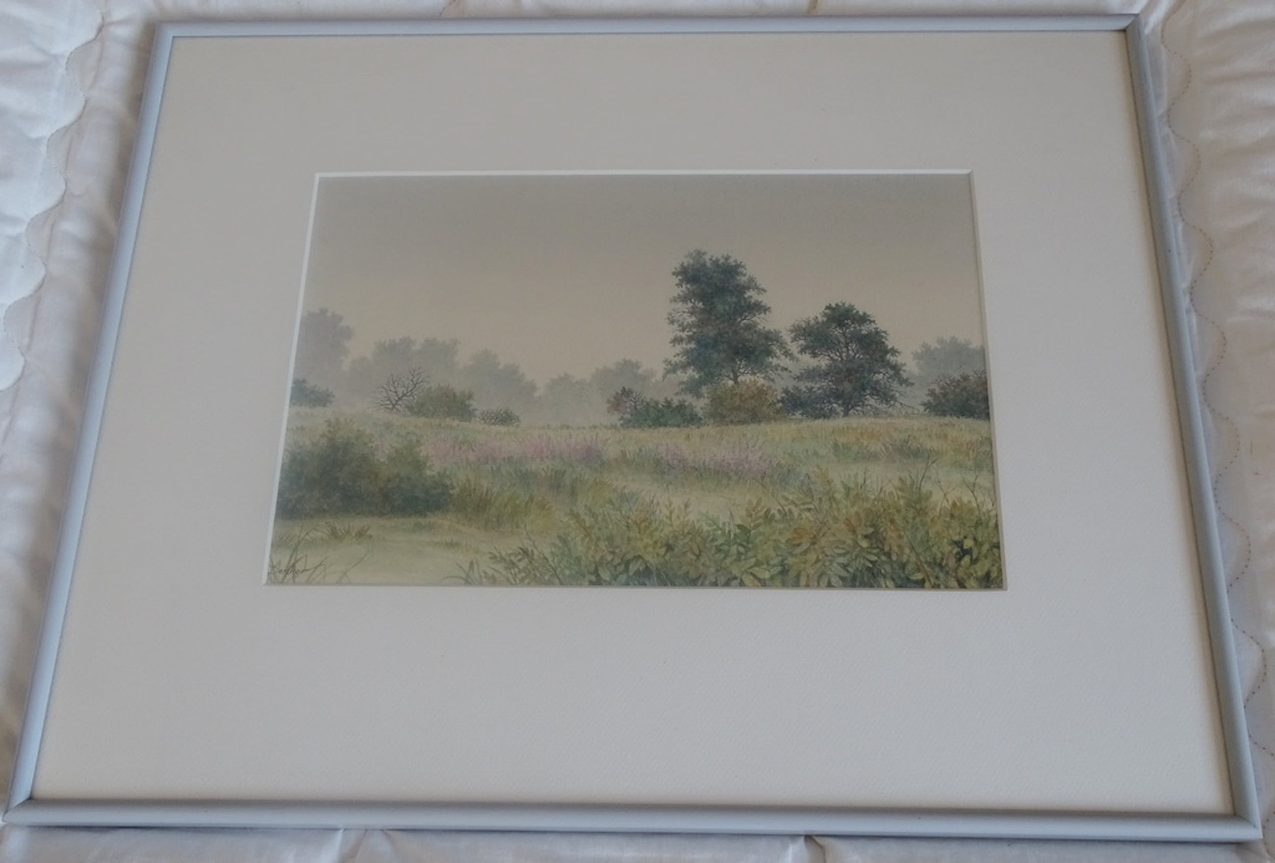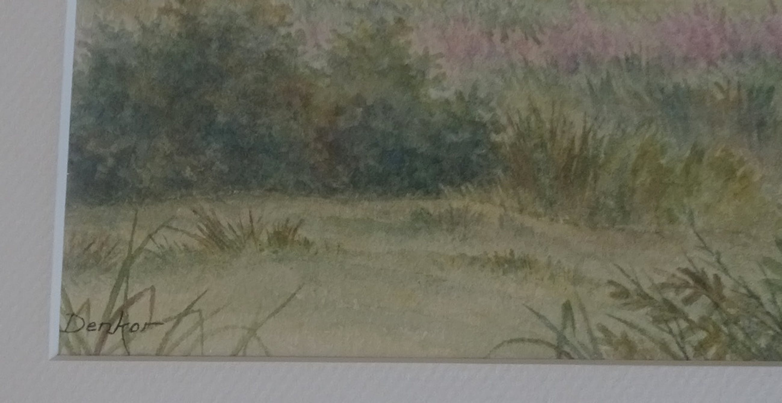 Sfeervol landschap gehuld in een lichte nevel van de Amsterdamse kunstenaar Denkor (A.J. Kooter), linksonder gesigneerd in de aquarel. Kooter was gefascineerd door het Utrechts rivierenlandschap rondom de Kromme Rijn en het landgoed Amelisweerd.