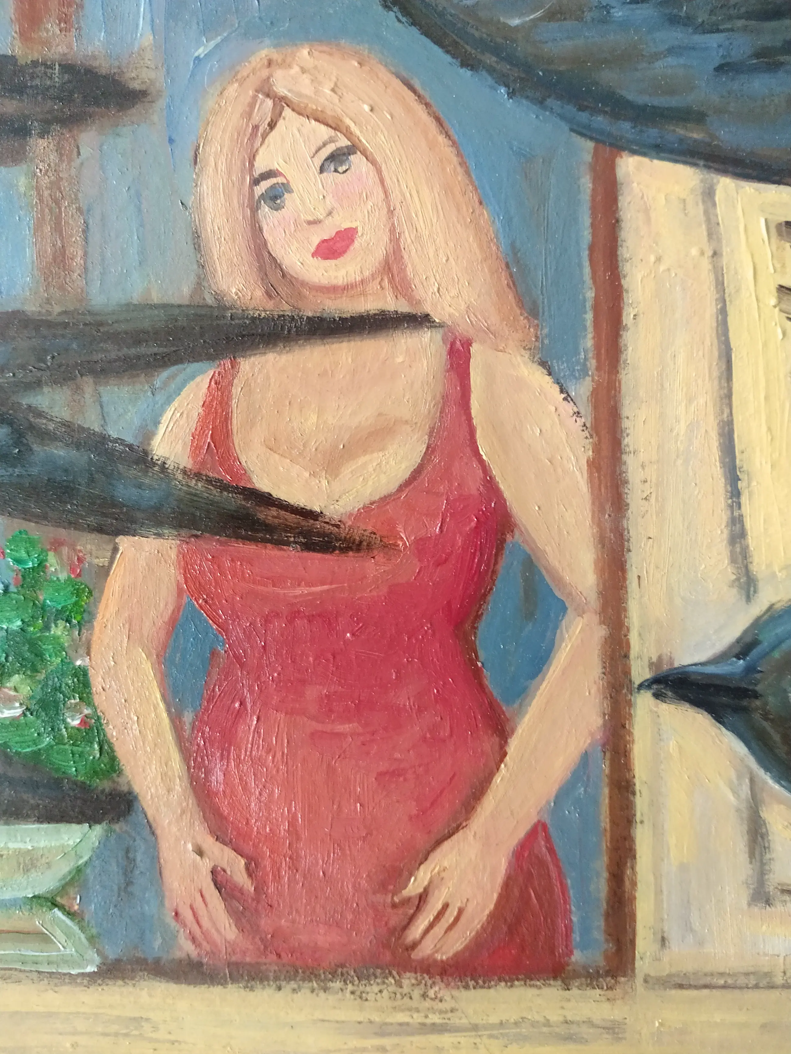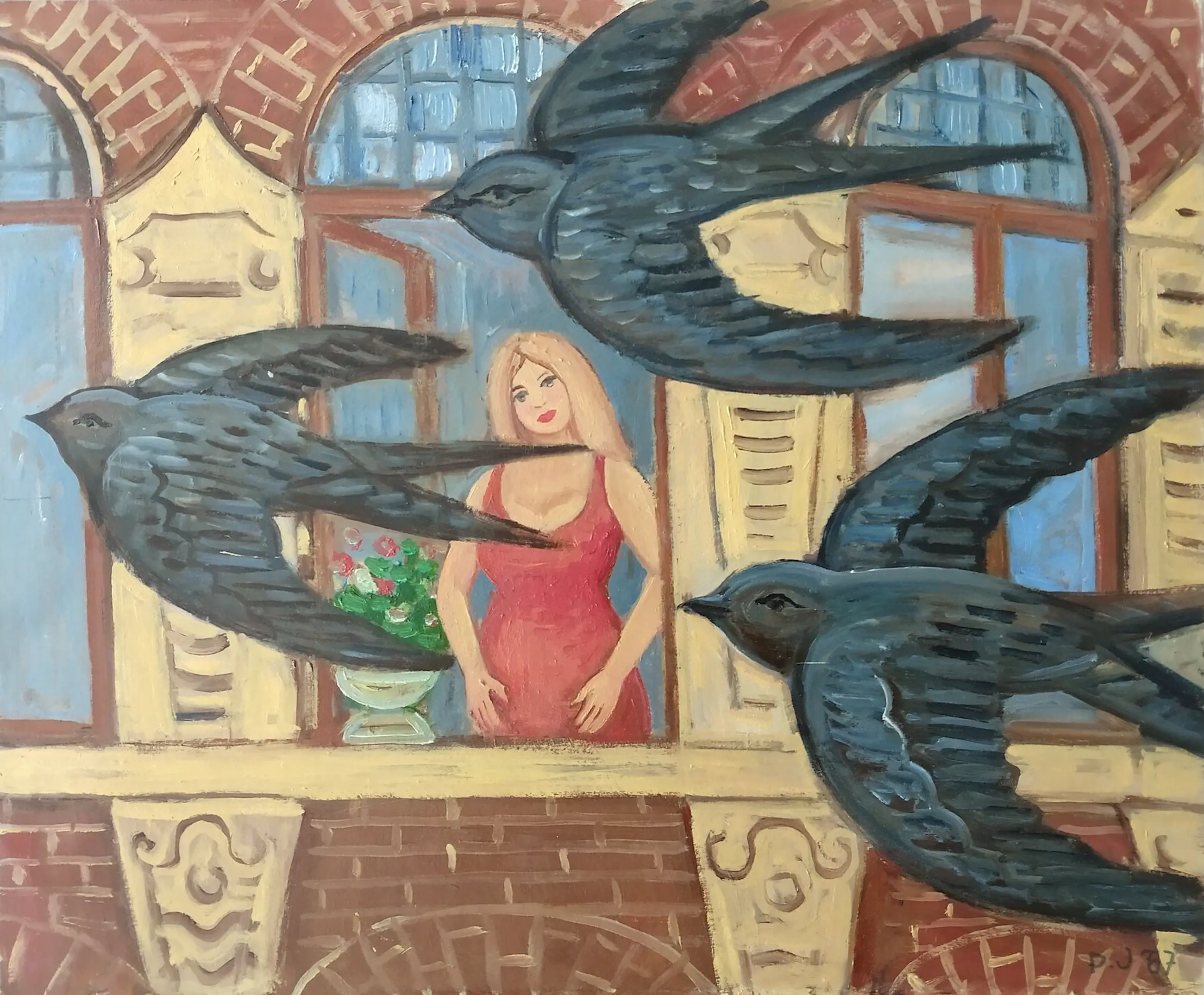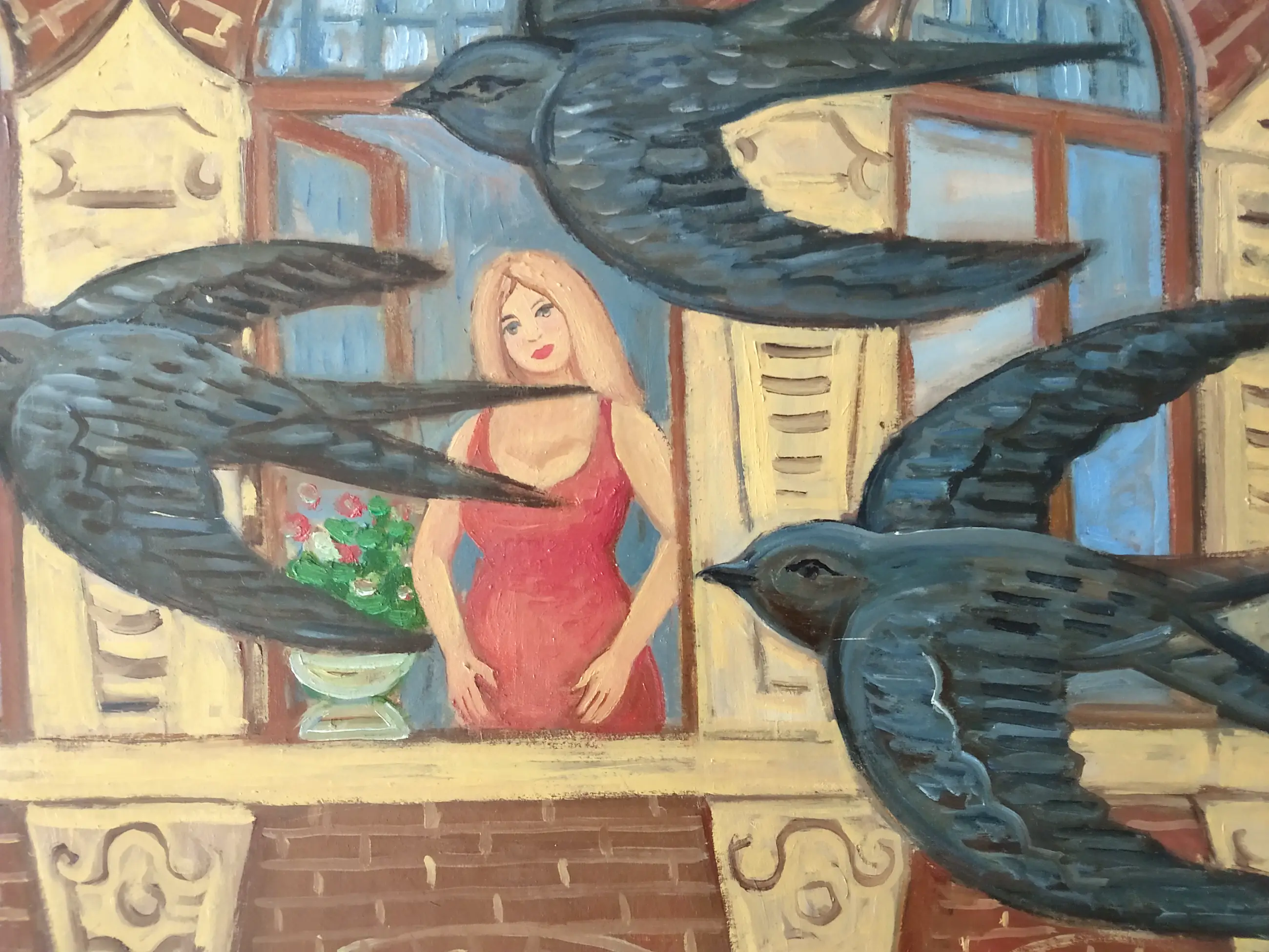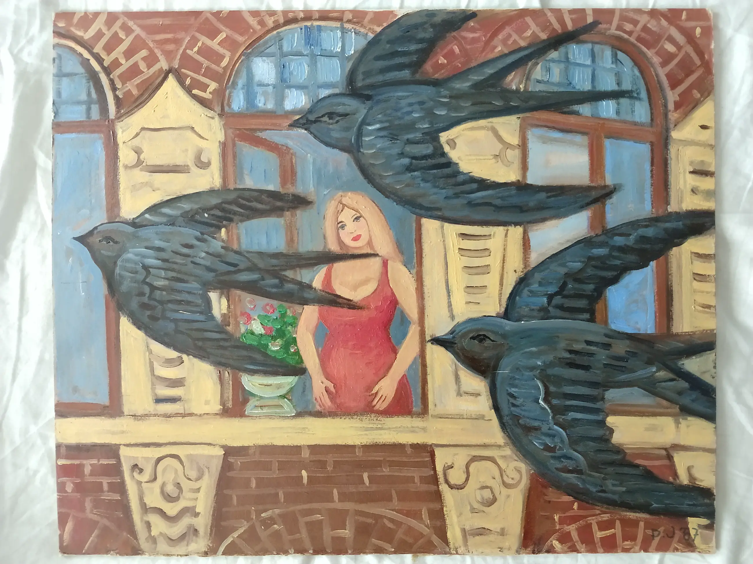 Denny Jacobs. Gierzwaluwen voor het raam. Olieverf op board. Gesigneerd en gedateerd 1987. Afmeting 35x42 cm.