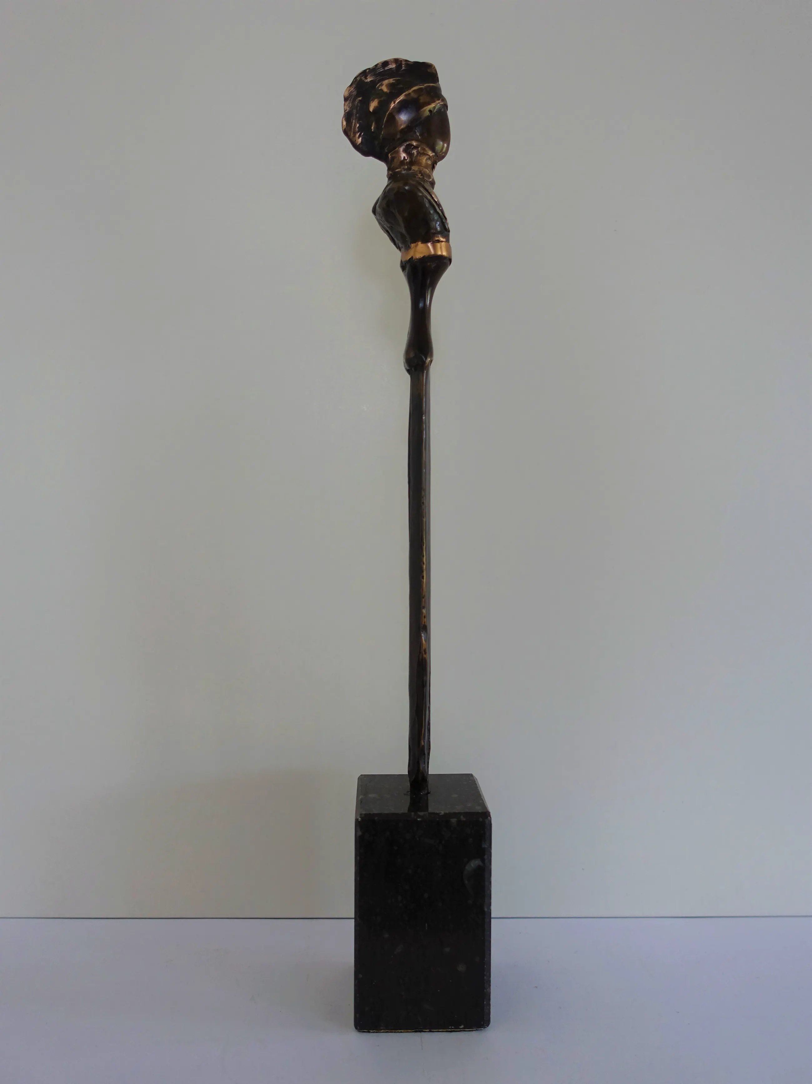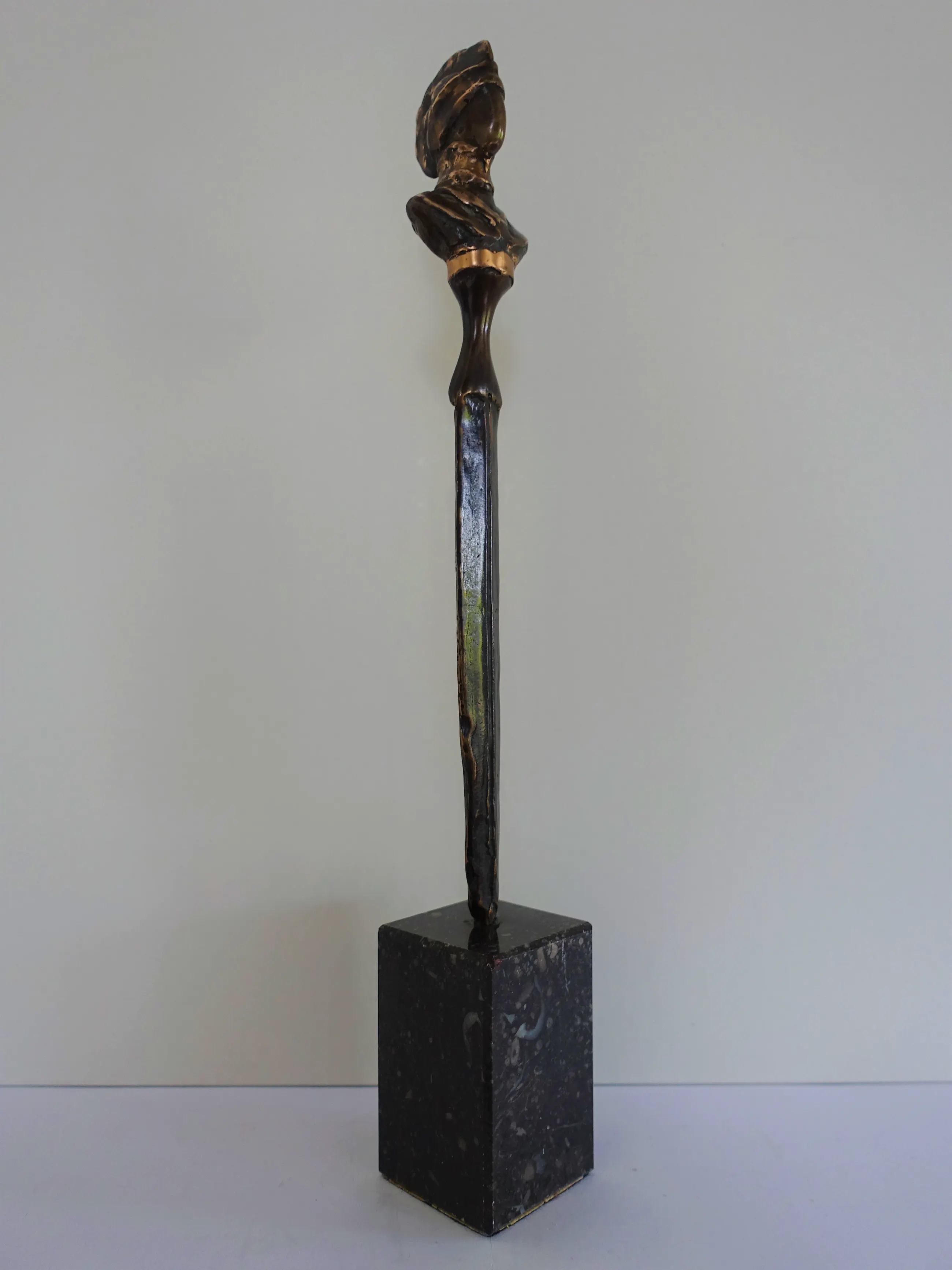 Zeer fraai stukje "zwaardkunst" van Désirée Tonnaer. Haar beelden komen slechts zelden te koop. Werken van Désirée Tonnaer zijn veelal geplaatst in de openbare ruimte, maar ook opgenomen in vele particuliere collecties. De vermelde afmetingen zijn INCLUSIEF de sokkel van 8 x5 x5 cm.