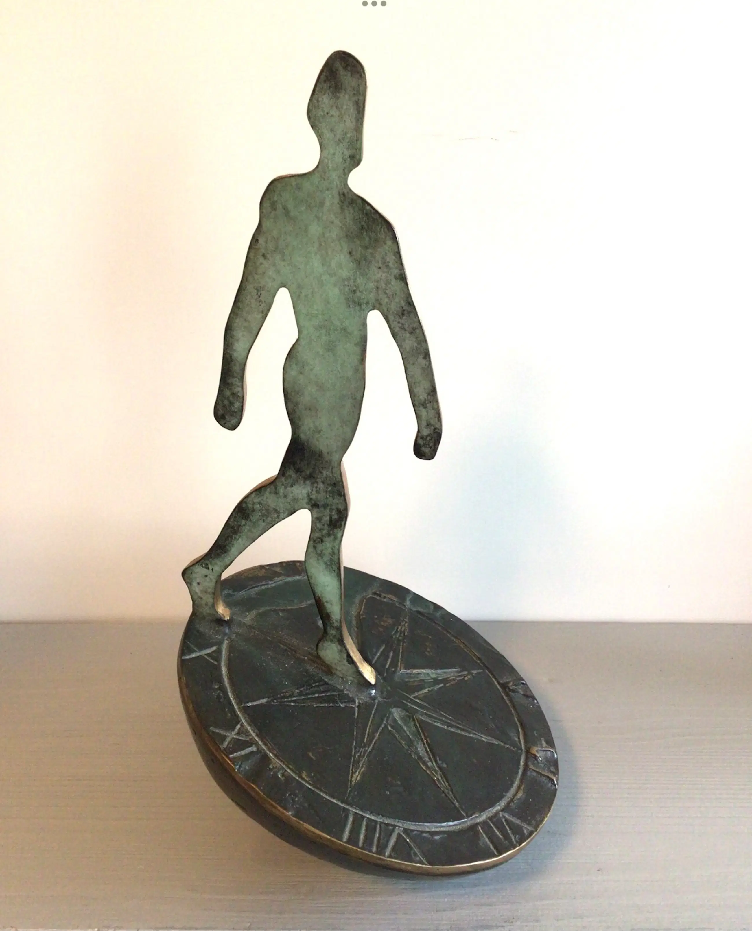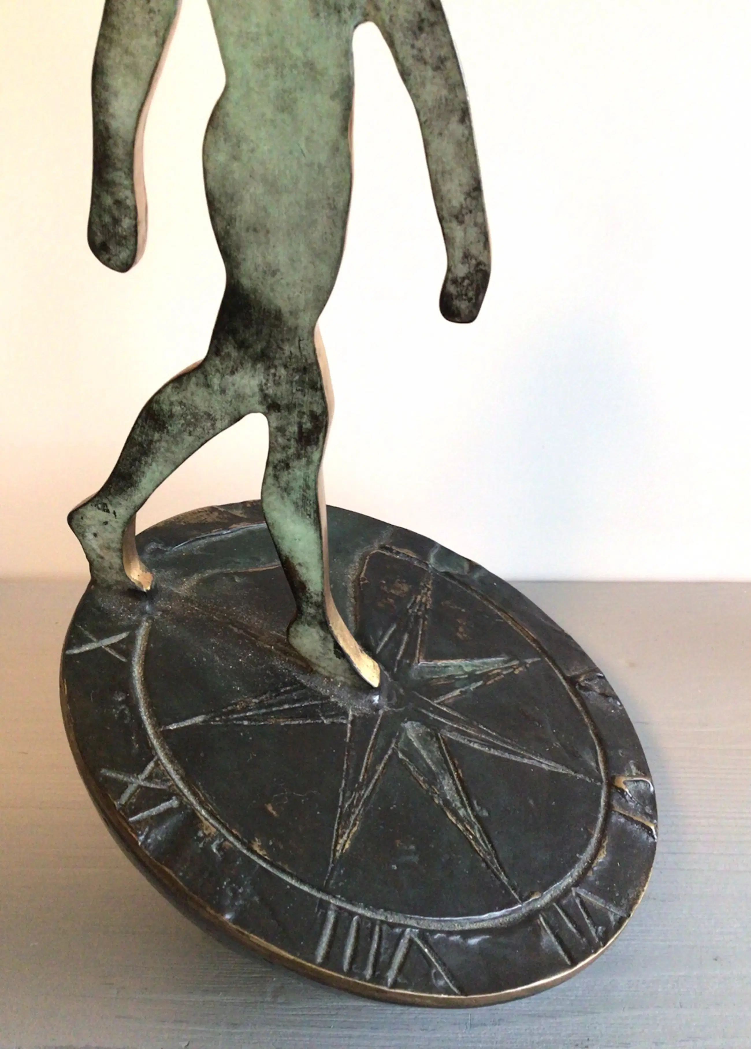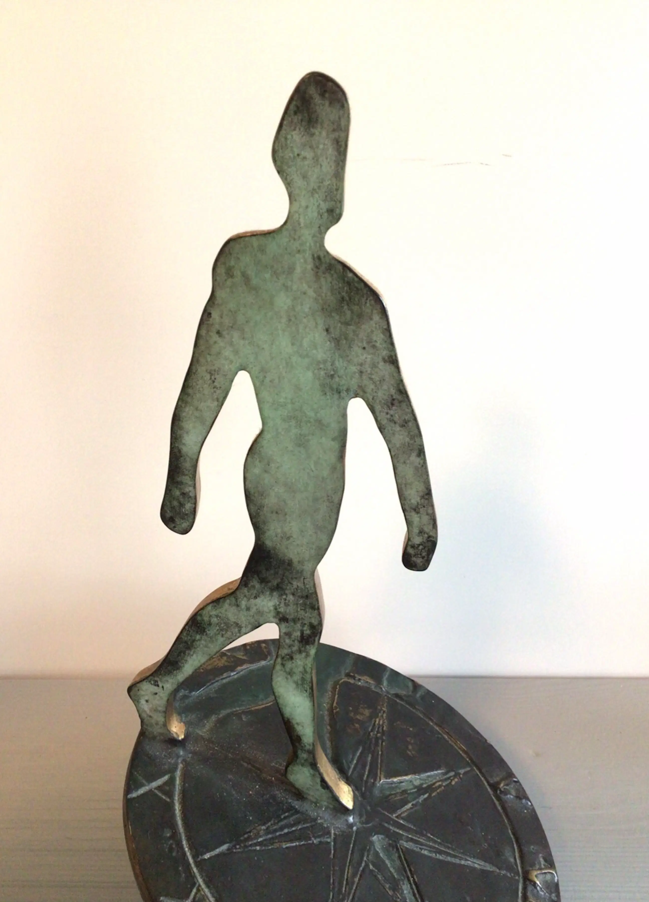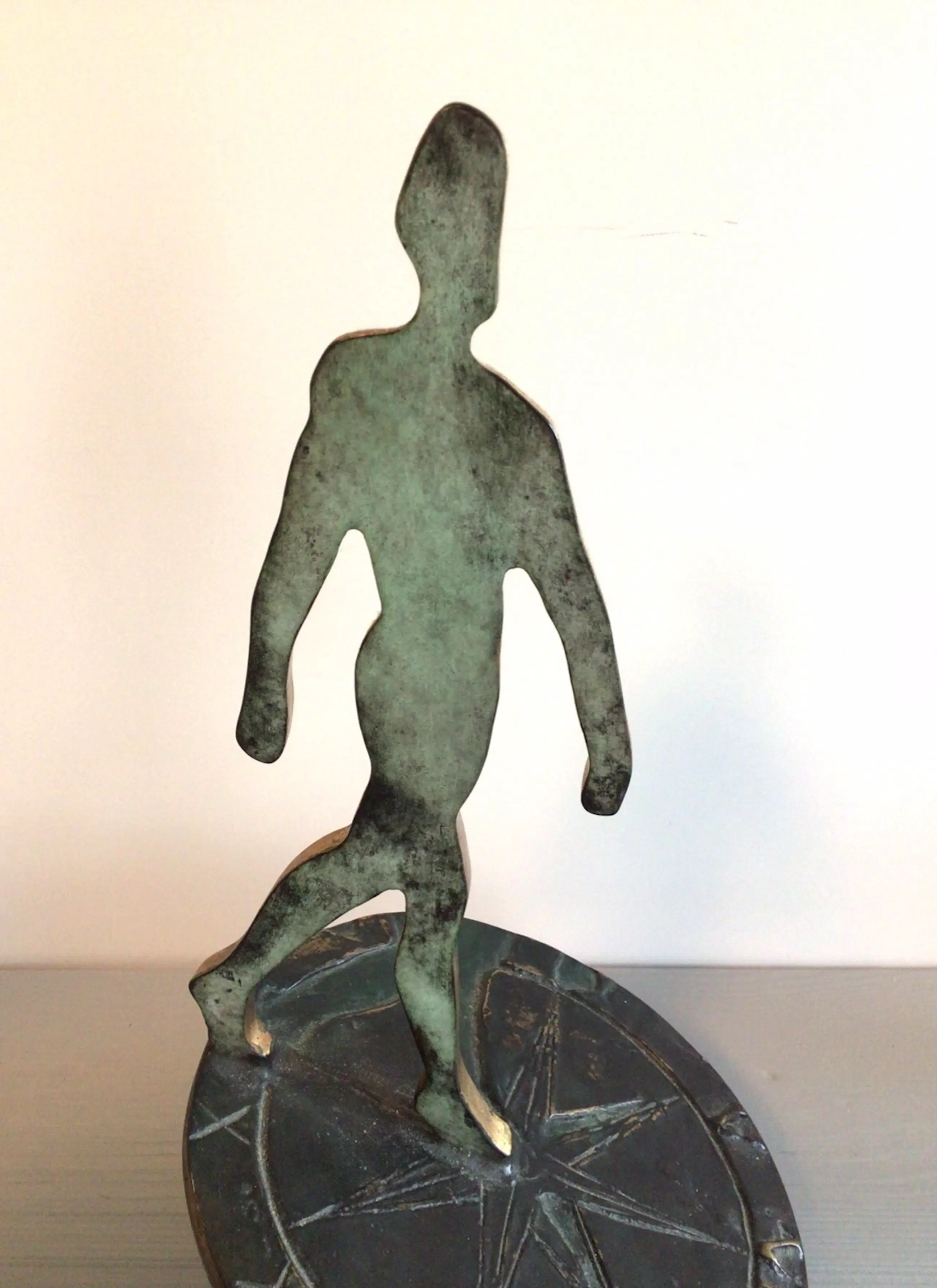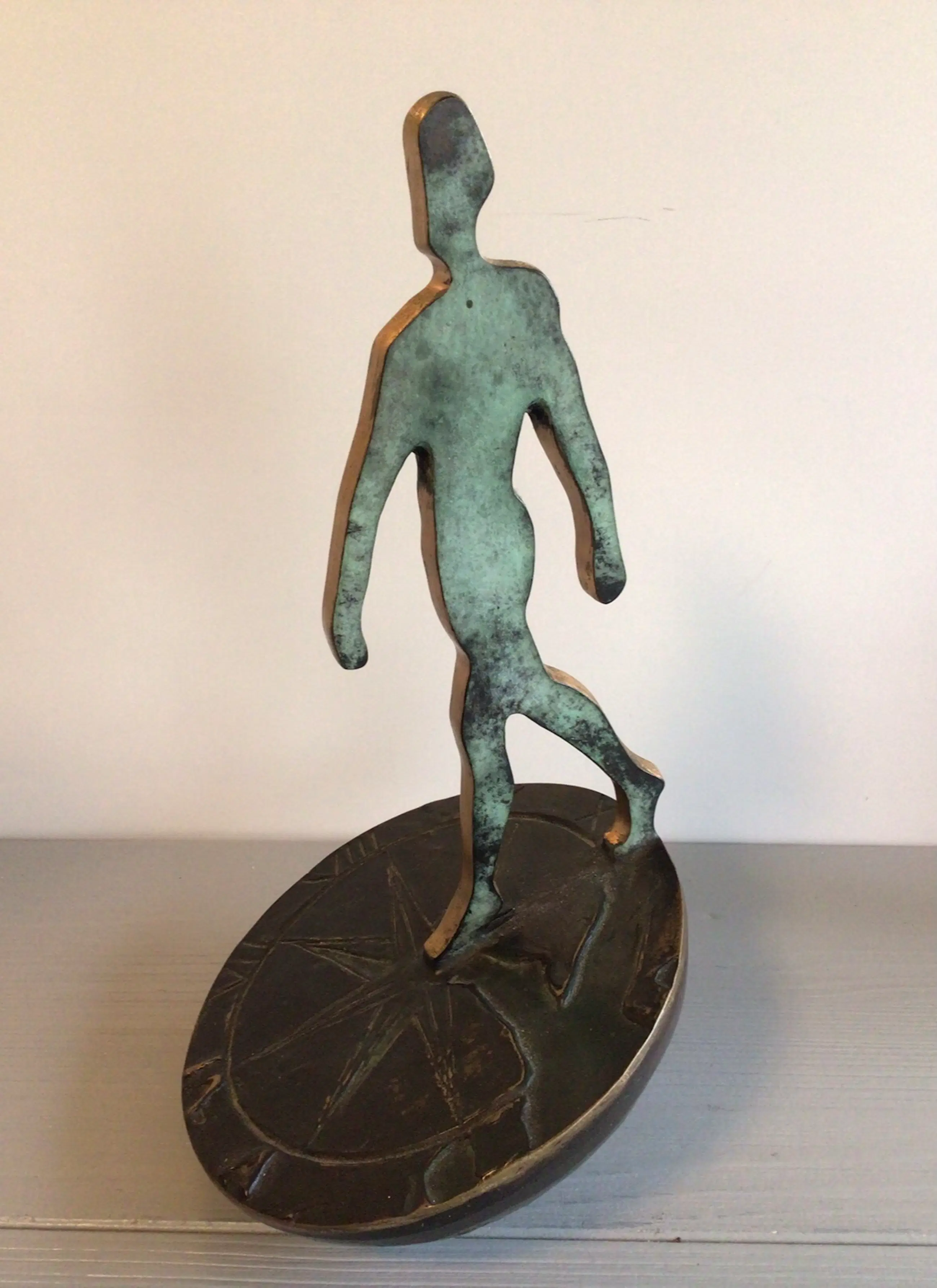 Zeer fraai vormgegeven symbolisch sculptuur van een mensfiguur lopend op een zonnewijzer. Het betreft het bekende logo van Rabobank Nederland. Het betreft de grotere versie, er zijn ook kleinere varianten in de omloop. Kunstenares: Desiree Tonnaer. Materiaal: brons Hoogte : 26 cm Het beeld verkeert in zeer goede staat en wordt zorgvuldig verpakt verzonden.