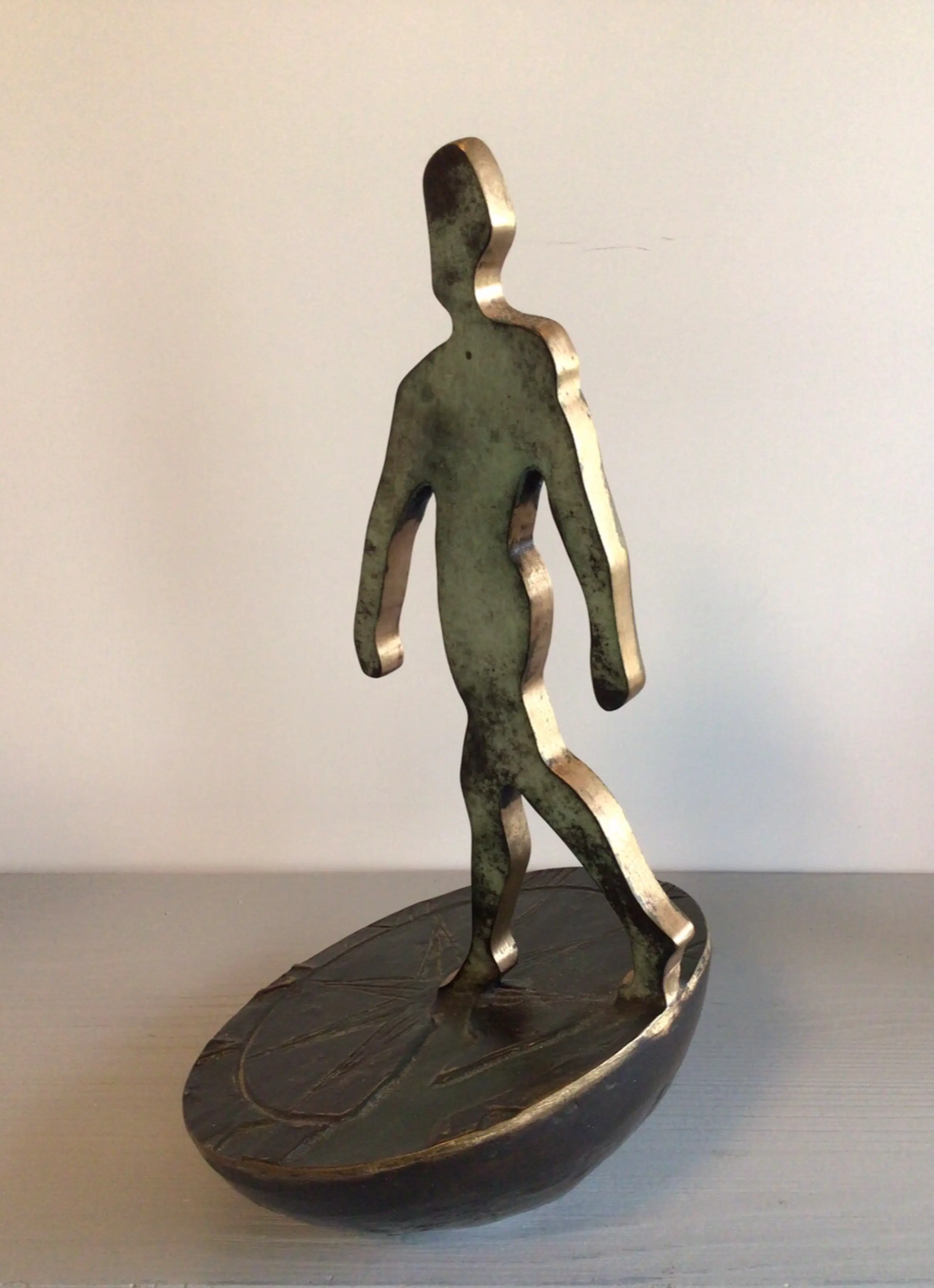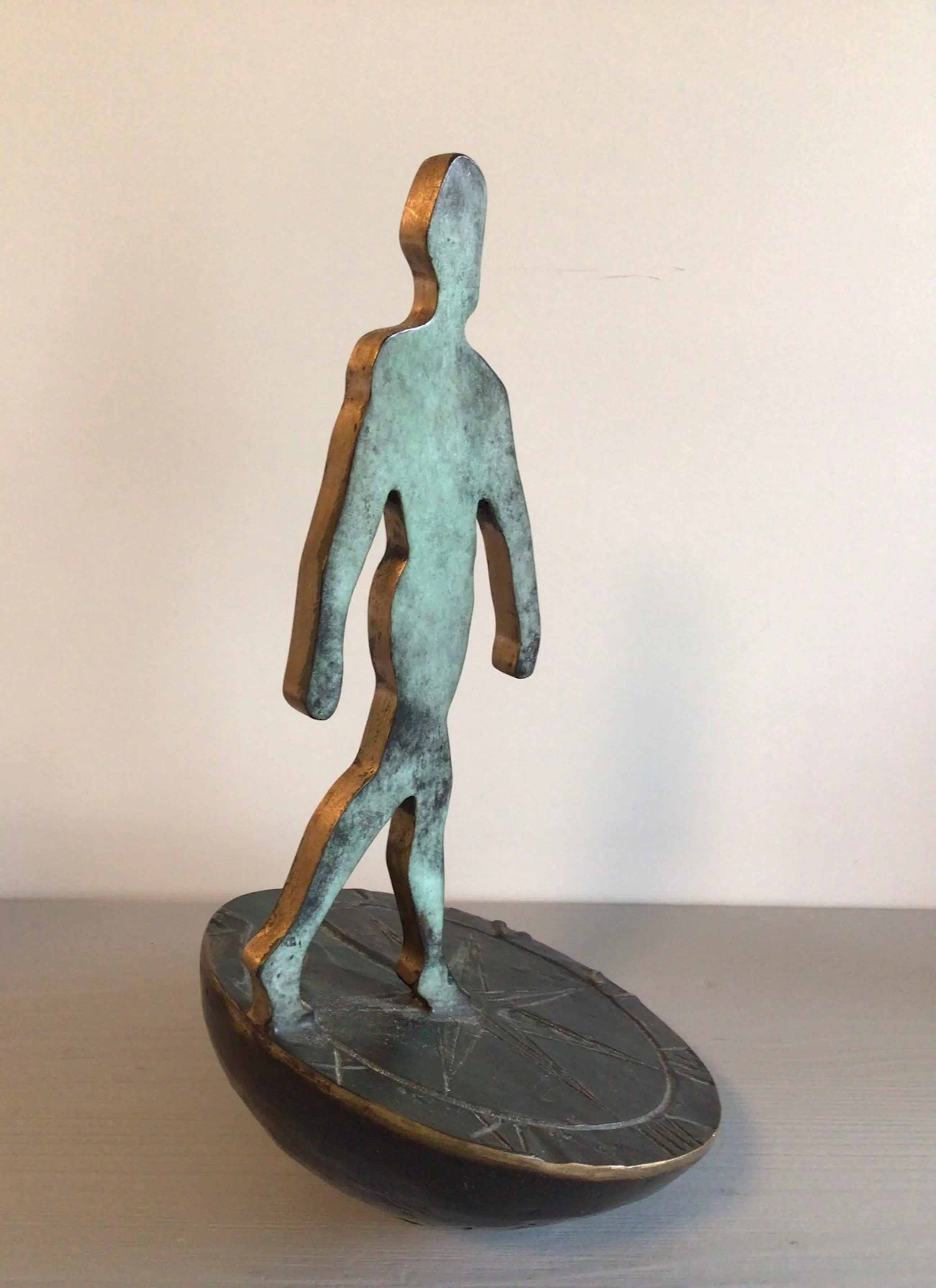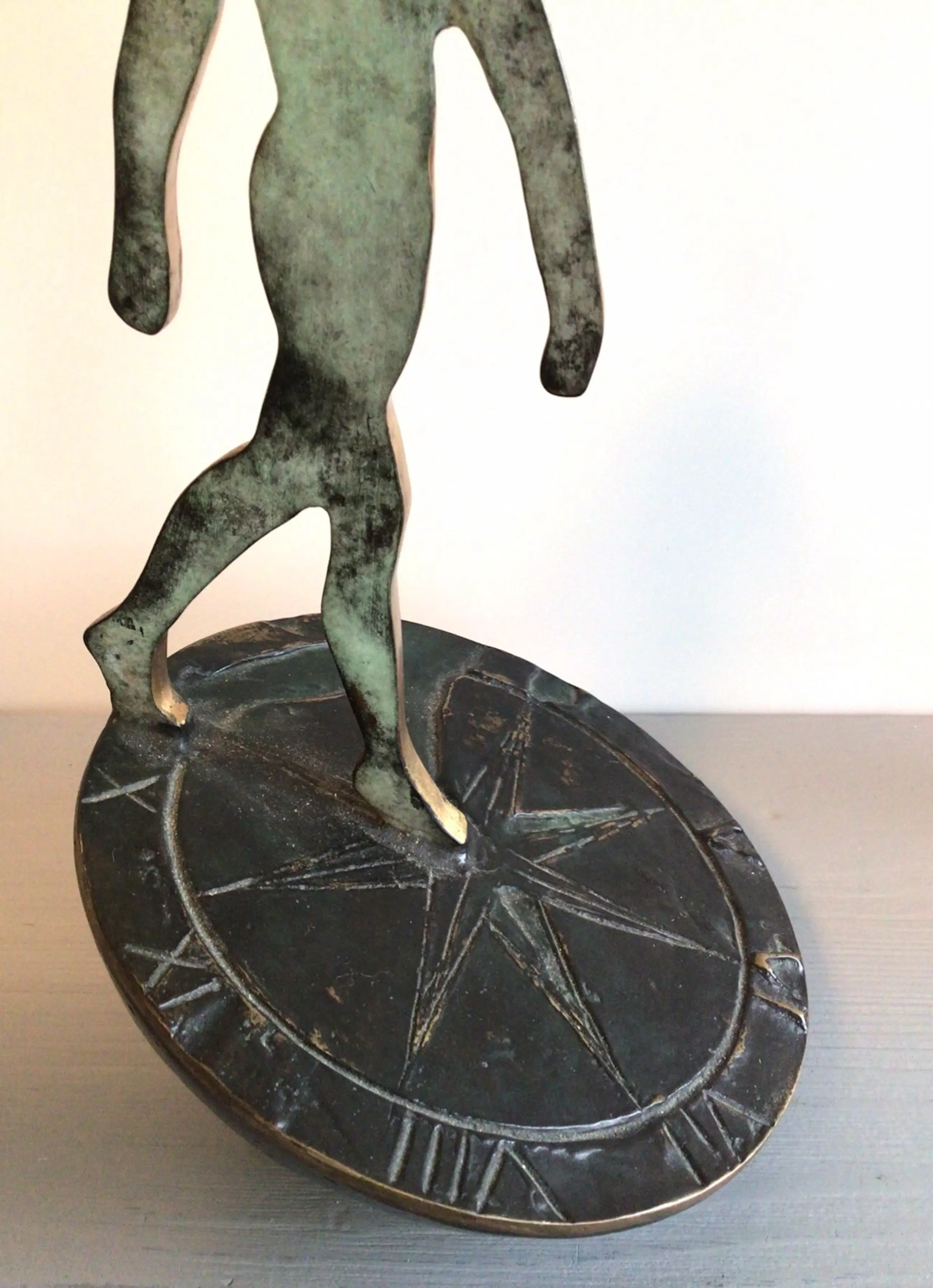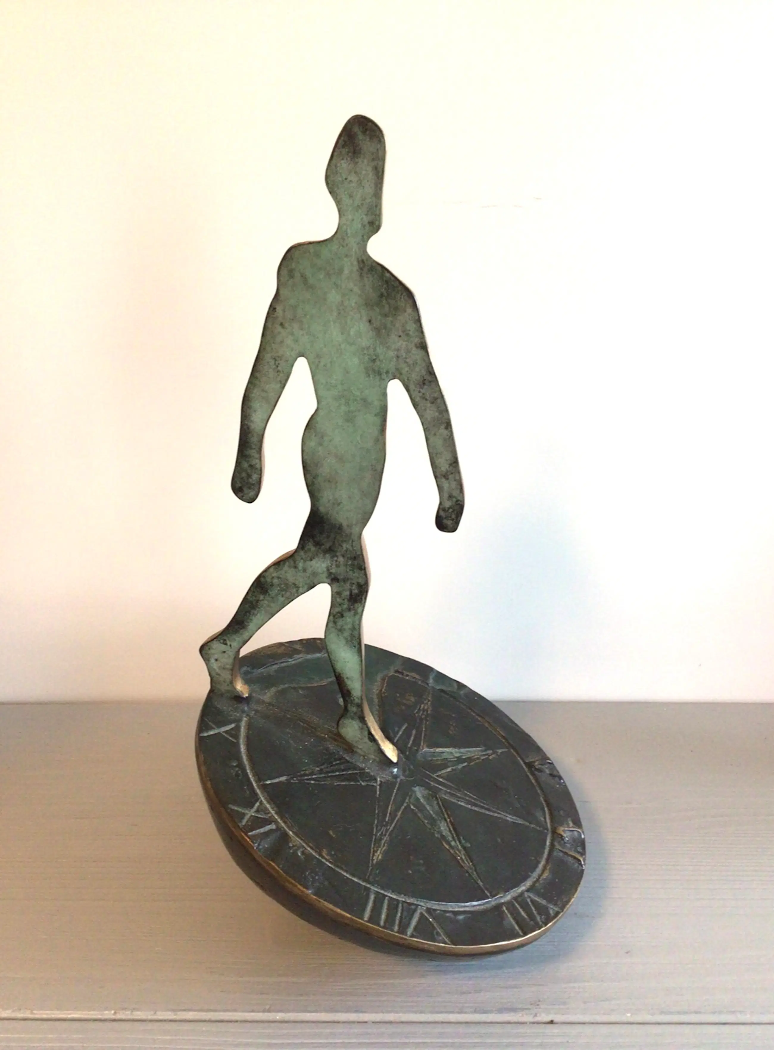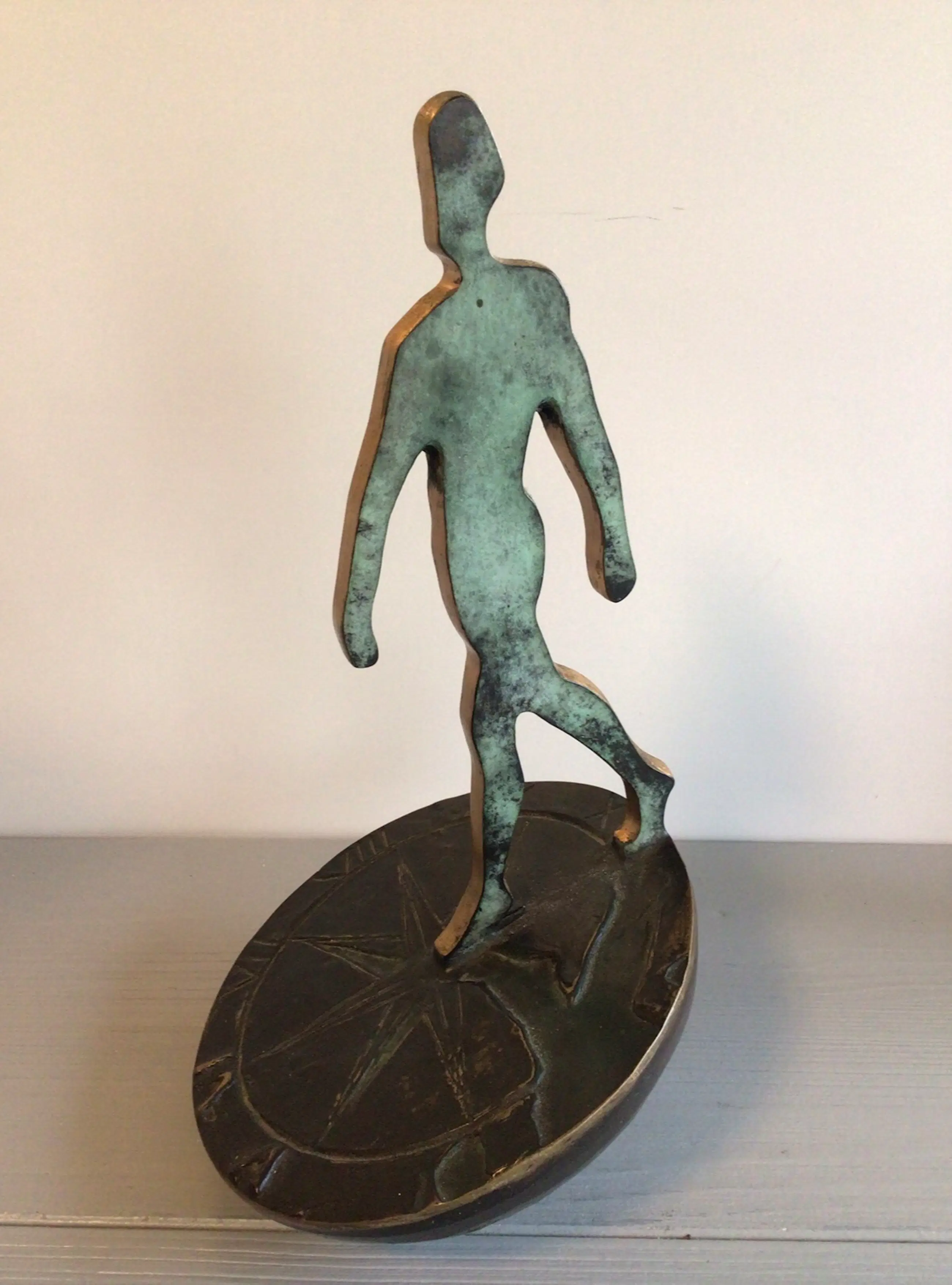 Zeer fraai vormgegeven symbolisch sculptuur van een mensfiguur lopend op een zonnewijzer. Het betreft het bekende logo van Rabobank Nederland. Het betreft de grotere versie, er zijn ook kleinere varianten in de omloop. Kunstenares: Desiree Tonnaer. Materiaal: brons Hoogte : 26 cm Het beeld verkeert in zeer goede staat en wordt zorgvuldig verpakt verzonden.