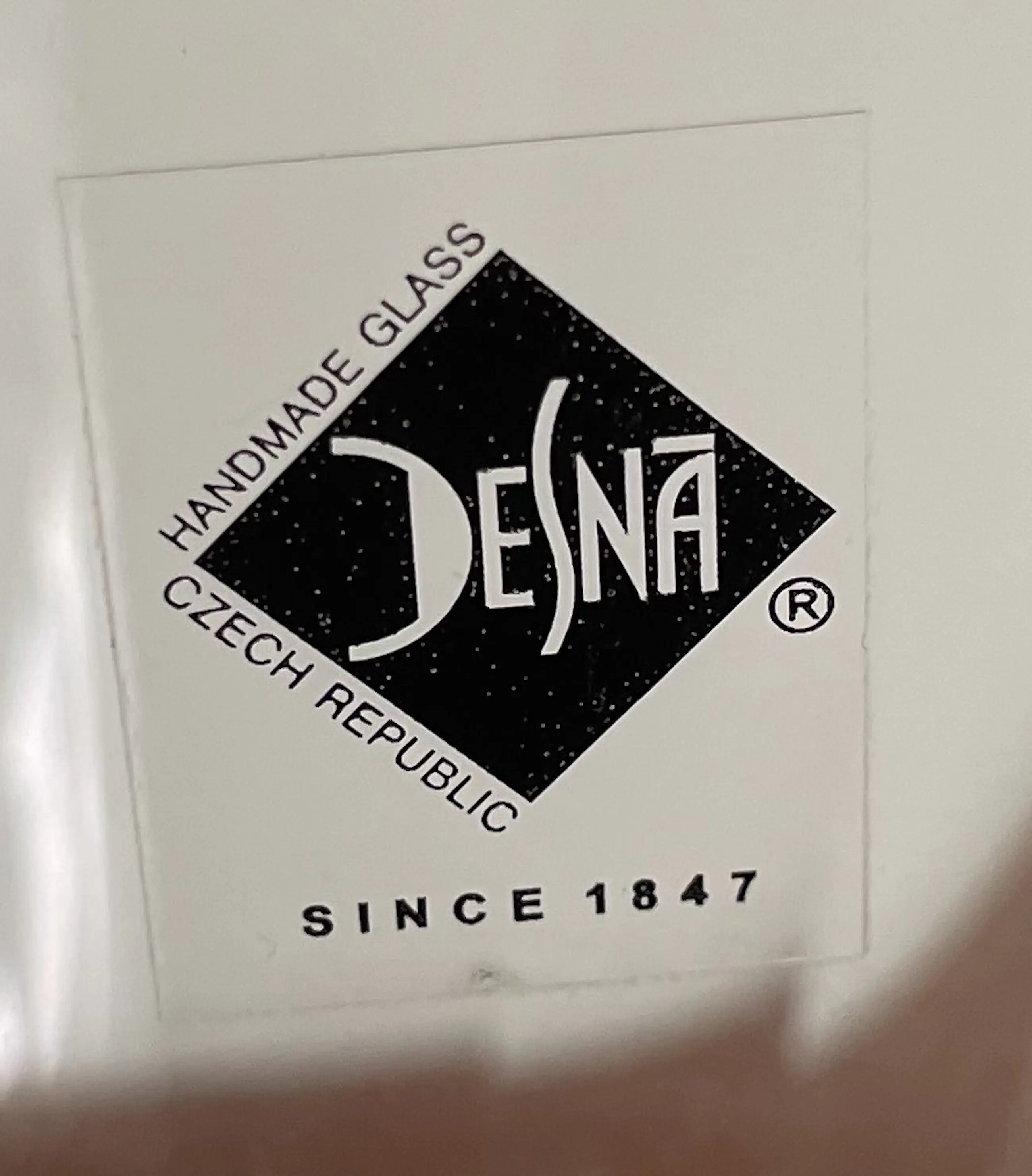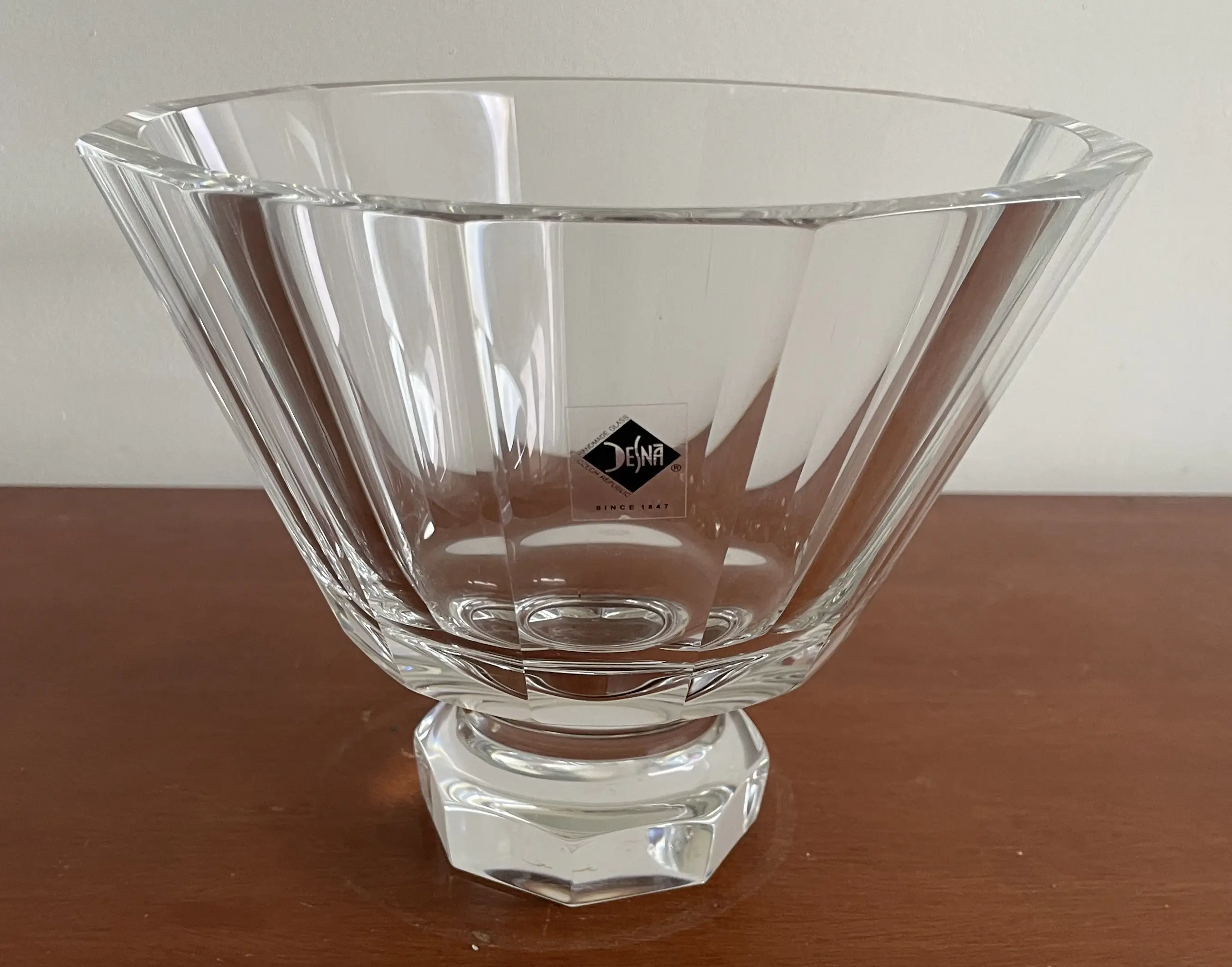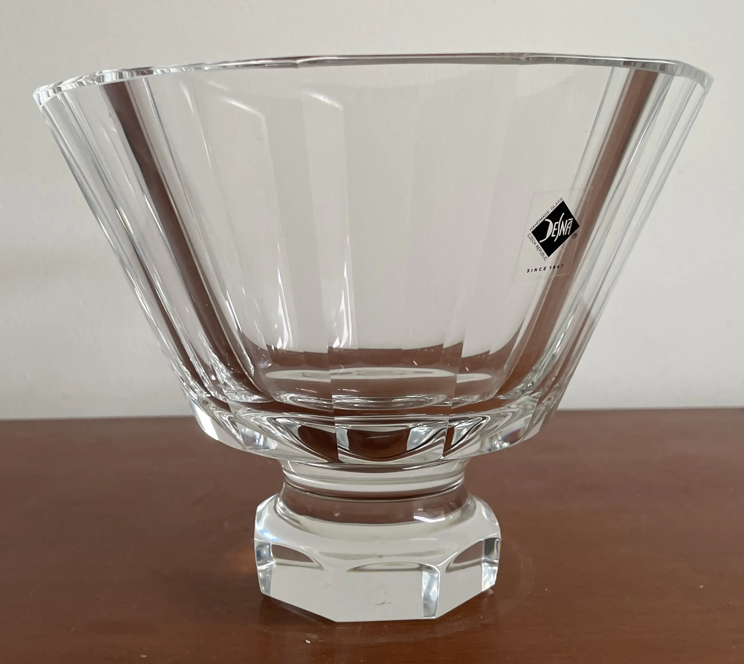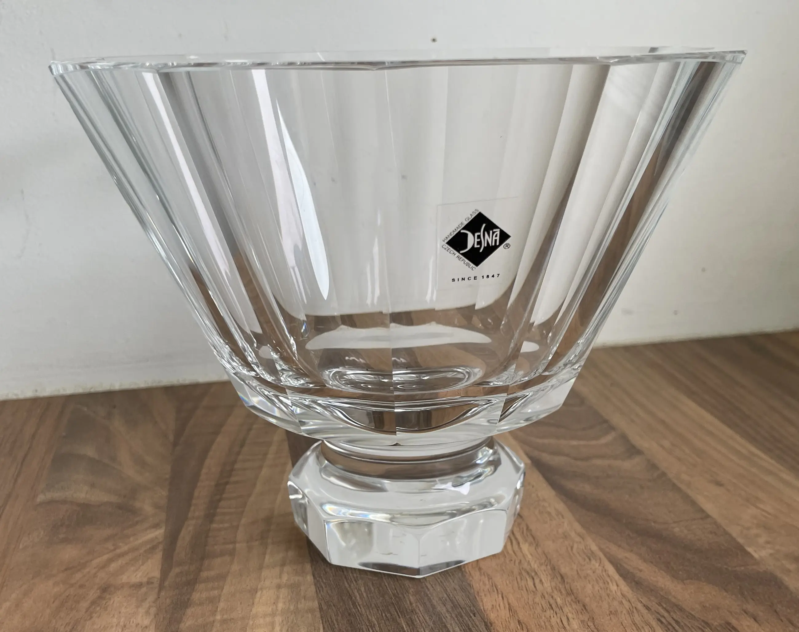 Facet geslepen kristallen kom of vaas op voet van Desna in Bohemen in tegenwoordig Tsjechië. In perfecte conditie. Voorzien van etsmerk onderaan en merklabel op de kom.
