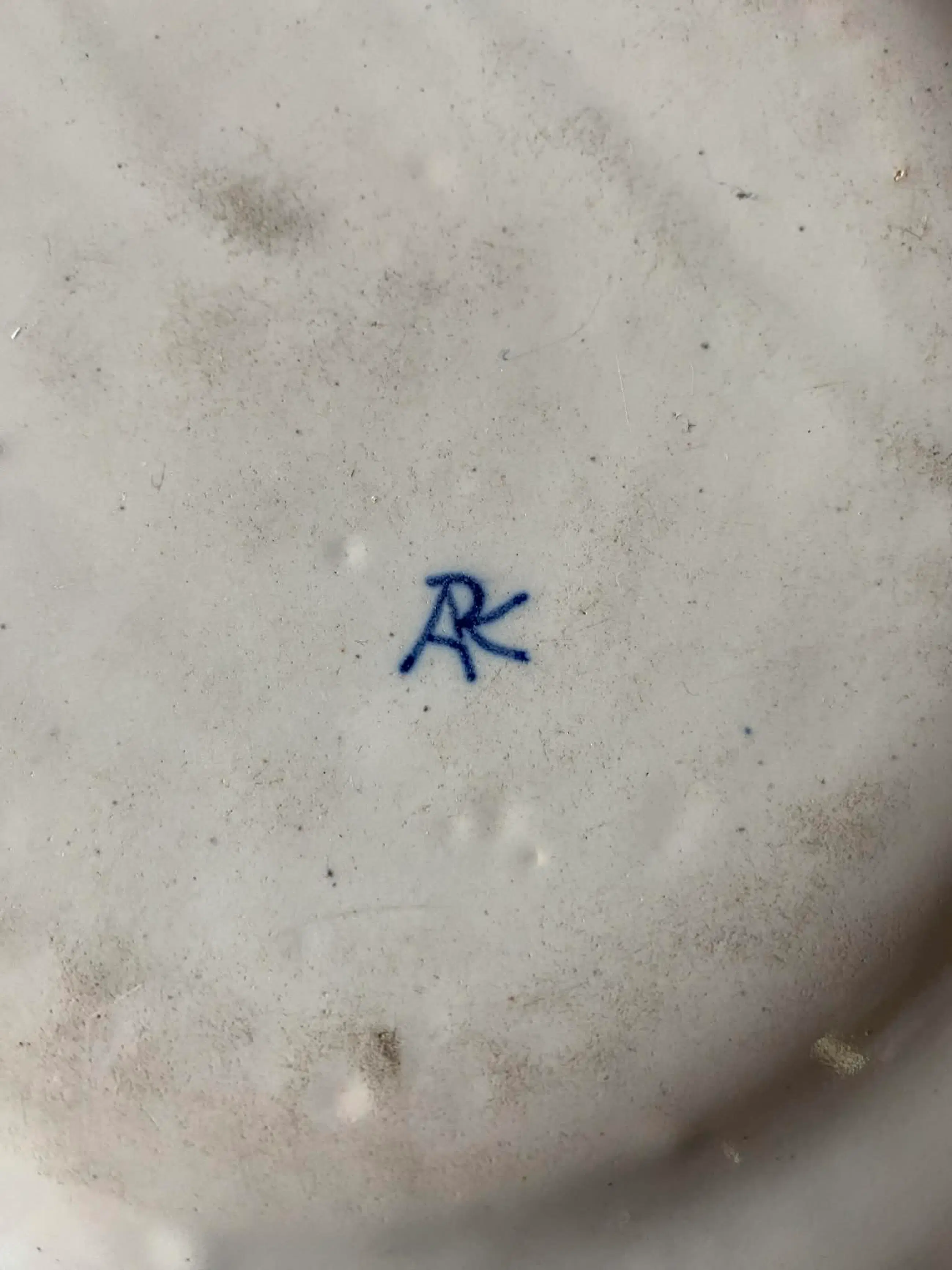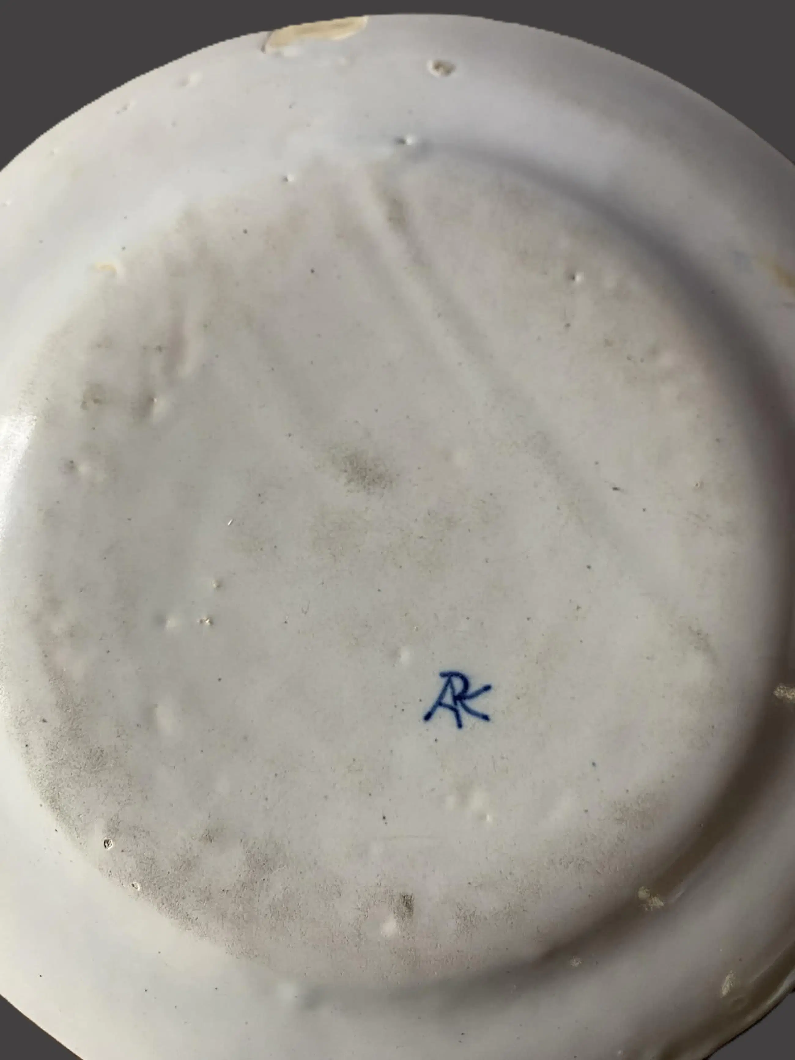 Op de achterzijde voorzien van een blauw “APK”-merk, een historiserende signatuur die in de 19e eeuw vaak werd toegepast als verwijzing naar vroeg Delfts aardewerk. Dit type merk komt veelvuldig voor op faience uit Desvres, een belangrijk productiecentrum dat bekend stond om zijn kwalitatieve “Delft revival” stukken.