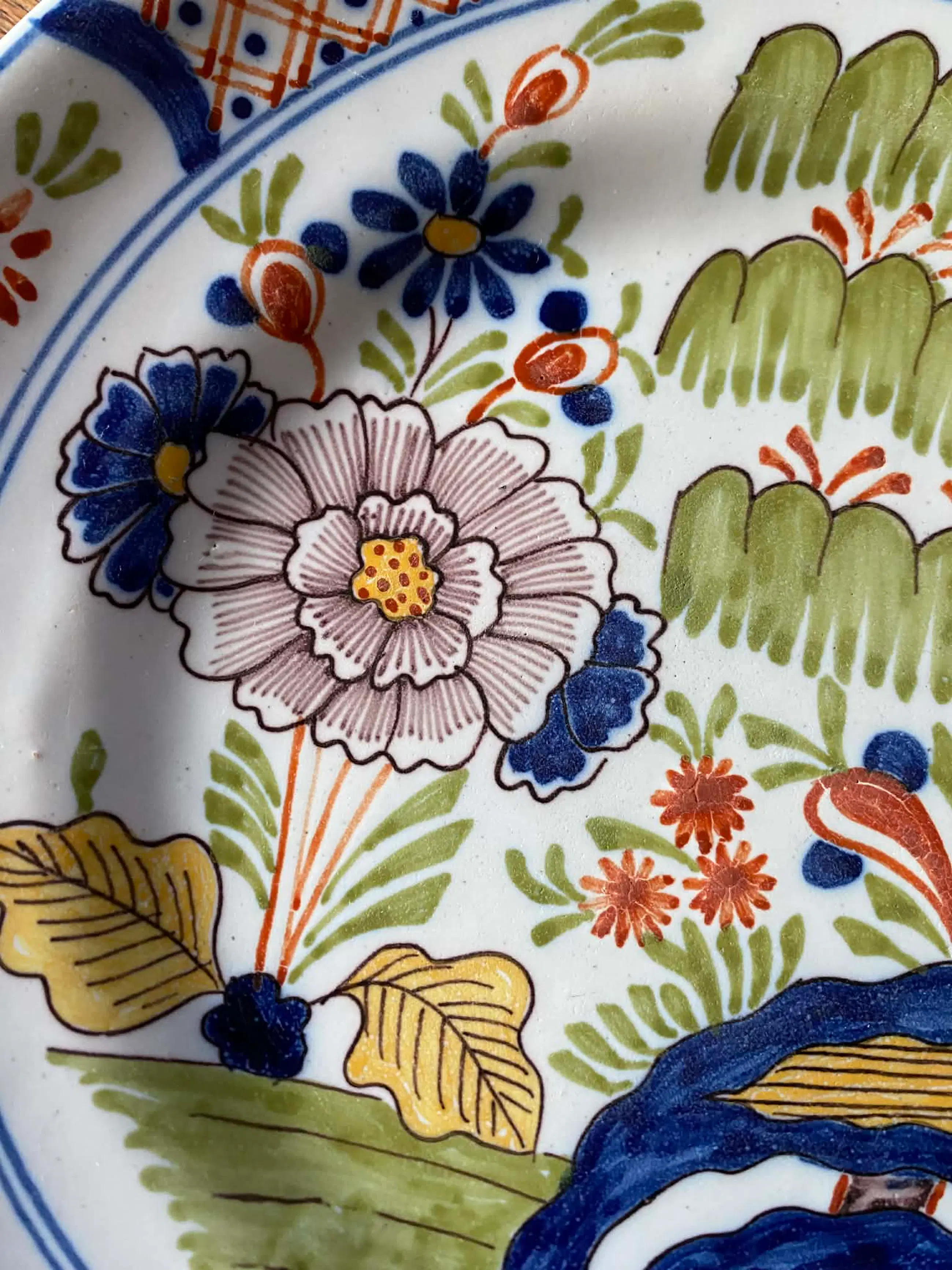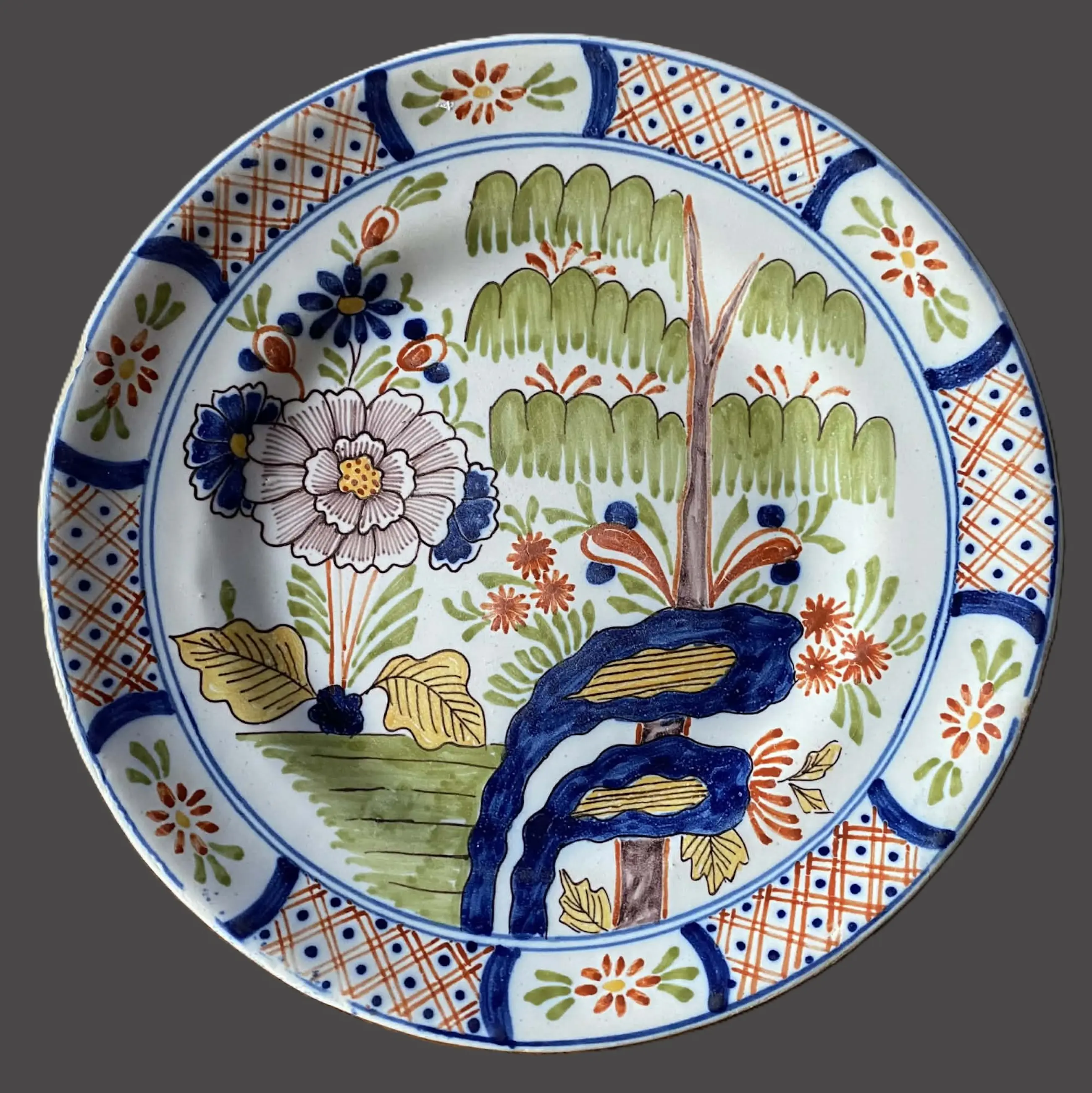 Handbeschilderd faience bord met polychroom decor in de traditie van Delfts aardewerk. Centraal een charmant, vrij geschilderd landschap - Chinoiserie - met boom en bloemmotieven, uitgevoerd in kobaltblauw, groen en ijzerrood/oranje. De rand is rijk versierd met een afwisseling van geometrische motieven en kleine bloemen in vakverdeling.