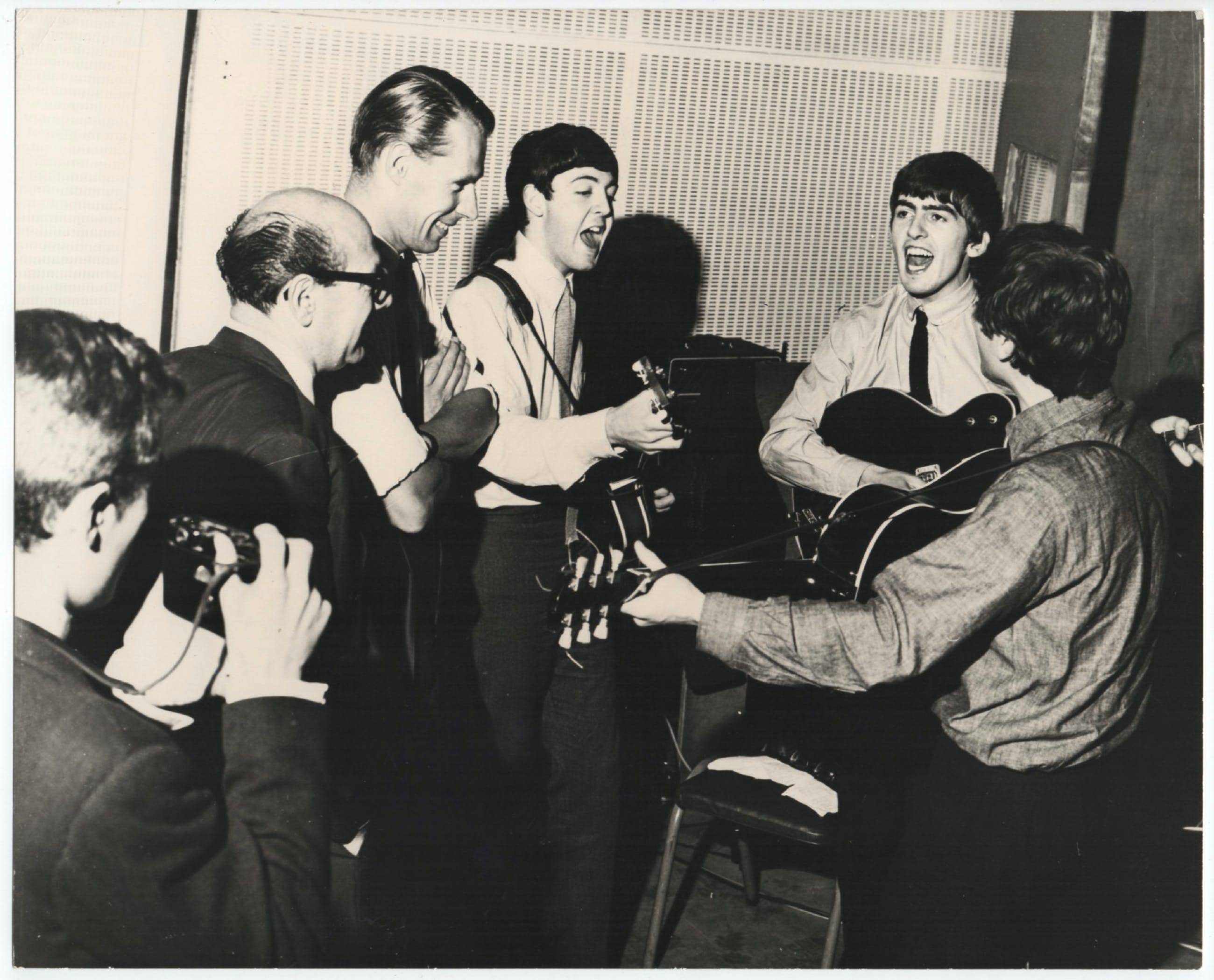 Vintage foto van de opname van “She loves You” door de Beatles in de EMI studio in Londen op 1 juli 1963. Gelatinezilverdruk, in verso gesigneerd door de fotograaf, Dezo Hoffmann, en met stickers van verdere duiding voorzien. In zeer goede conditie.