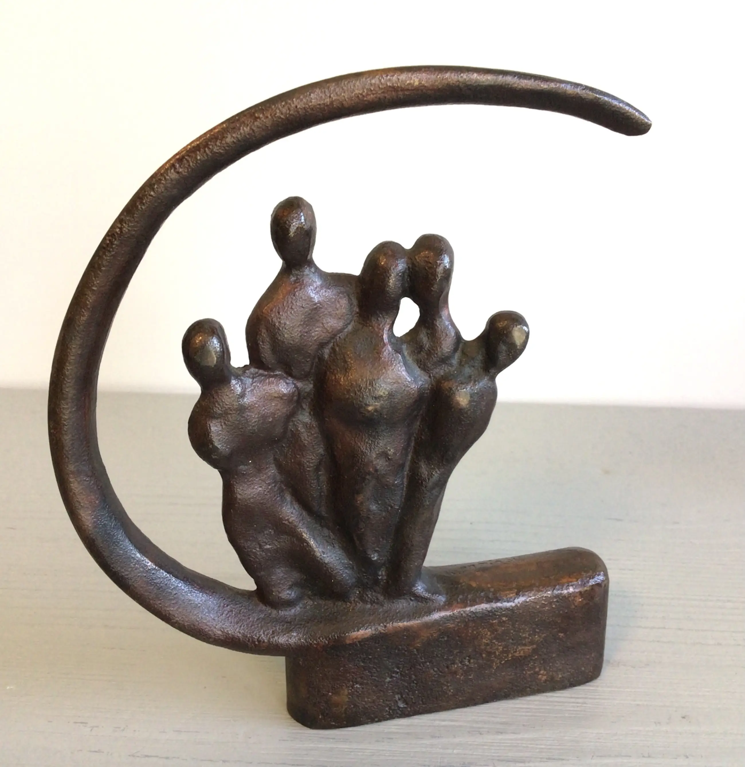 Zeer fraai vormgegeven en zeldzaam sculptuur van een vijftal mensfiguren die samen schuilen onder een halve cirkel, een vertederend tafereel Titel: “ Happy family “ Kunstenares: Diana Kortbeek Het beeld is gesigneerd op de achterzijde Diana Kortbeek was een kunstenares die altijd op zoek was naar de essentie en eenvoud van vormen, haar beelden zijn figuratief maar ook gestileerd met organische ronde vormen. Het beeld verkeert in zeer goede staat en wordt zorgvuldig verpakt verzonden.