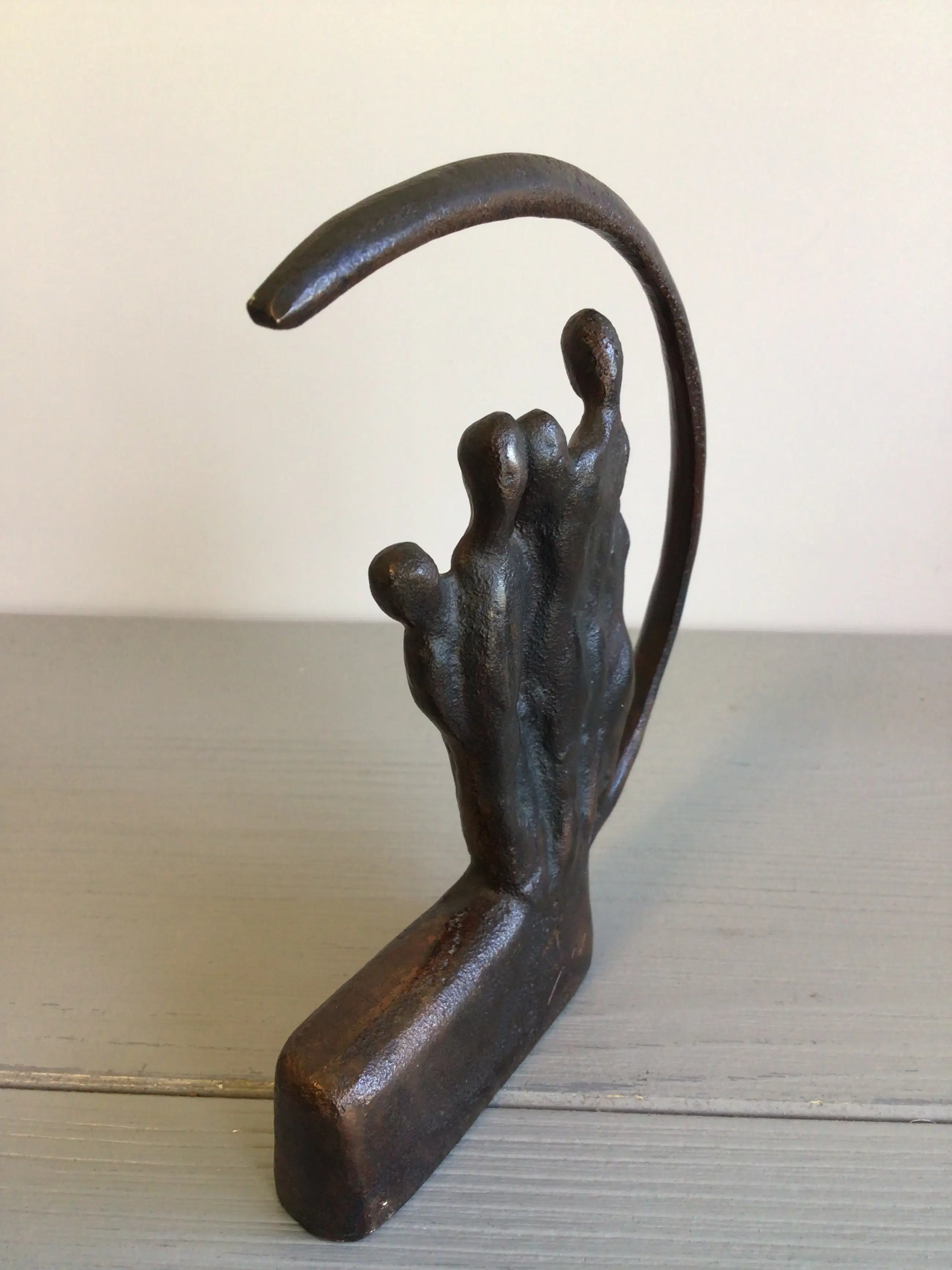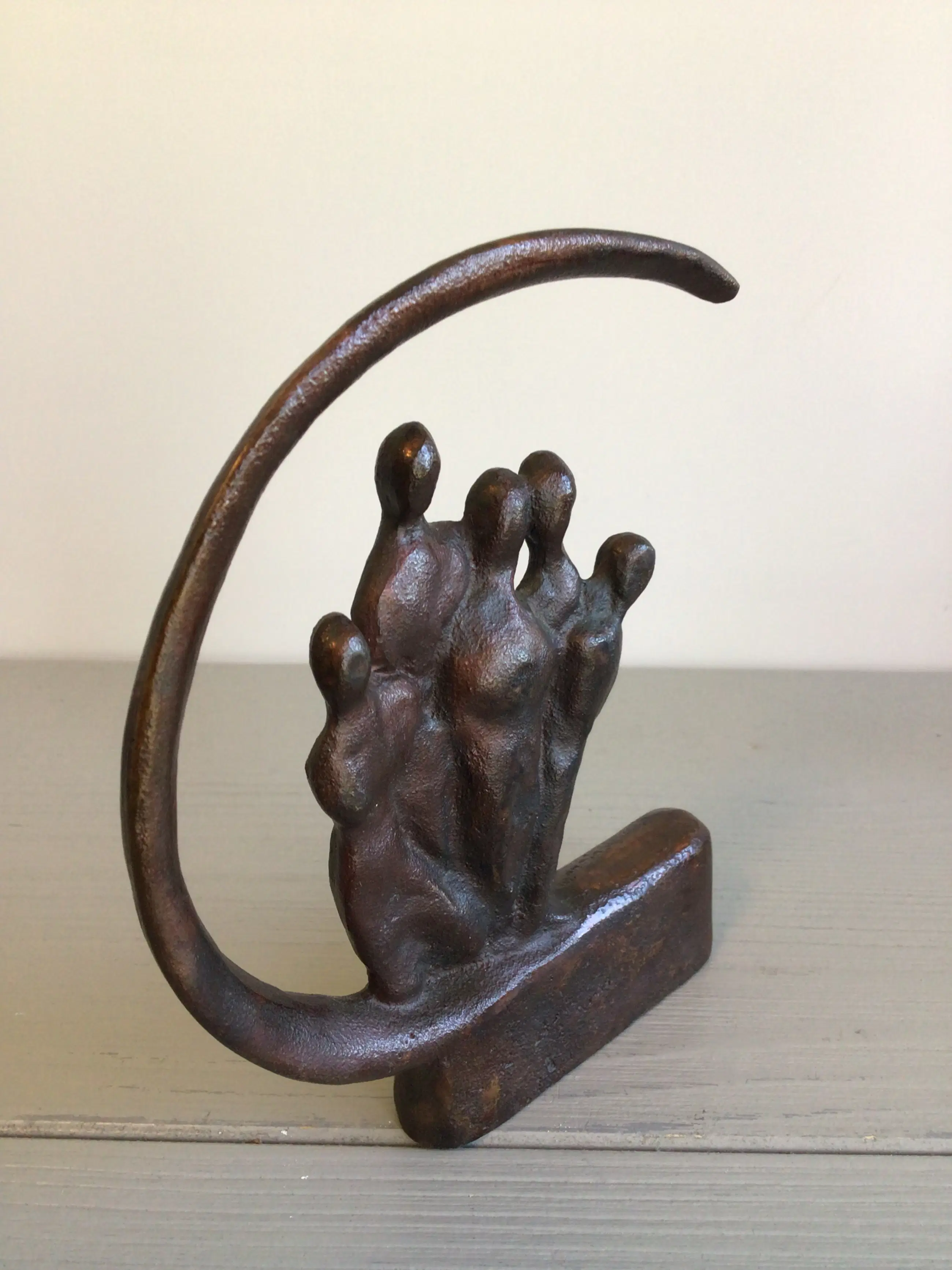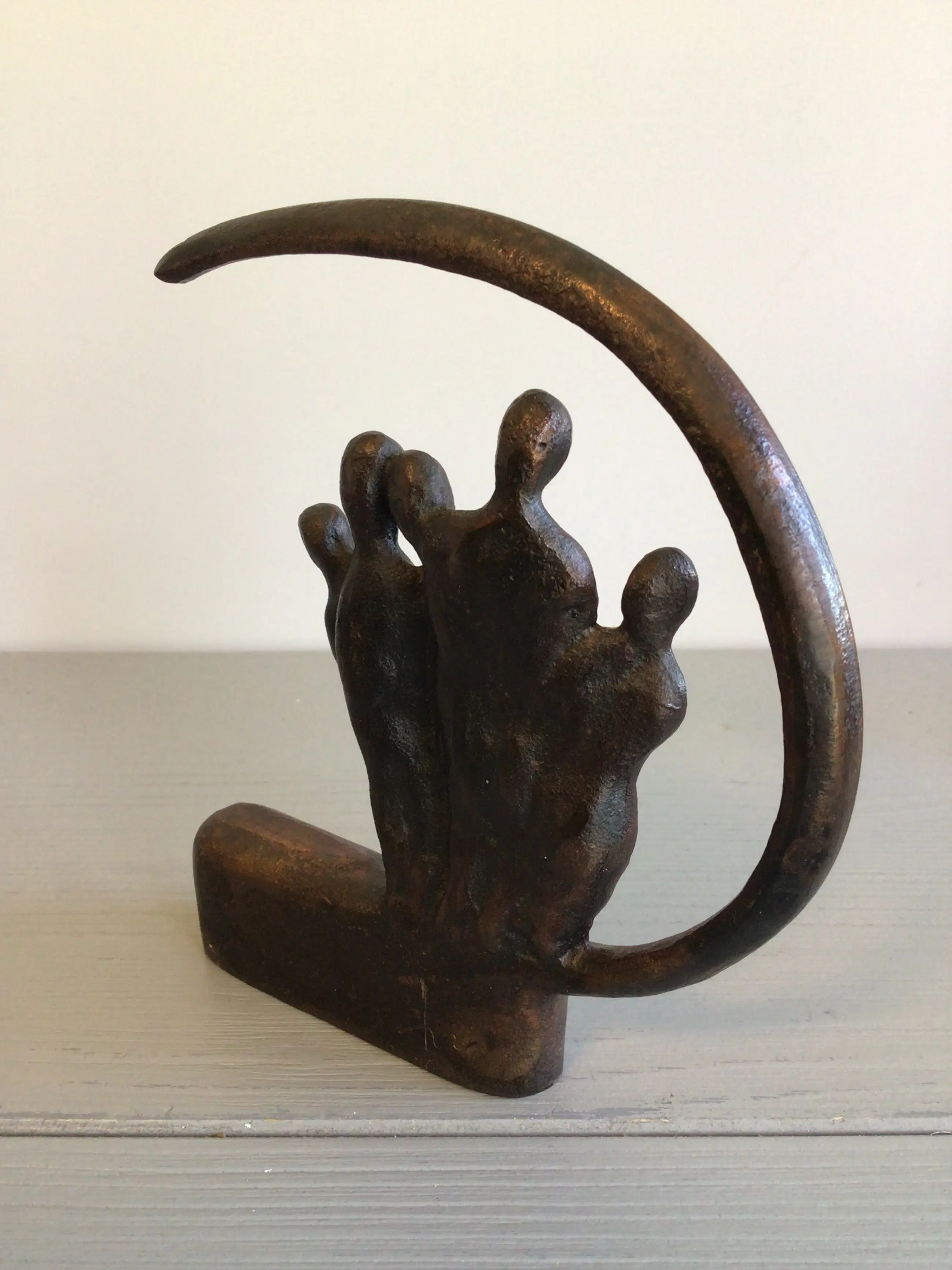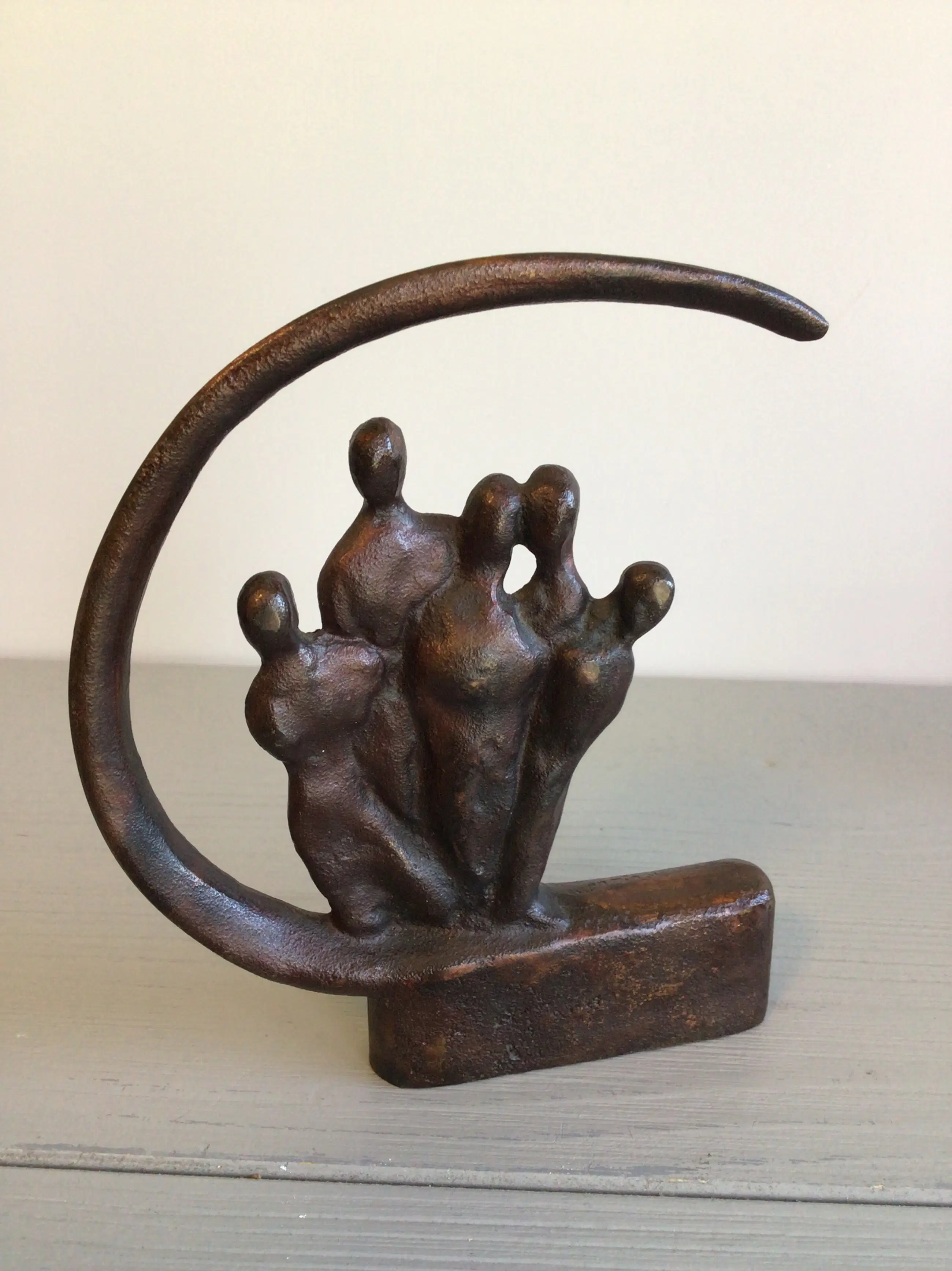 Zeer fraai vormgegeven en zeldzaam sculptuur van een vijftal mensfiguren die samen schuilen onder een halve cirkel, een vertederend tafereel Titel: “ Happy family “ Kunstenares: Diana Kortbeek Het beeld is gesigneerd op de achterzijde Diana Kortbeek was een kunstenares die altijd op zoek was naar de essentie en eenvoud van vormen, haar beelden zijn figuratief maar ook gestileerd met organische ronde vormen. Het beeld verkeert in zeer goede staat en wordt zorgvuldig verpakt verzonden.