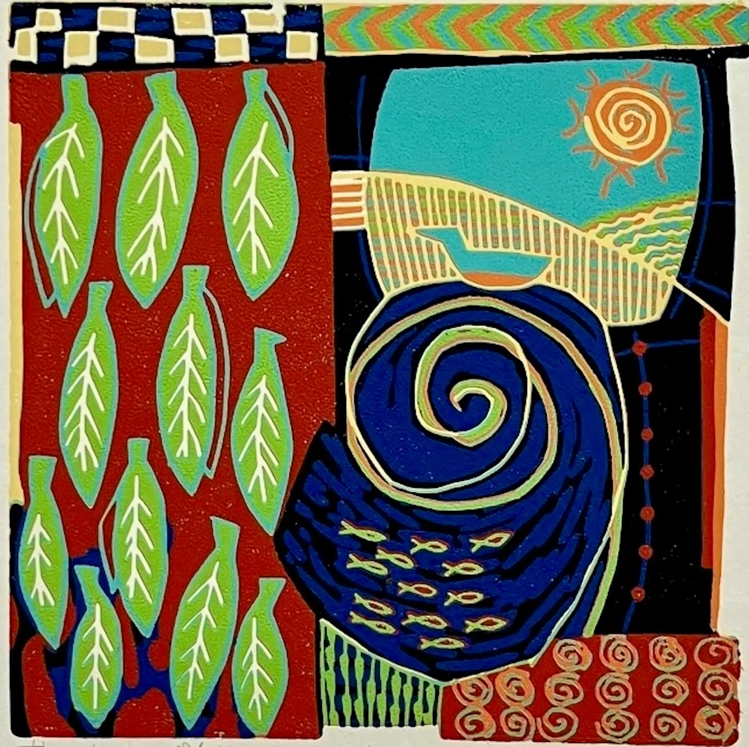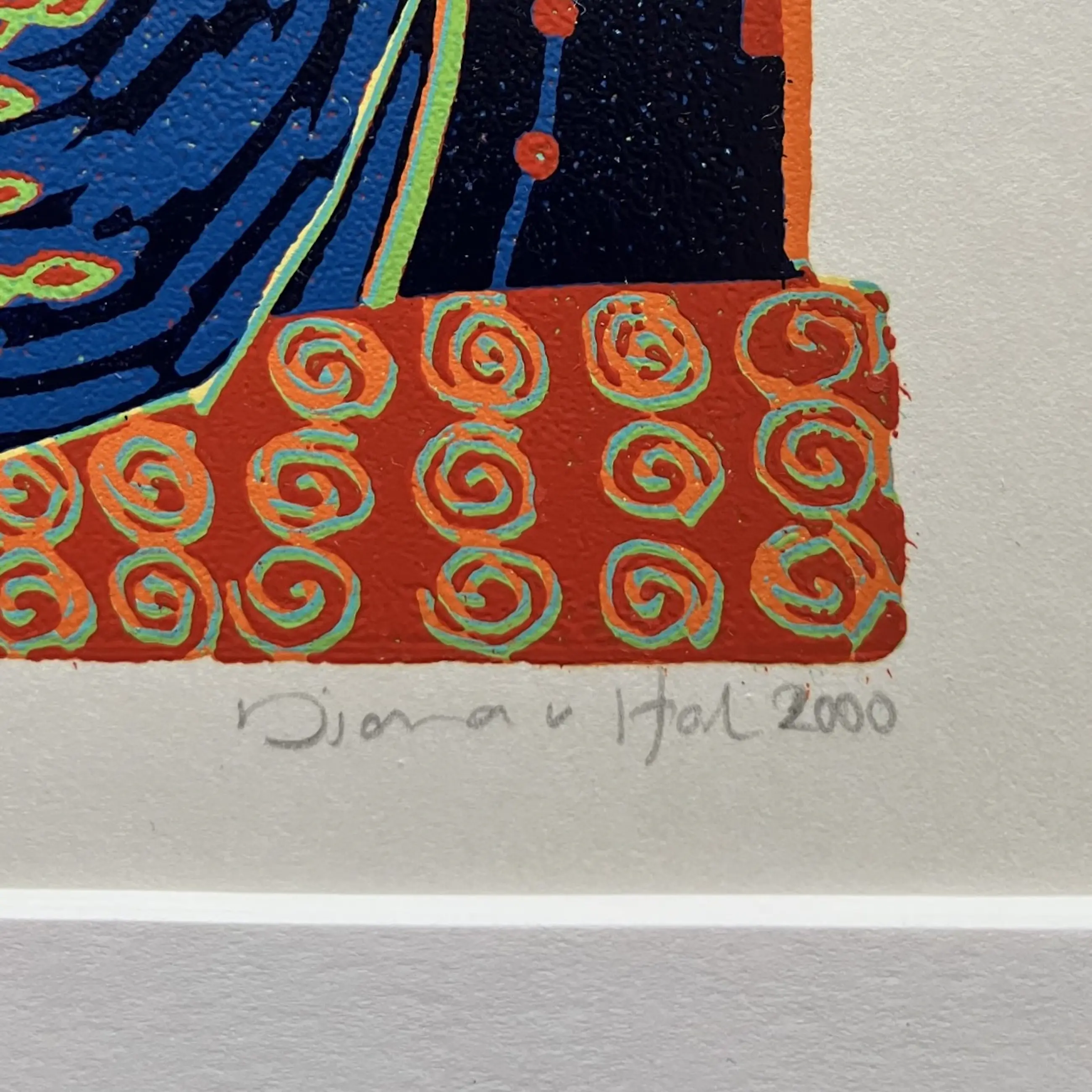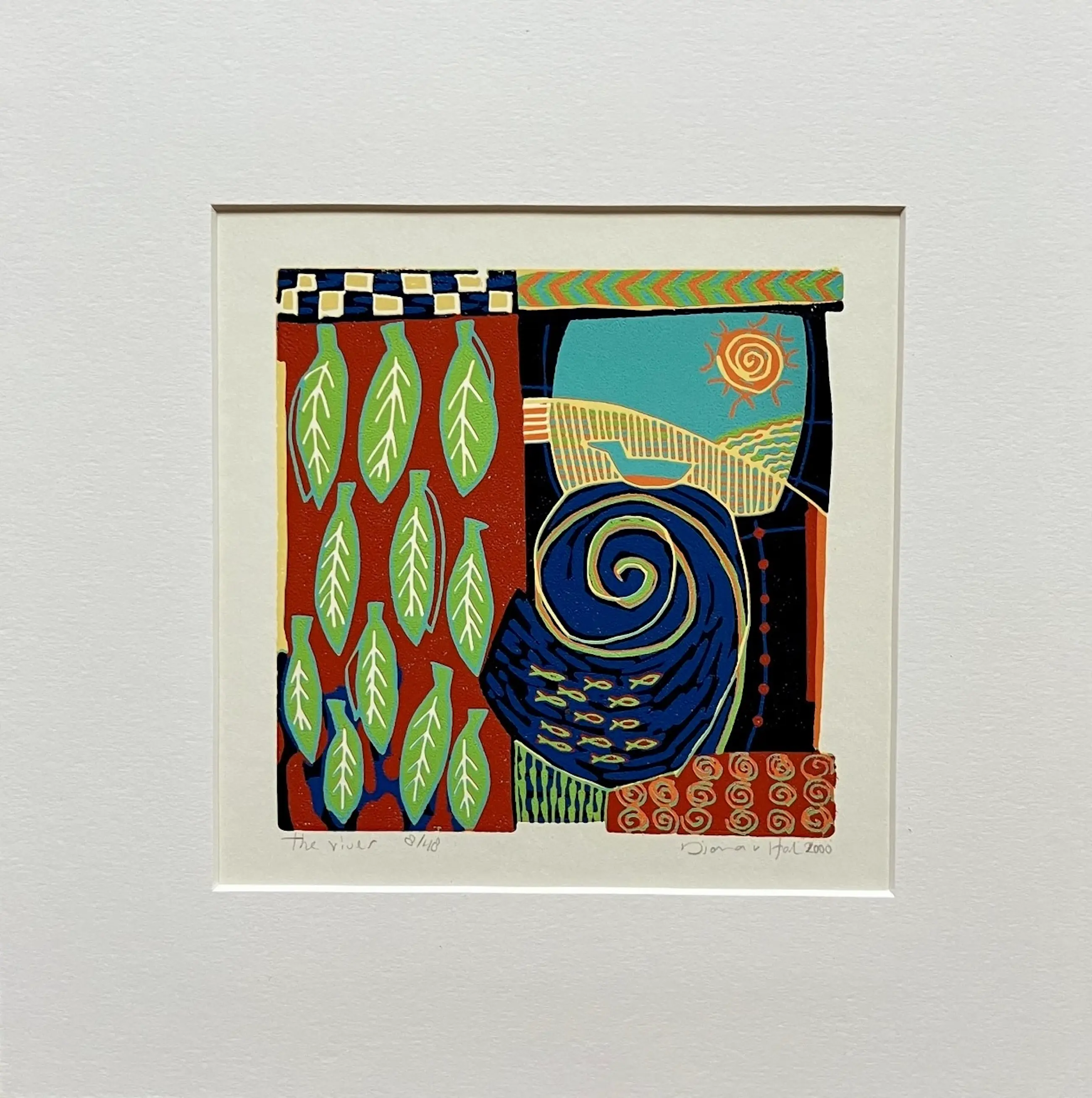Herkenbaar, mooi en verfijnd werk van Diana van Hal. Linosnede, nummer 8 uit een oplage van 48. De uitsparing in het passe-partout is 18 x 18 cm