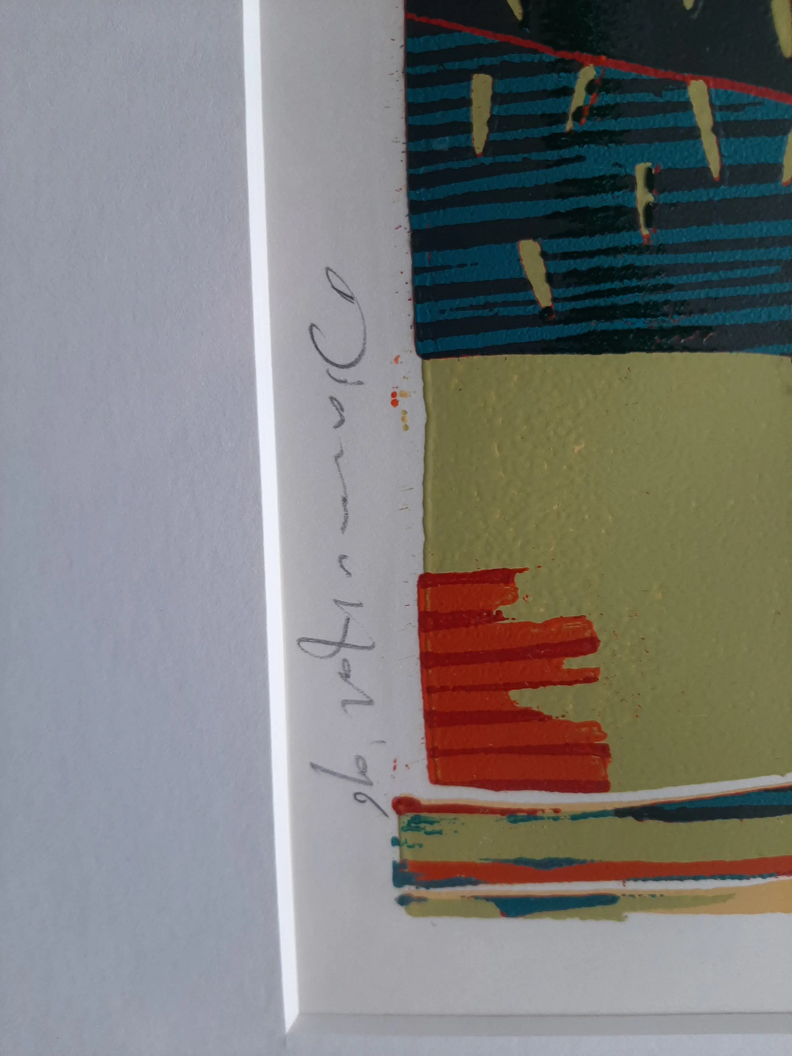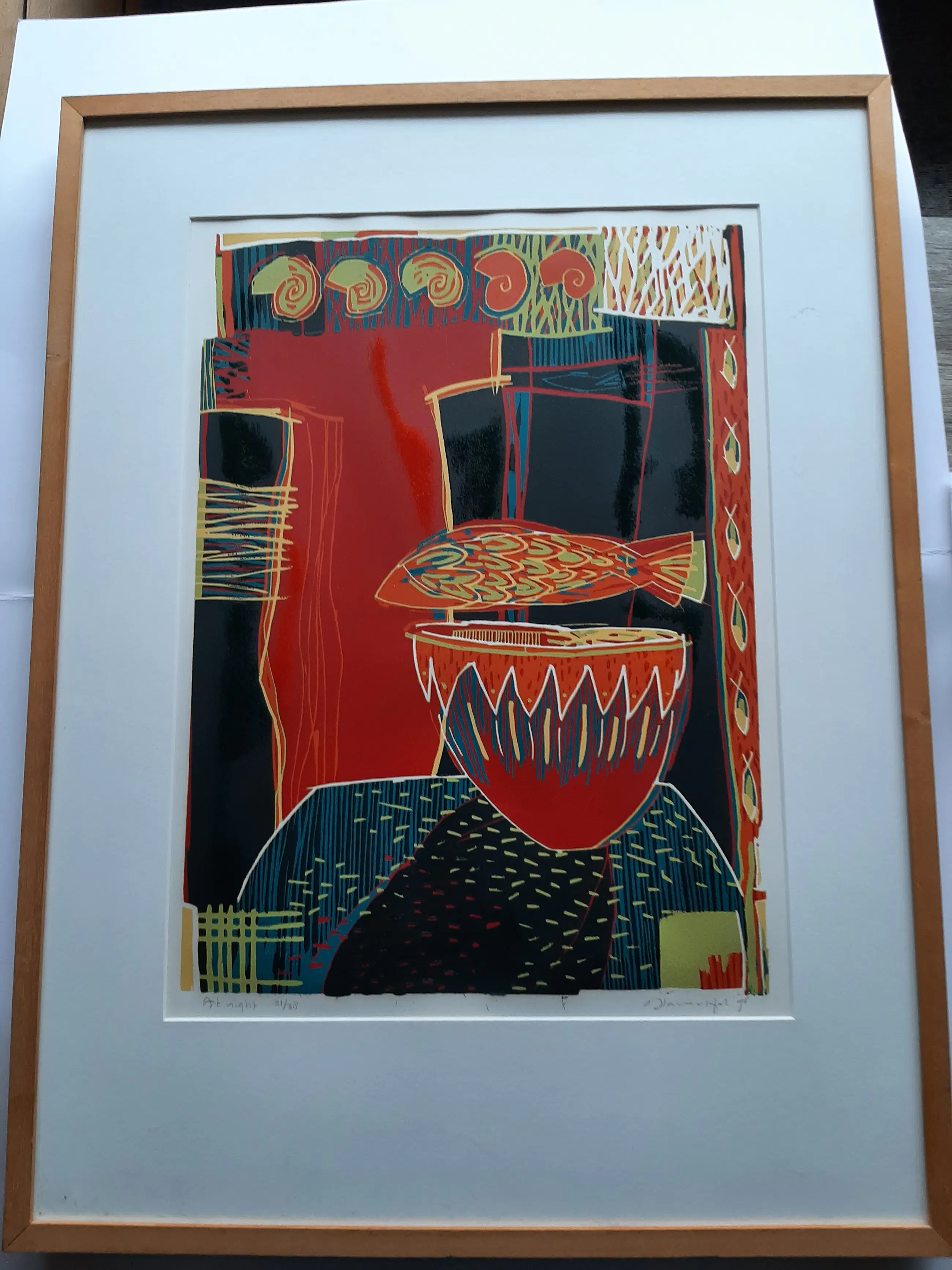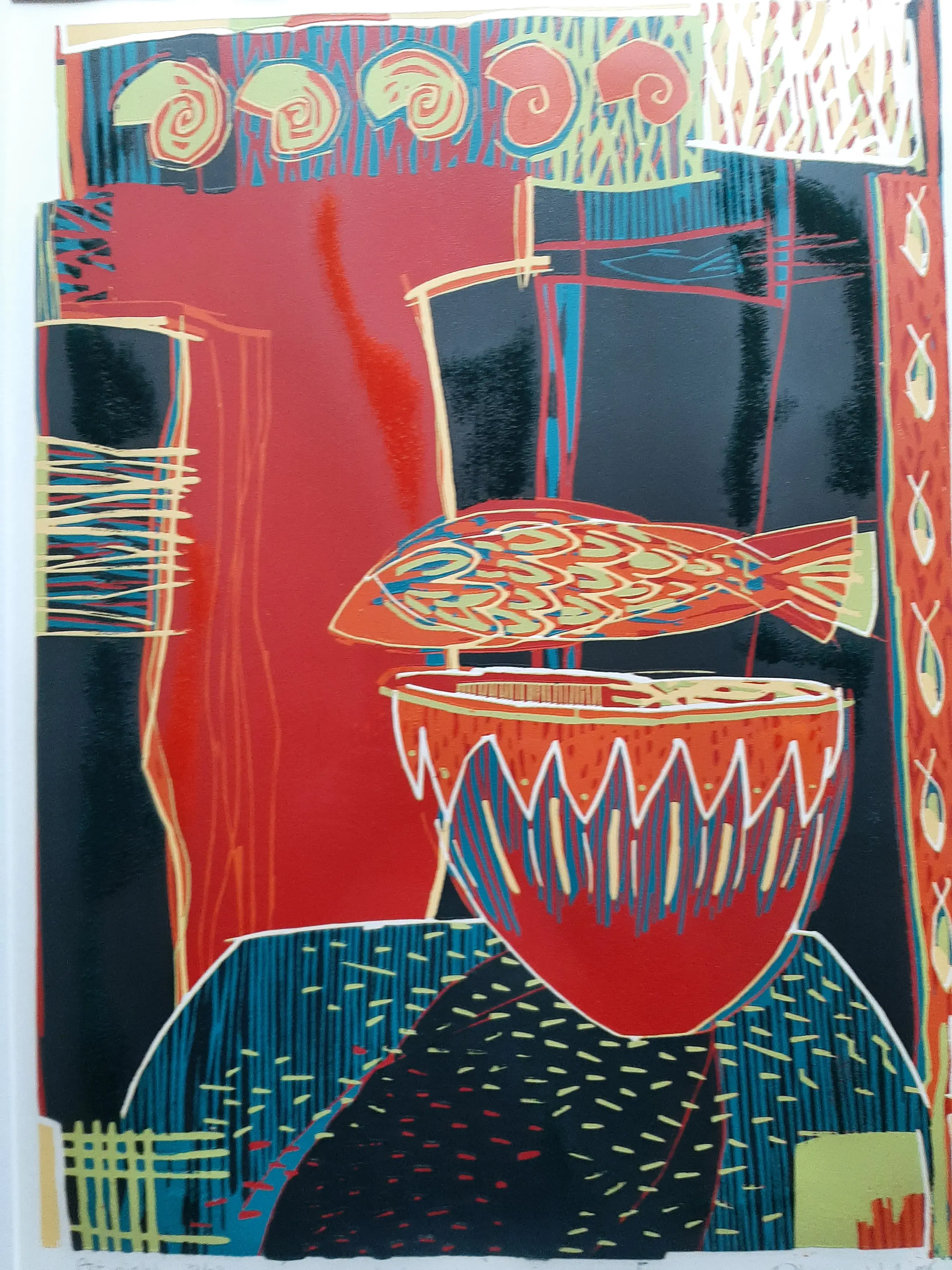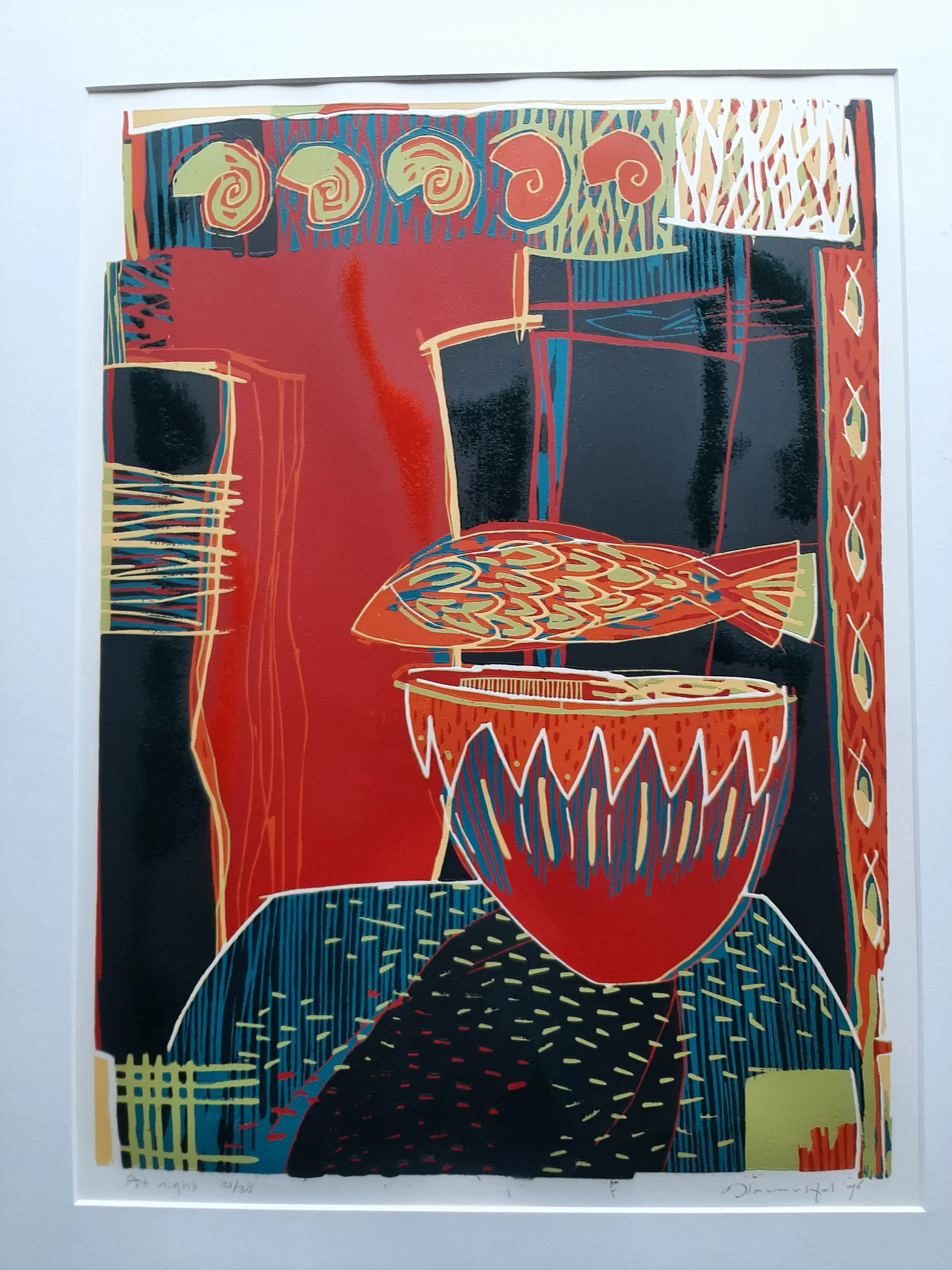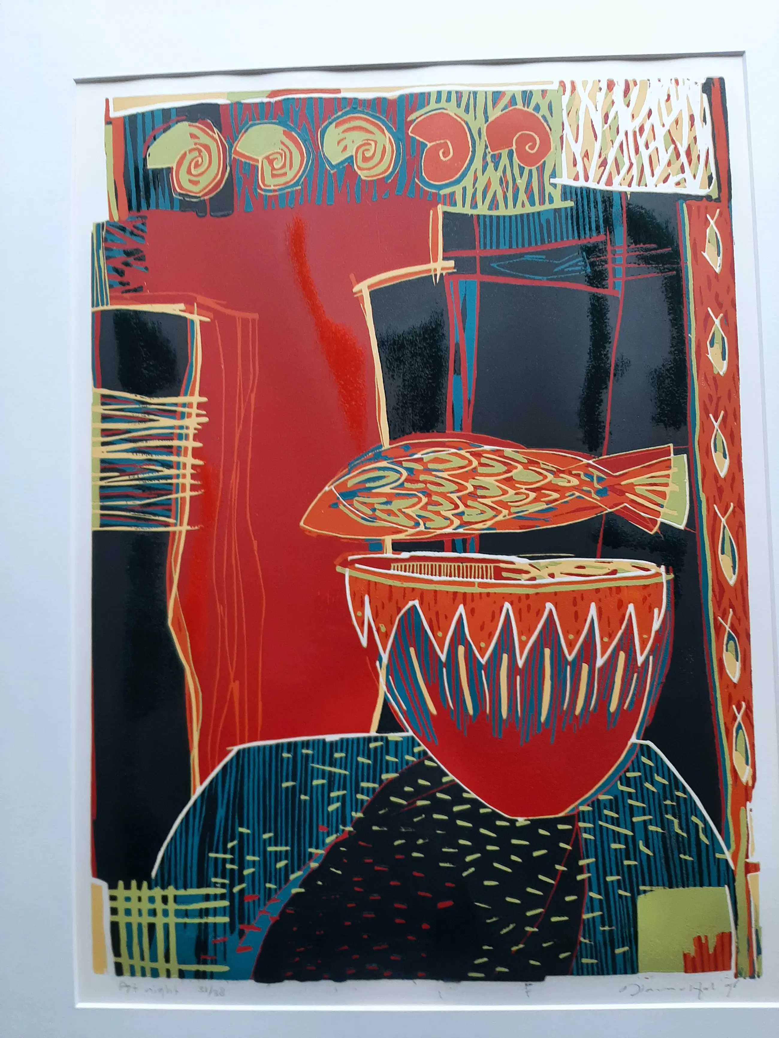 De Dordtse kunstenares Diana van Hal. (1954). Zij maakt linoleumsneden en schilderijen die getuigen van levensvreugde en verlangens oproepen naar verre oorden. In warme, stralende kleuren verhaalt haar werk van muziek en haar verre reizen naar West-Afrika, Cuba en onlangs Mexico.