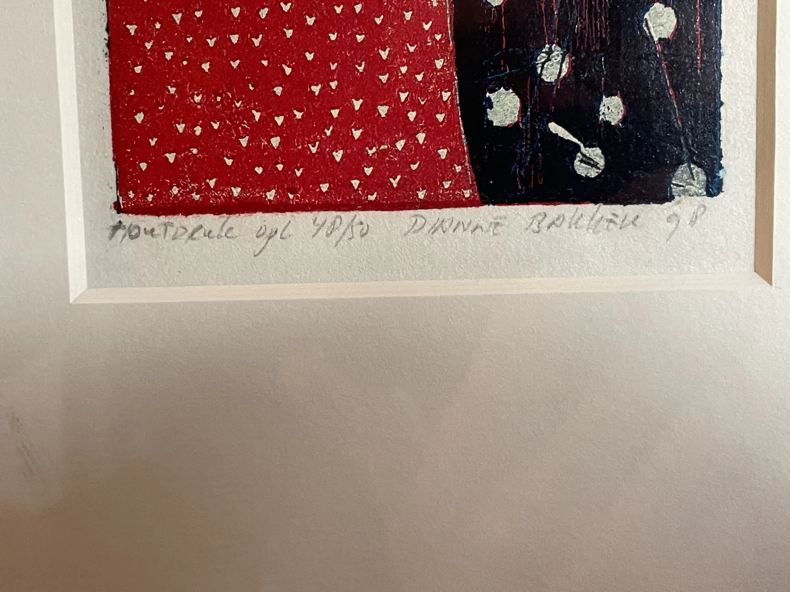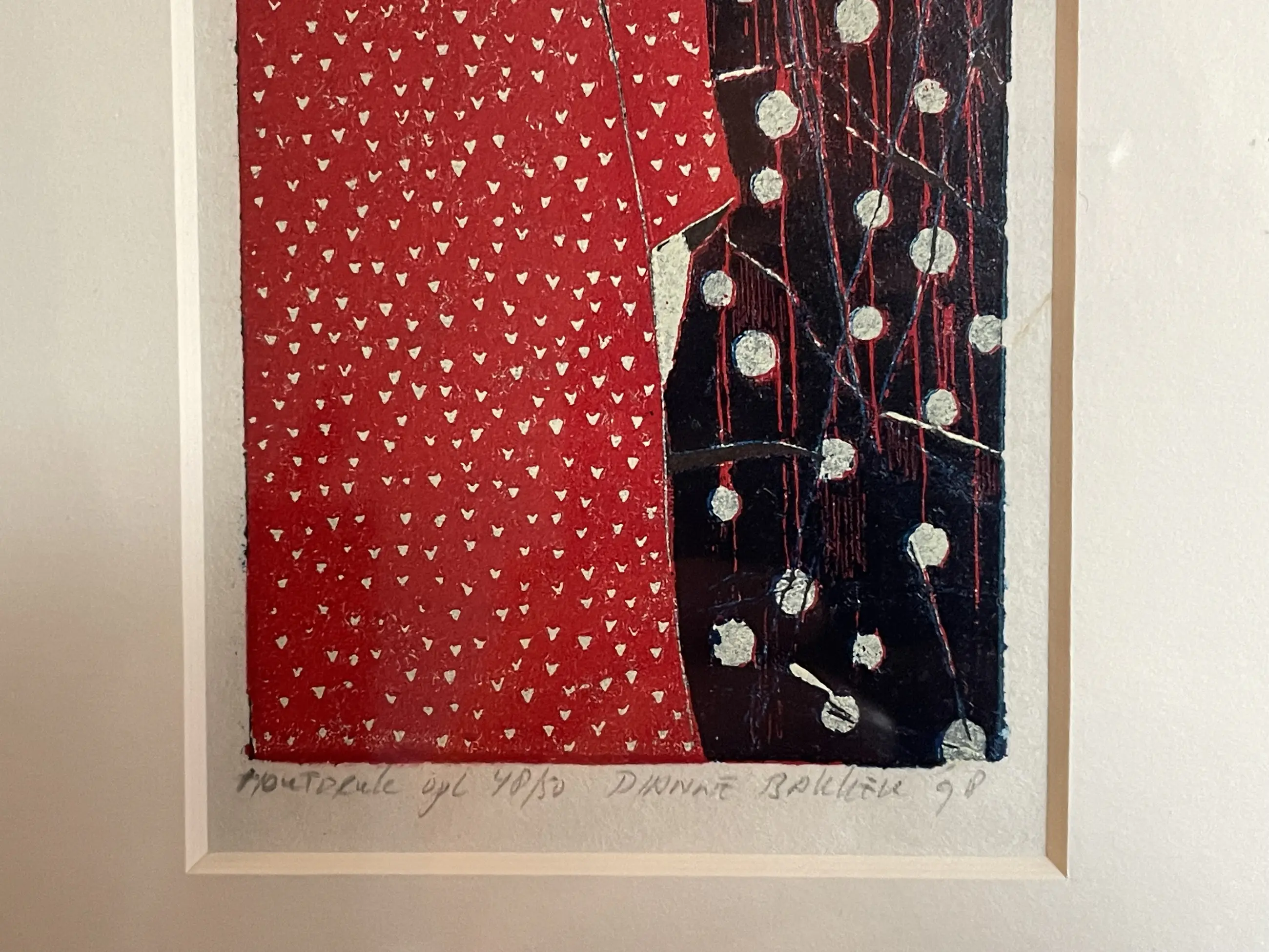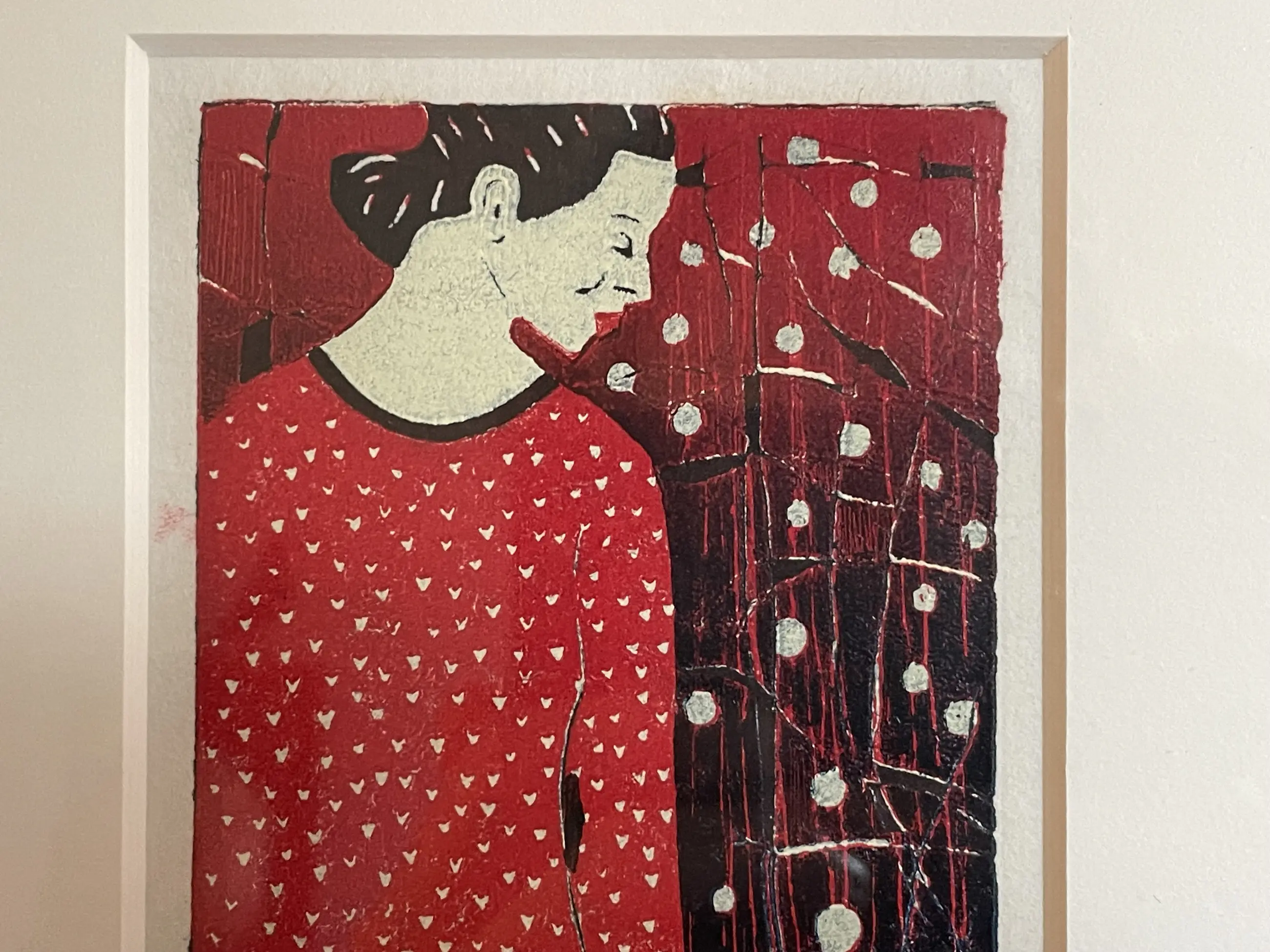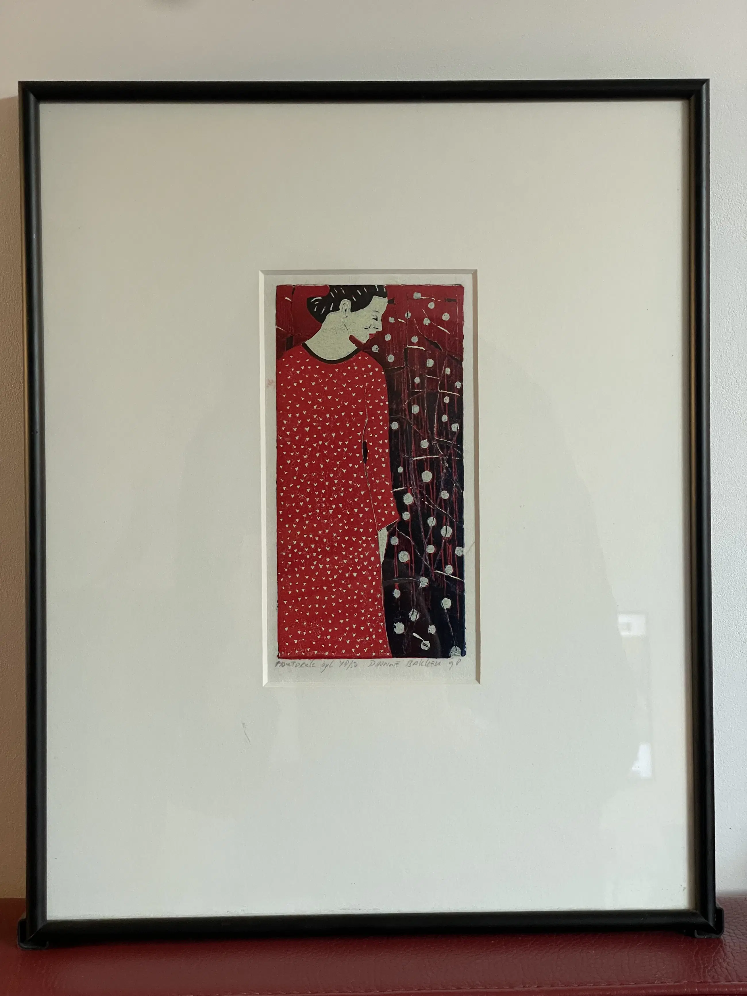 Een zeldzame vroege houtsnede van Dianne Bakker met een Vrouw in Kimono. Een werk dat typerend is voor haar vroegere periode waarin veel inspiratie is verwerkt uit Oosterse culturen.