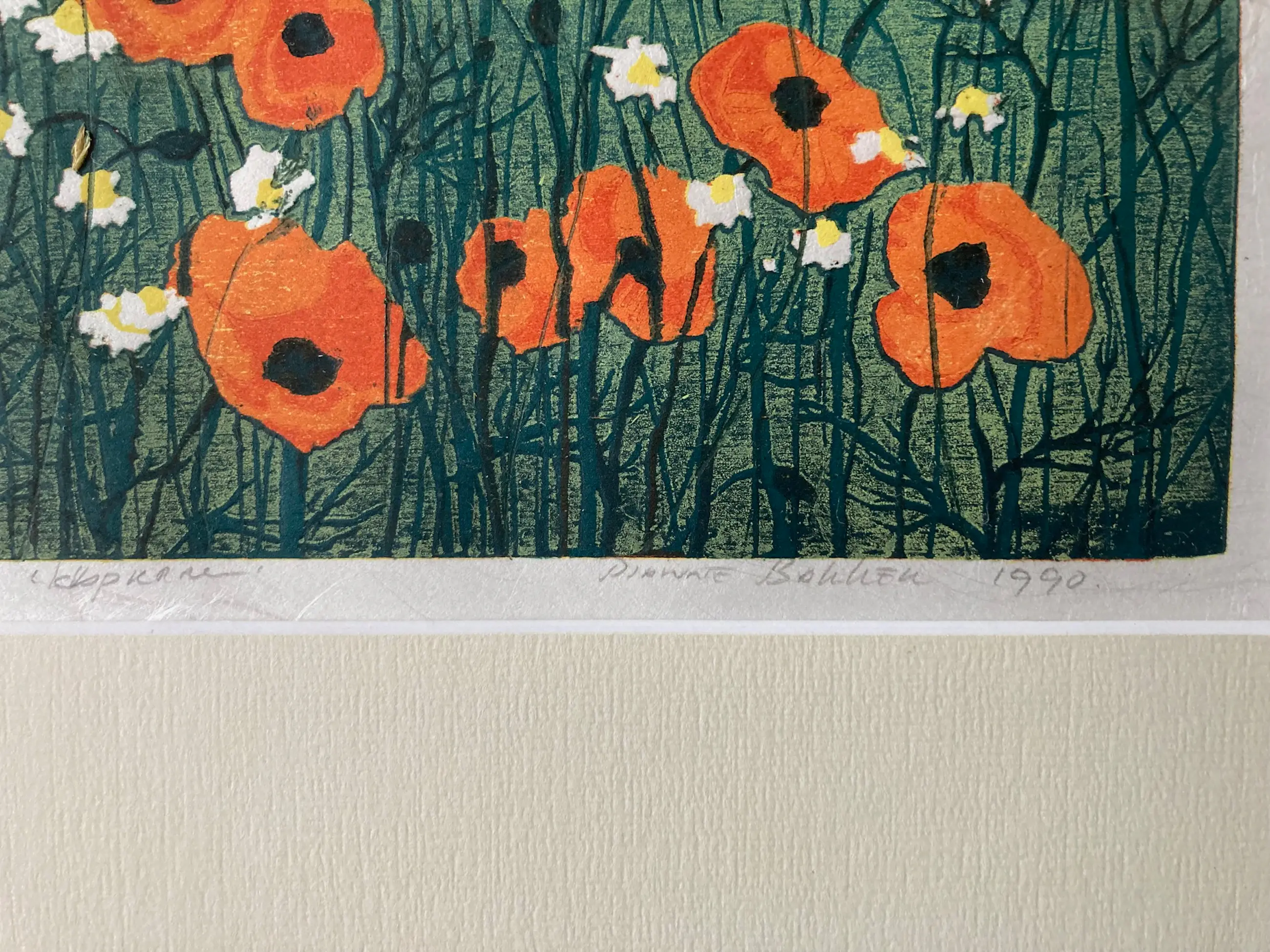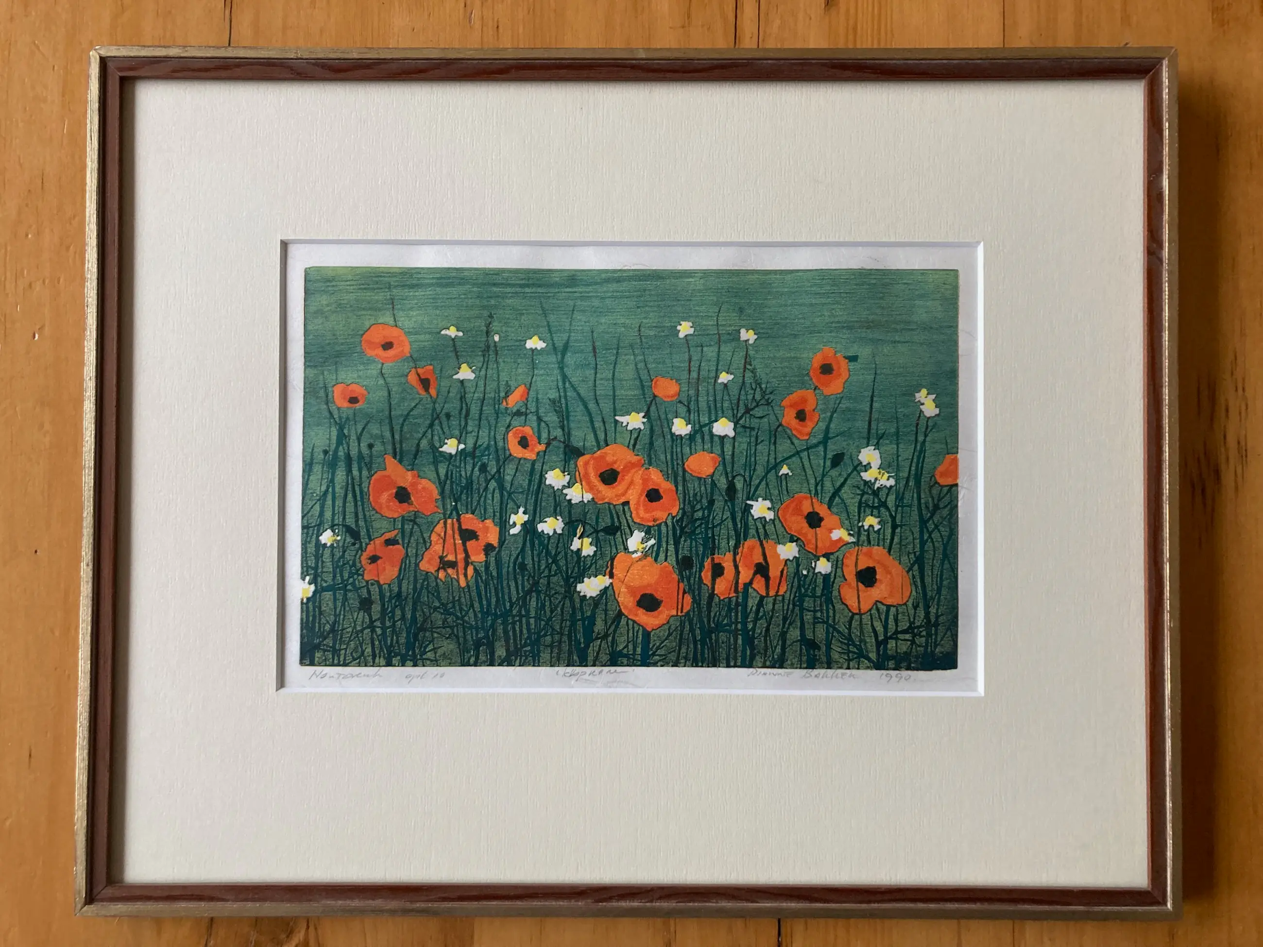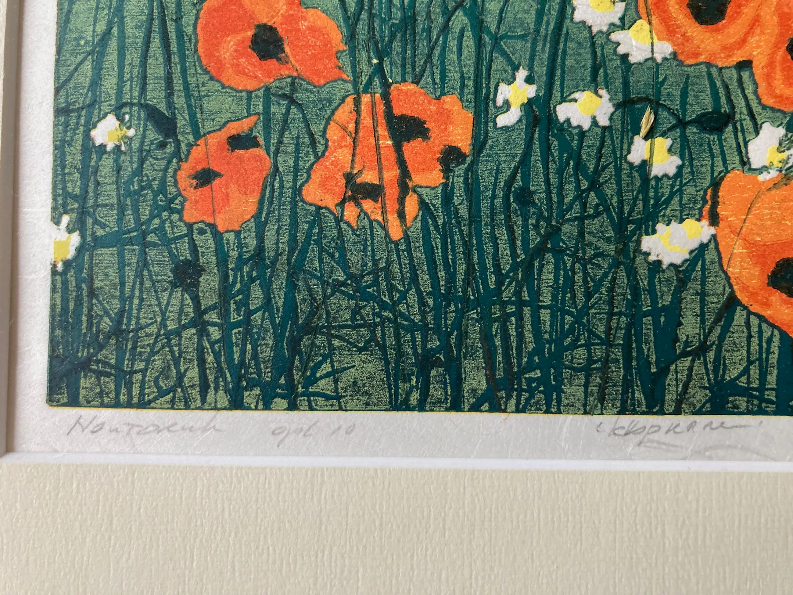 Kleurige litho met een afbeelding van een groen veld met klaprozen en witte bloemen (margrieten). Het werk is van bescheiden afmeting zodat er al snel een mooi plekje voor te vinden valt.