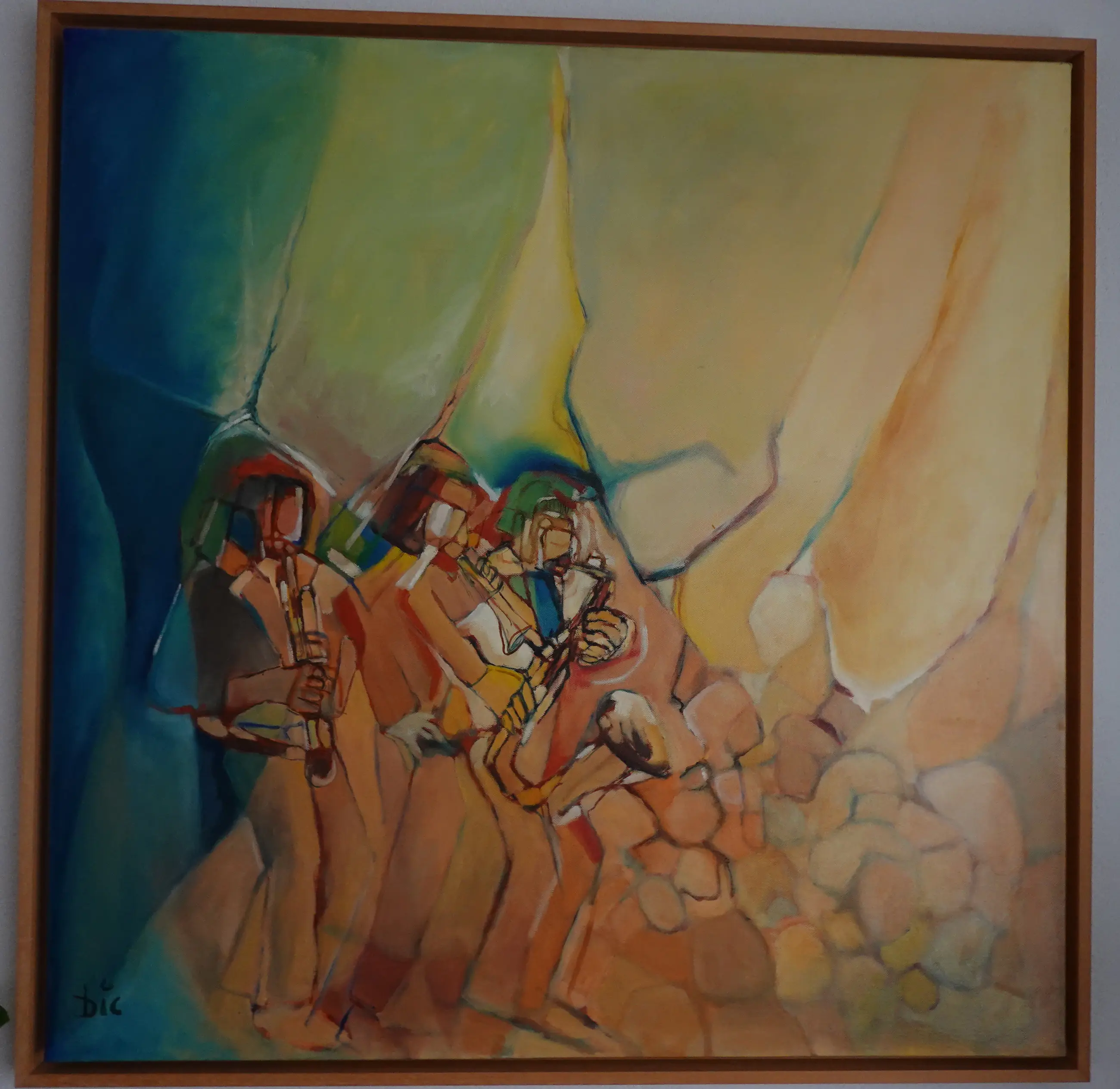 Dic Zandbergen werkt en schildert vlakbij Alicante (Spanje). Hij zet een mens in zijn alledaagse omgeving centraal. Zo ook dit muziekgezelschap. De Spaanse kleuren maken het tot een mooi geheel.