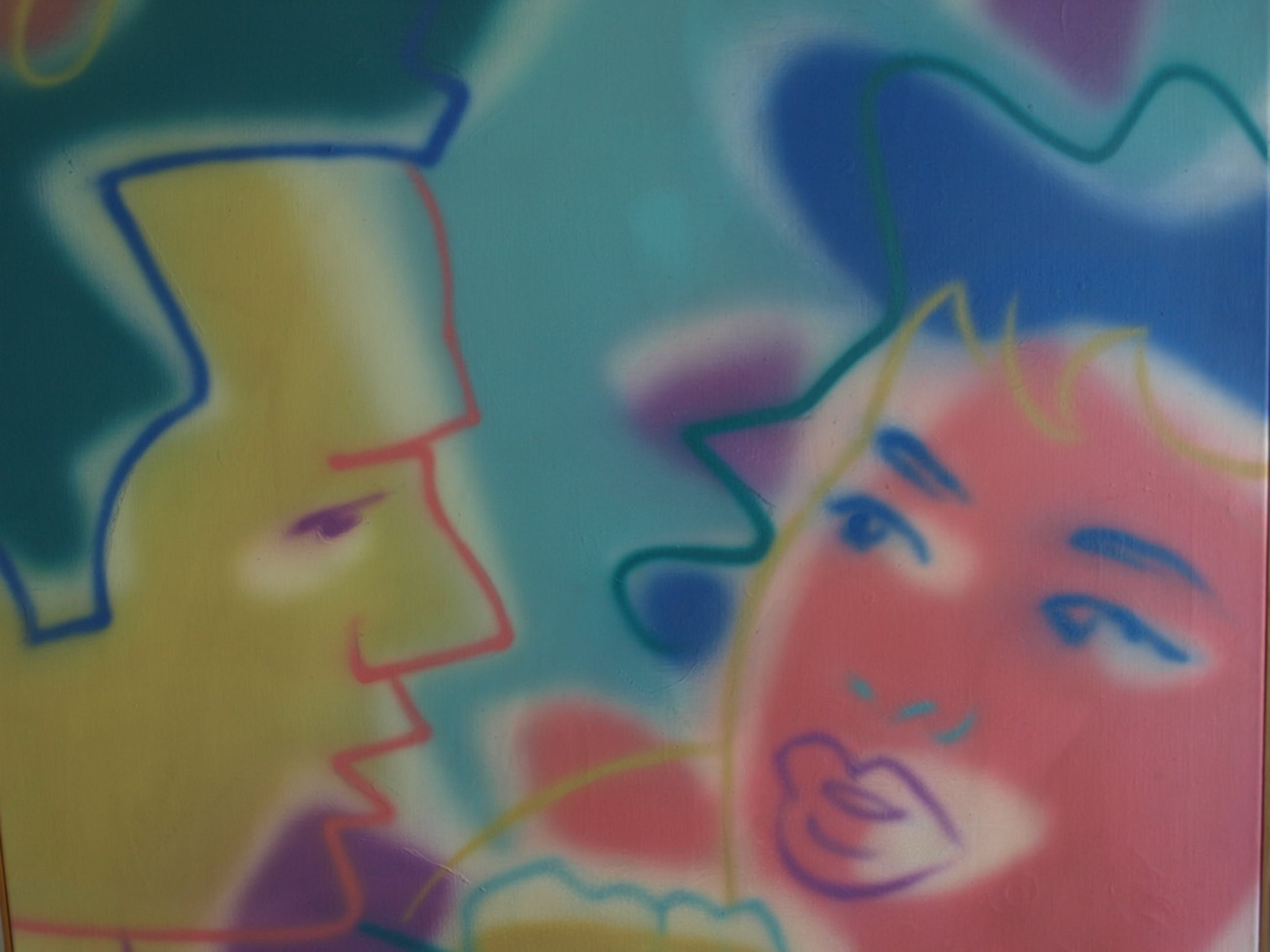 Techniek: spuitbusverf op linnen, gespannen op een houten raam en ingelijst met ‘expositielatjes’.