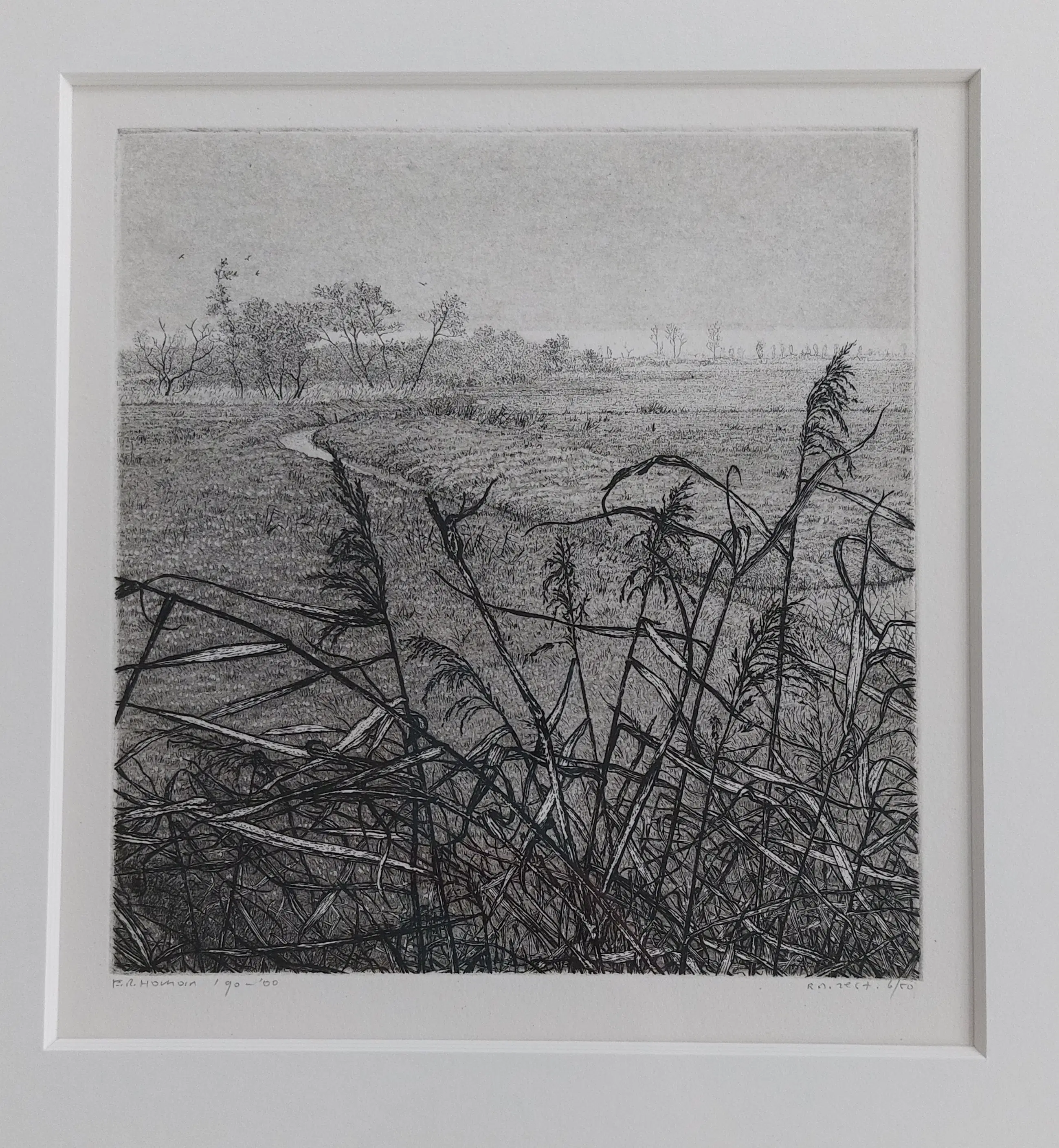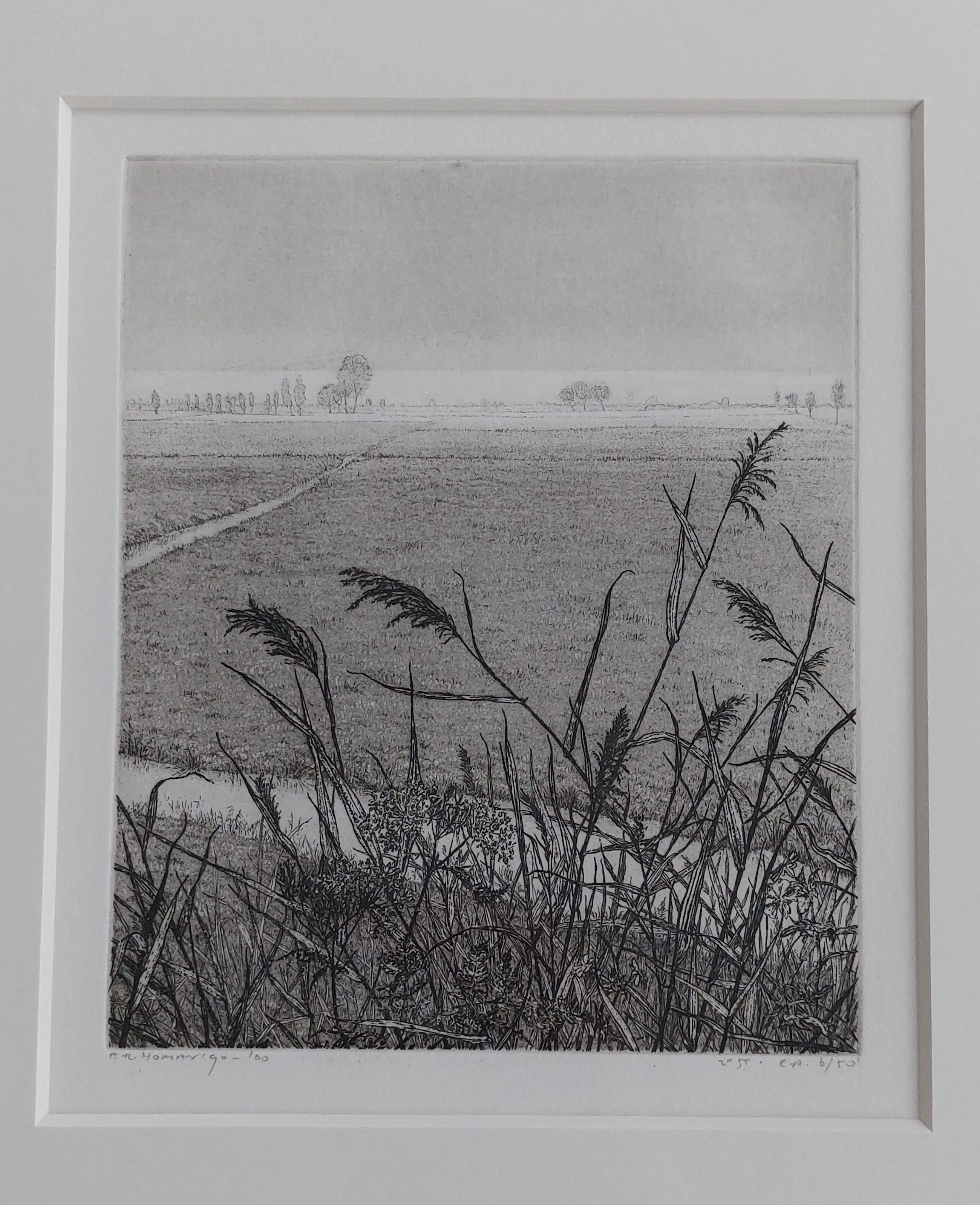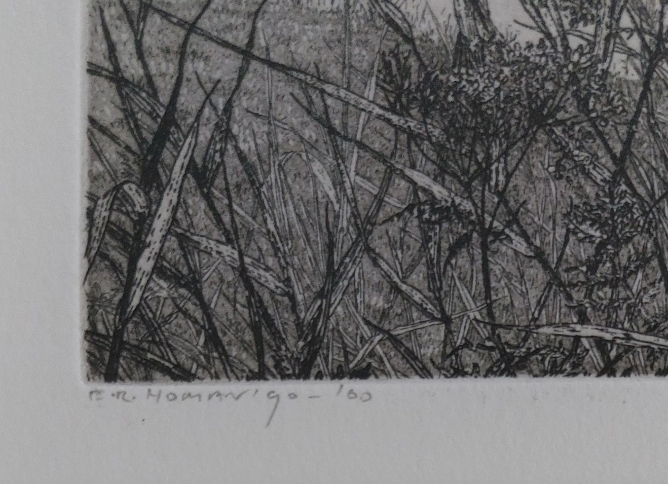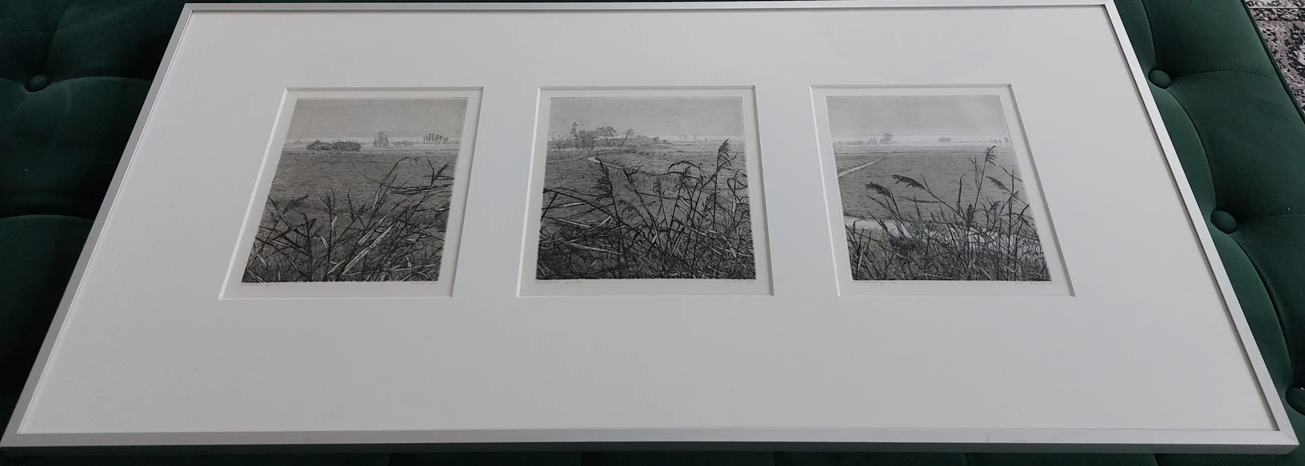Drie verfijnde landschapsetsen van Reinder Homan in een luxe Barth lijst die samen een drieluik vormen van een Nederlands natuurlandschap. In zeer goede staat. Alle drie zijn in potlood gesigneerd en genummerd.