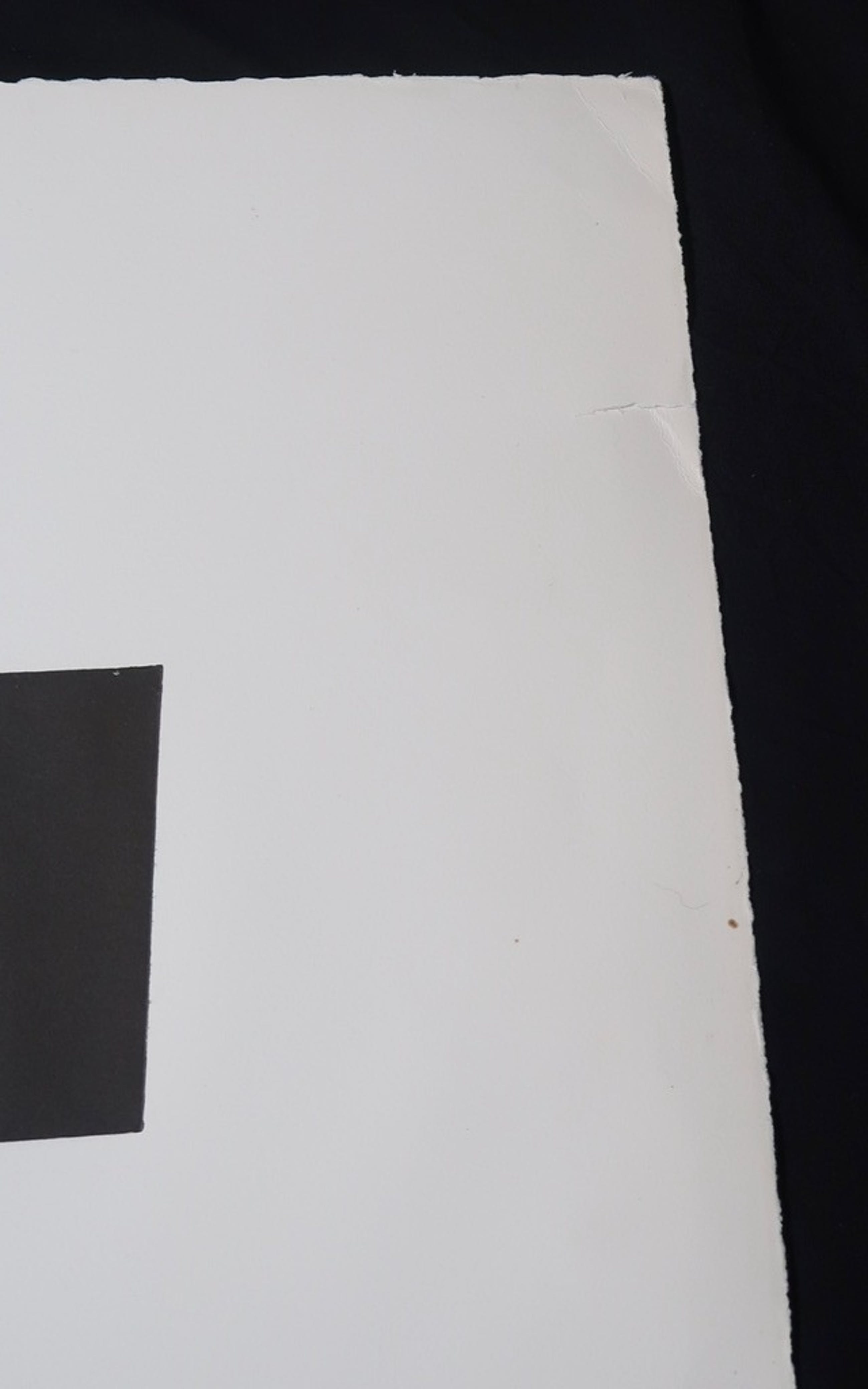 Conditie: In goede staat, maar een scheurtje in de rechterrand, met kreuklijnen langs de randen waaronder 1 van rechtsmidden naar middenonder en 1 van rechtsmidden naar rechtsonder. In de hoek linksonder schade aan het blad door een stickertje dat daar heeft gezeten. Wat vergeling langs de randen van het blad en enkele oxidatiestipjes in het blad. Net onder het beeld een vlekje (zie foto's).