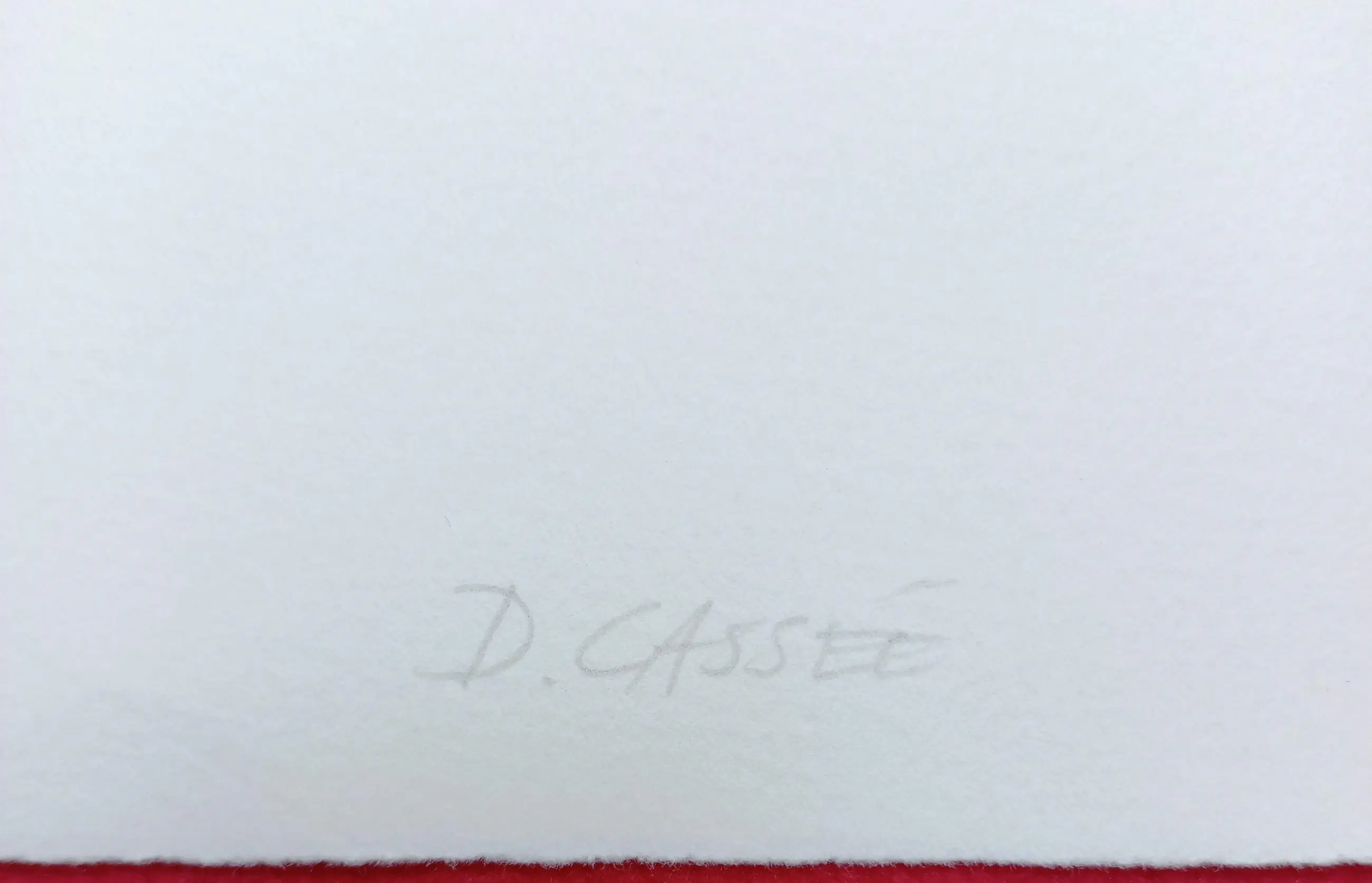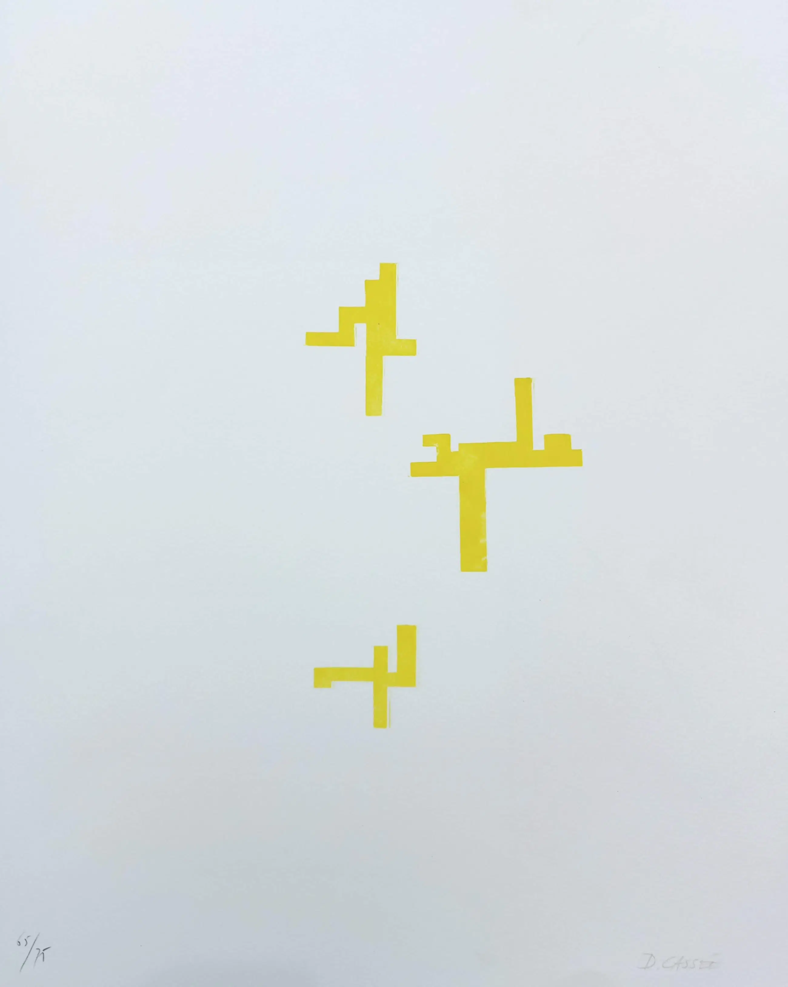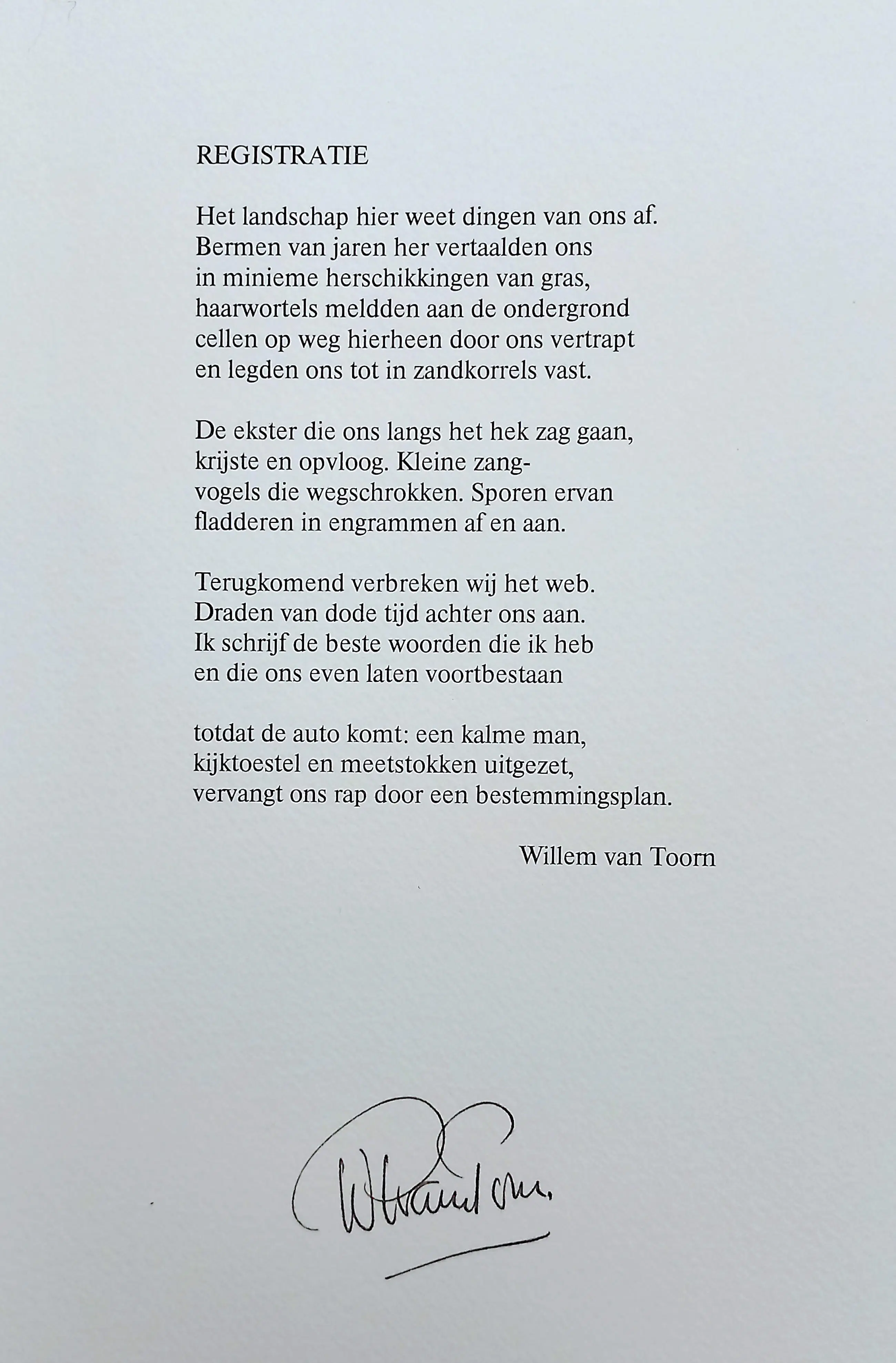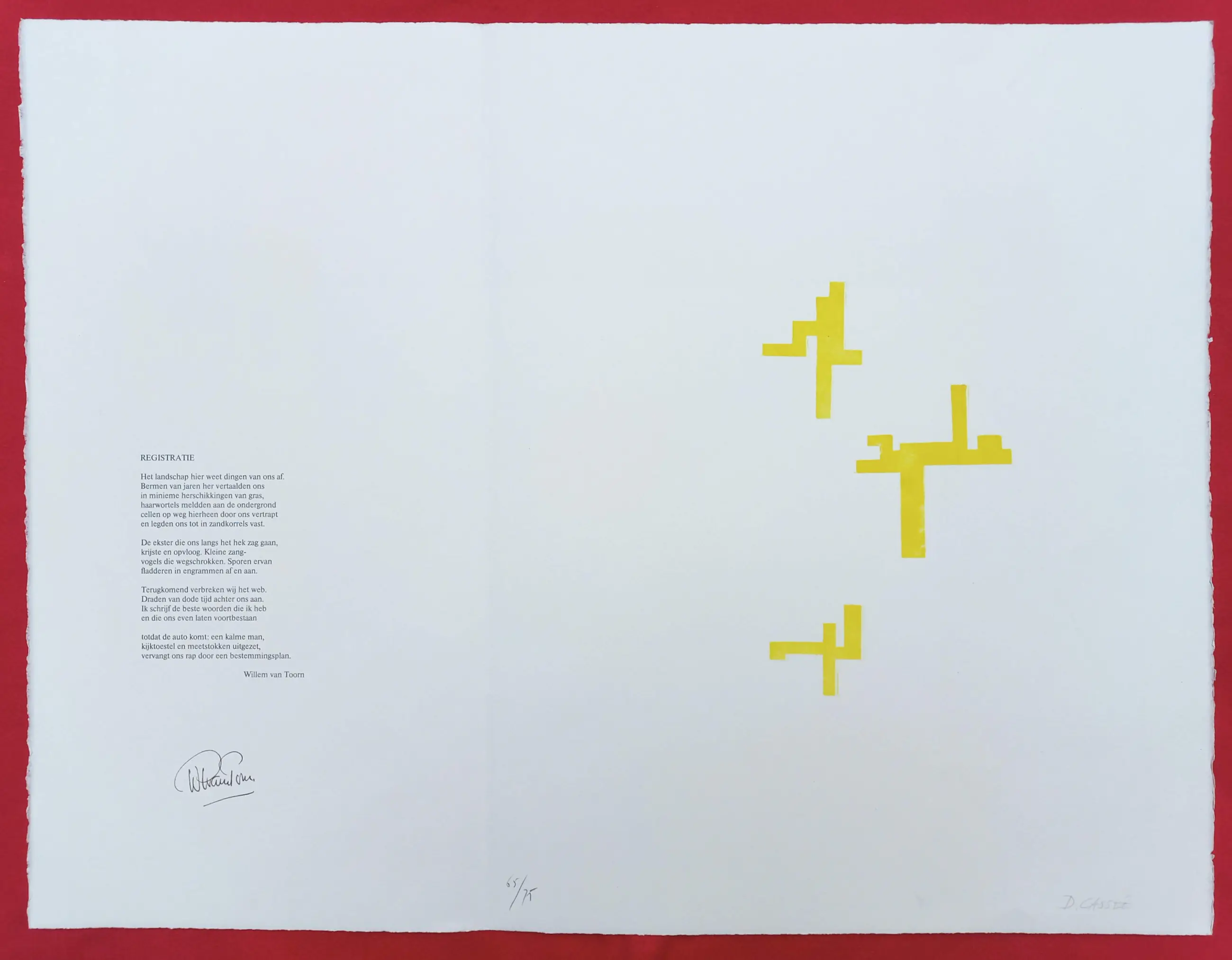 Mooie, strakke compositie van Dick Cassee, met begeleidend gedicht van Willem van Toorn (of omgekeerd afhankelijk van uw voorkeur). Tweekleuren aluminiumdruk op Arches papier, met potlood gesigneerd en genummerd (65/75). Gedicht op linker blad in indische inkt gesigneerd door Van Toorn. In mint conditie, standaard met vouw in blad (tussen voorstelling en gedicht) zoals uitgegeven.