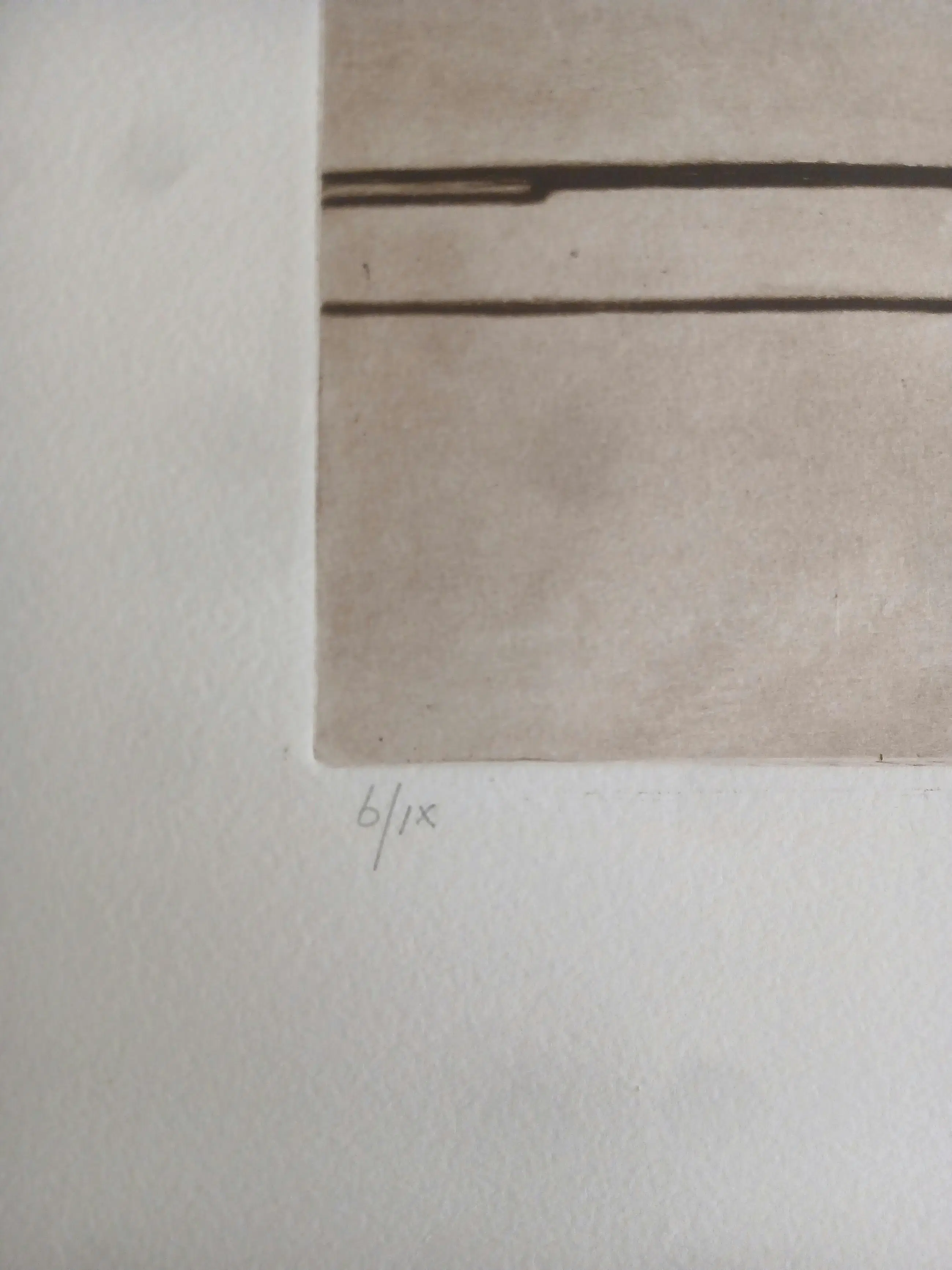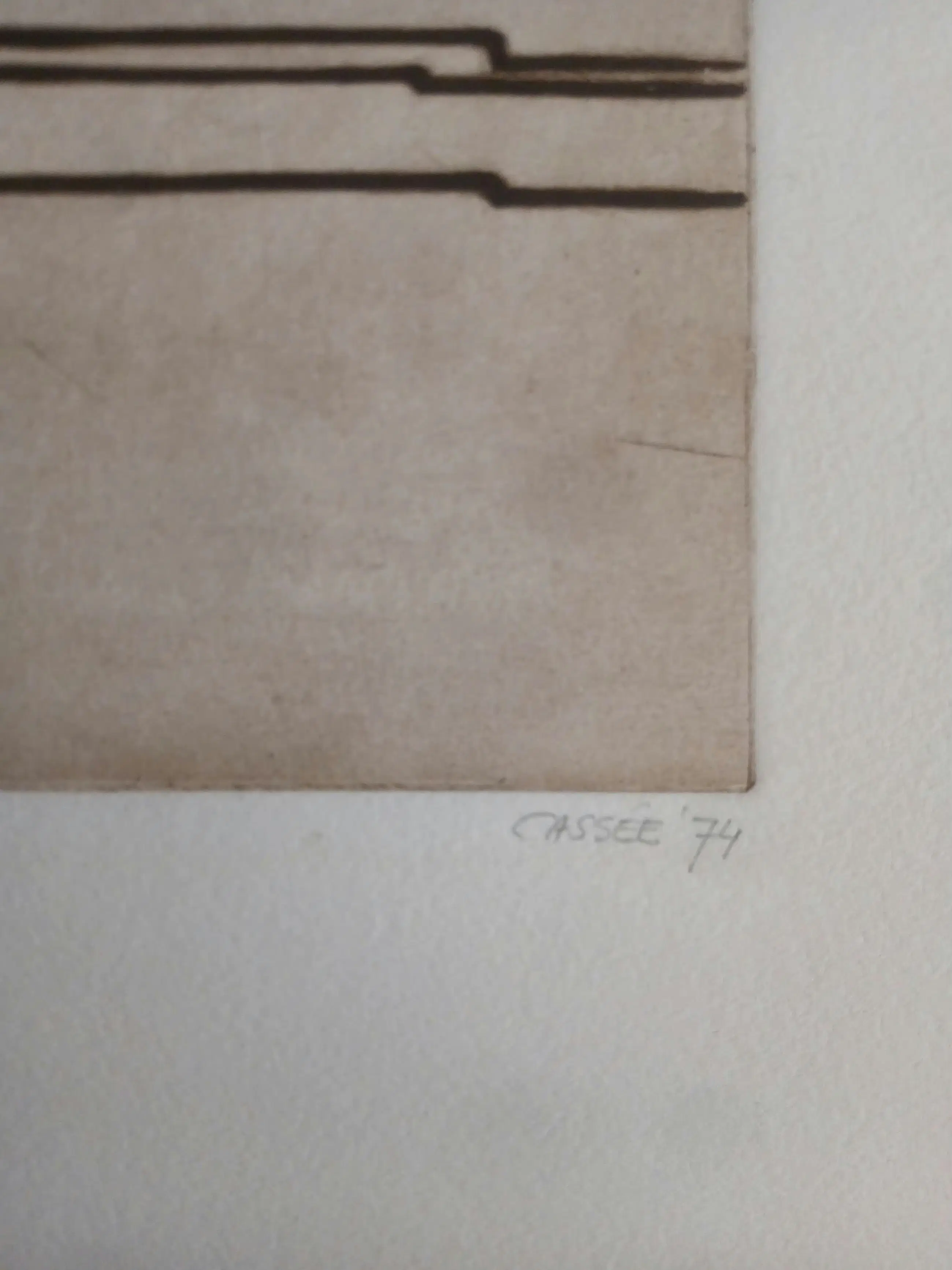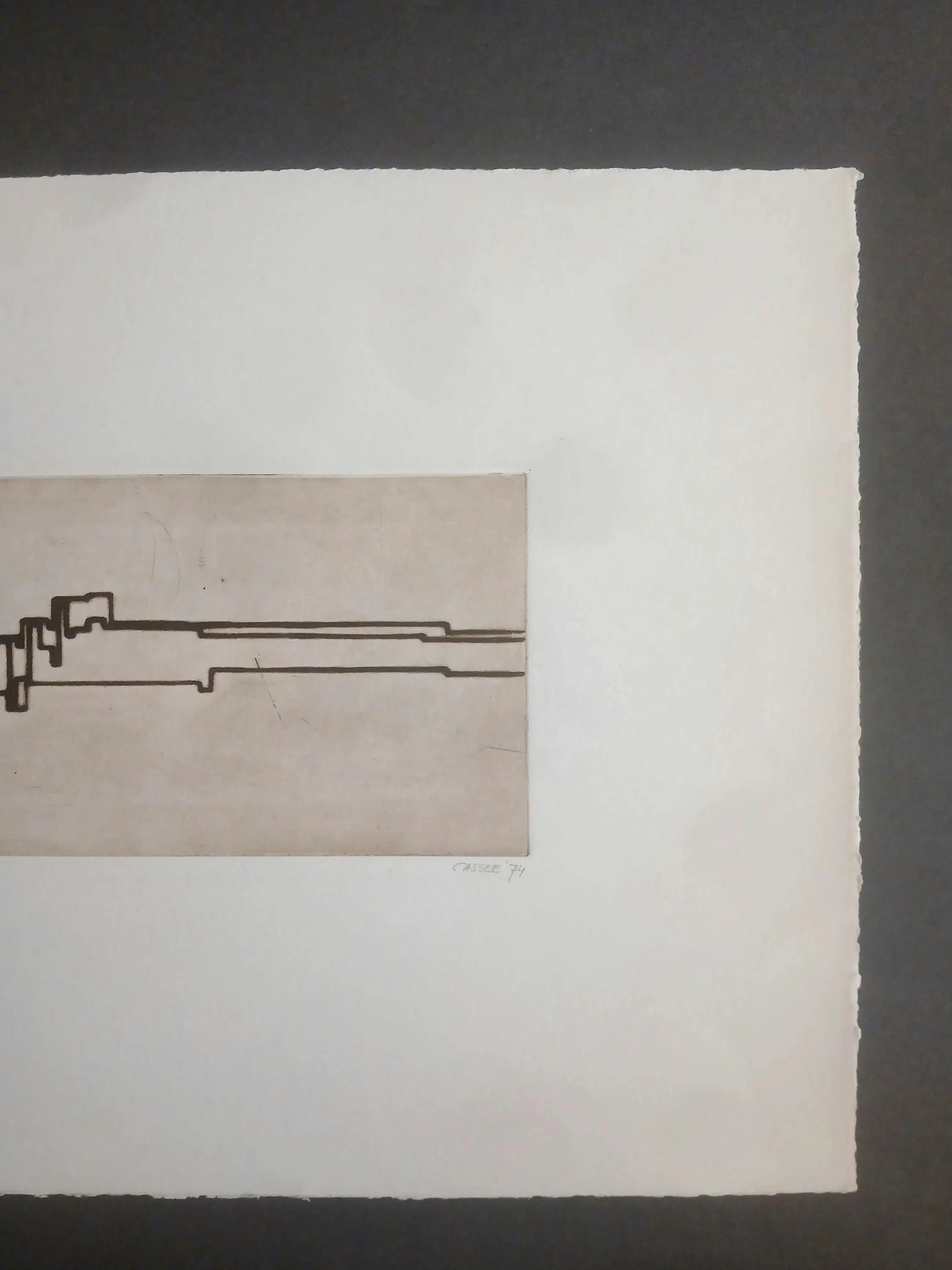 Een heel fraai werk van Dick Cassee. Vervaardigd in 1974 Oplage enigszins onduidelijk. Er staat : 6/1X Handgesigneerd rechts onder In het midden onder de titel " Saumane". Het werk zelf meet 14,5 cm hoog En 33,5 cm breed. Het handgeschepte papier meet: 38 x 57 cm. Het werk verkeerd in zeer goede staat. Het werk wordt goed en veilig verpakt en verstuurd.